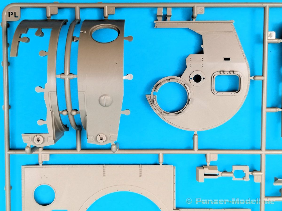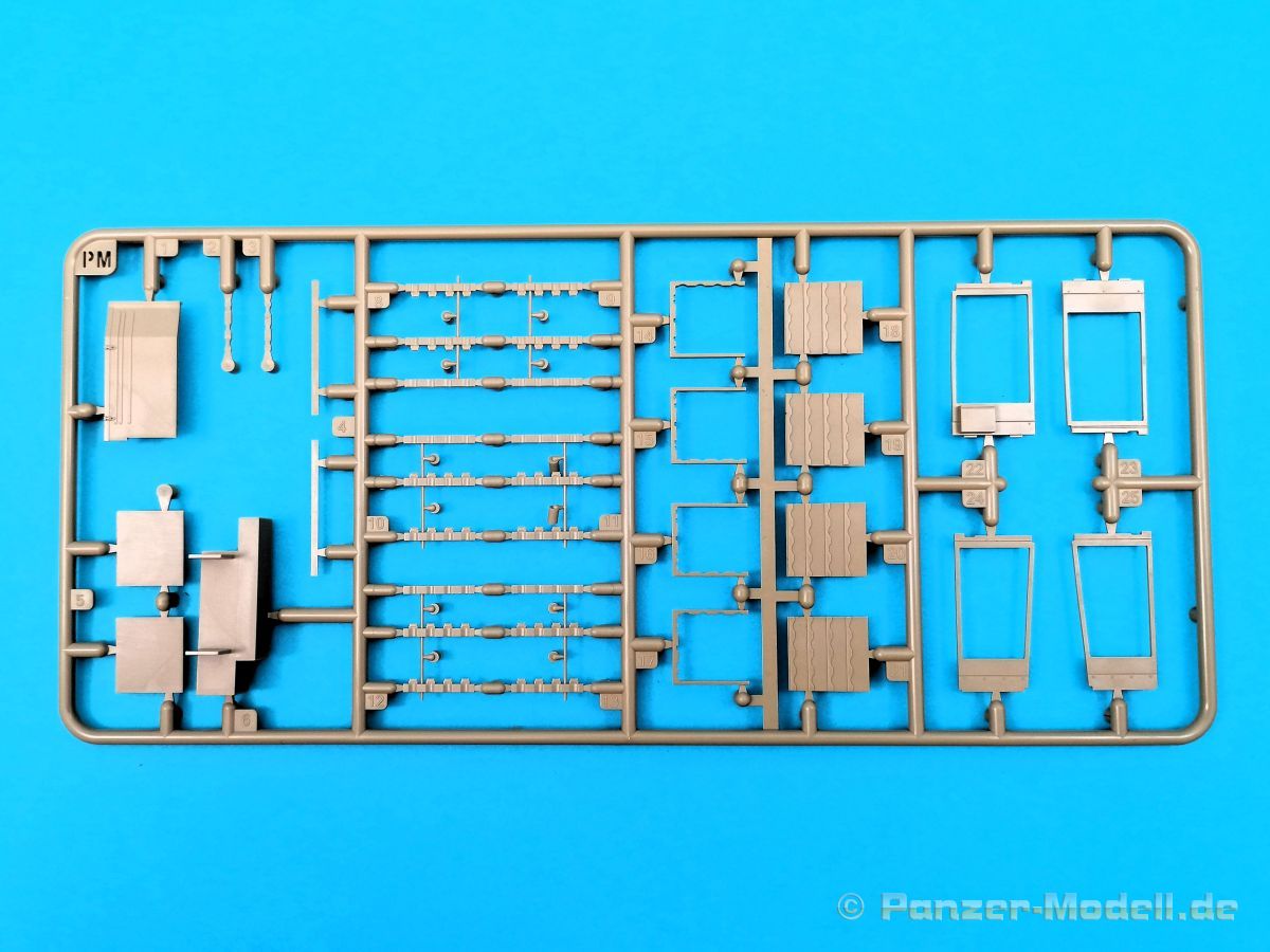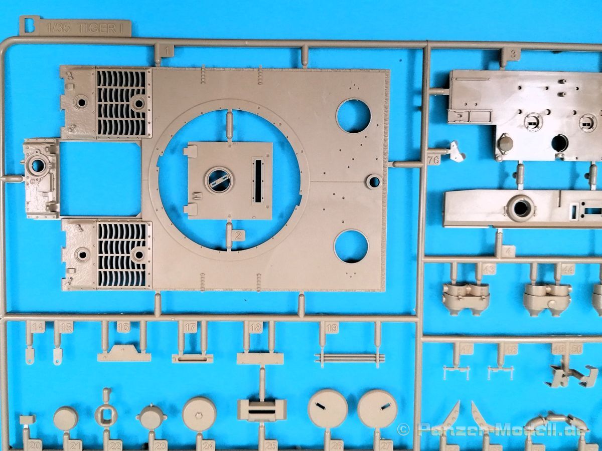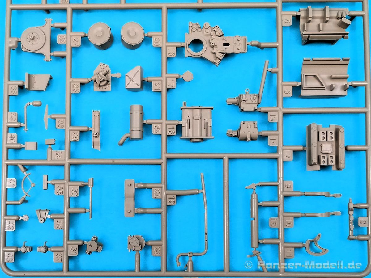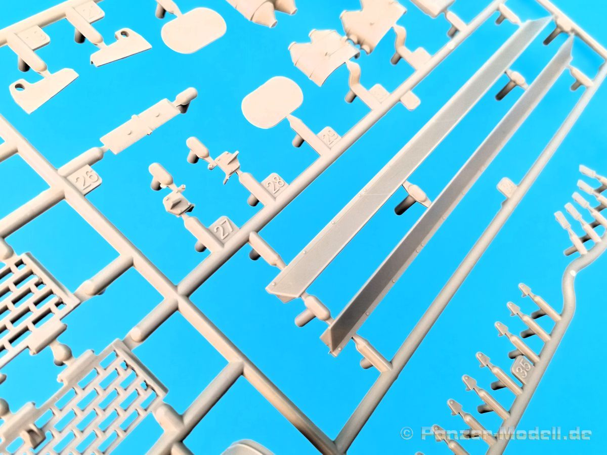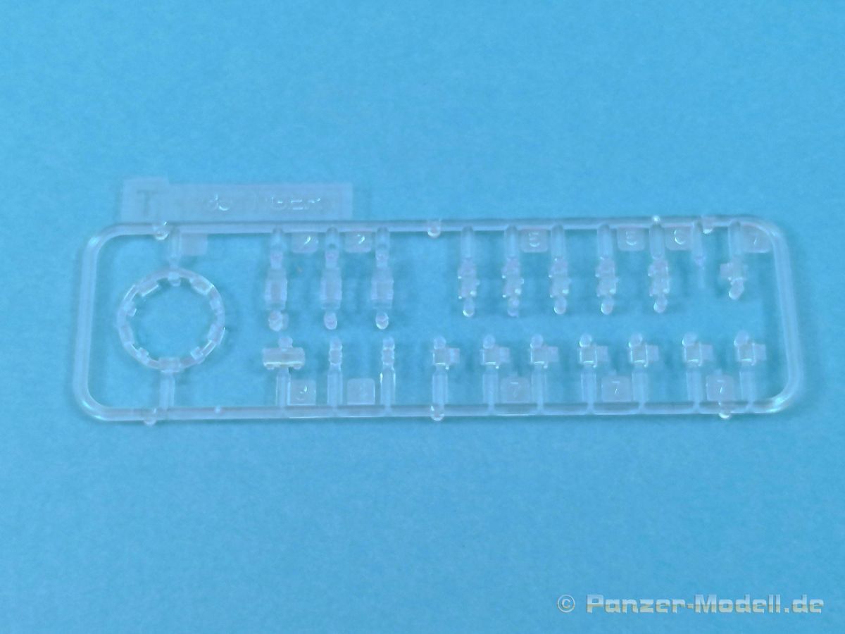 Mit dem 100sten Kit hat uns RFM mit einem weiteren Tiger I beglückt. Noch ein Tiger? Richtig, aber dieser Bausatz hat es in sich. In dem voluminösen Karton (38 x 24 x 15 cm) finden sich Bauteile für den Bau eines “normalen” Tigers oder den Bau eines Schnittmodells das in dieser Art in einigen Museen anzutreffen ist. Alles garniert mit einer Inneneinrichtung. Inwieweit der geneigte Modellbauer die Inneneinrichtung bei der “normalen” Bauweise verbaut, muß jeder für sich selbst entscheiden. Macht für mich keinen Sinn, da davon hinterher so gut wie nichts zu sehen ist, außer Teile durch evtl. geöffnete Luken. Zwingend notwendig aber beim Schnittmodell. 23 Rahmen, Klarsichtteile, Einzelgliederketten, drei Ätzteilbögen, ein Metallkabel und ein Decalbogen kommen nach dem Öffnen des Kartons zum Vorschein. Dazu die Bauanleitung, die sich mit 40 Seiten im Format DIN A4 schon als kleines Heftchen zeigt. Bereits der erste prüfende Blick zeigt Spritzguß auf der Höhe der Zeit. Auf den angenehm in einem sandgelben Ton eingefärbten Teilen zeigen sich keine Auswerfer in den sichtbaren Bereichen, geschweige von vorhandenem Flash oder Formenversatz. Auch Sinkstellen waren keine auszumachen. Die Schärfe und die Details der Bauteile lassen richtig Freude aufkommen. Bolzen, Schweißnähte etc. können überzeugen. Gleiches gilt auch für allerfeinste Teile wie z.B. Leitungen. Diese Kriterien gelten im allgemeinen für den Außenbereich ebenso wie für die Inneneinrichtung. Selbstverständlich liegen für den Bau des Schnittmodells alle Bauteile alternativ vor. Das Deckblatt der Bauanleitung beinhaltet neben der Wiedergabe des Deckelbilds die üblichen Piktogramme und Warnhinweise. Die folgenden drei Seiten sind für die Darstellung der Spritzlinge mit den Bauteilen in der gewohnten Manier ausgelegt. Ebenfalls vorhanden und aufgeführt sind alle Optionsteile. Erst auf Seite fünf startet der eigentliche Bau des Panzers bei dem sich der geneigte Modellbauer entscheiden muß welche Variante er bauen will. Hier kommt auch der erste Hinweis zum Bau des Schnittmodells bei dem viele Zeichnungen in Grün gehalten sind. Blau hinterlegt sind häufig bereits eingebaute Teile und auch Klebestellen in Rot gekennzeichnet. Im Prinzip fängt der Bau klassisch mit ausgewählten Unterwanne an der die Komponenten des Laufwerks montiert werden. Um die Schwingarme beweglich zu machen ist lediglich ein kleines Nupsi zu entfernen. Zum Einbau kommen anschließend Stoßdämpfer, Fahrer- und Beifahrersitz und viele weitere Kleinteile. Den größten Brocken machen die Konsole mit den Instrumenten und die ansprechend gestaltete Getriebeeinheit aus. Etwas aufwändig dürften sich die Granathalterungen anlassen die mit einzelnen unterschiedlichen Granaten gefüllt werden. Die Granaten werden mit jeweils drei Decals bestückt. Schränke und weiter Kleinteile wie z.B. die Munitionssäcke für die MGs finden ebenfalls ihren Platz. Der Einbau des Brandschotts zum Motor schließt die Montage des vorderen Bereichs ab. Über sieben Abschnitte zieht sich anschließend der Bau des Motors mit allen Anbauteilen und Aggregaten hin. Auch hier Bauteile, die mit einer tollen Detailtreue aufwarten. Abschluß findet sich mit der Montage des Heckblechs mit seinen Anbauteilen. Ab Baustufe 26 ist erhöhte Aufmersamkeit geboten da hier die Optionen für das Schnittmodell mit aufgeführt werden. In erster Linie beschäftigen sich die Abschnitte mit den “Schuhen” und deren Montage. Etwas aufwändig ist der Bau der Kettentrümmer da die Führungszähne einzeln aufgeklebt werden. Mit den zugehörigen Pins kann die Beweglichkeit der Kette erhalten bleiben. Im Anschluß erfolgt die Montage des Decks mit weiteren Ausrüstungsgegenständen. Wenn hier alles “verbraten” ist folgt letztendlich der Bau des Turmes. Auch in diesem Fall werden detailreiche Teile verbaut. Alles scheinbar vollständig. Angefangen von der 8,8cm mit Laffetierung bis hin zu Handrädern, Sitzen, Kanistern und weiteren Bauteilen… Um auf alles einzugehen ist nicht möglich da das Gesamtpaket einfach zu umfangreich ist. Die Anleitung ist recht gut aufgebaut. In den einzelnen Abschnitten sind Hinweise zu finden wenn z.B. Löcher gebohrt werden müssen. Ebenfalls finden sich kleine Graphiken wenn z.B. Baugruppen zusammengeführt werden, die dann in das Gesamtkonstrukt eingebaut werden. Daneben sind auch weitere Graphiken, teilweise farbig vorhanden, die den jeweiligen Bauabschnitt in einer Gesamtansicht darstellen. Dazu ein Hinweis in eigener Sache: Alle Bauteile sollten im Vorfeld vor Einbau bemalt und gealtert werden. Eine nachträgliche Kolorierung ist etwas schwieriger und zudem nervig. Wo viel Licht ist aber auch Schatten… Negativ macht sich das fehlen eines Zimmerits bemerkbar – sehr schade. Eigenregie ist eventuell angesagt, außer man wird im After-Market-Bereich fündig, z.B. bei ATAK. Nicht zielführend ist auch die Tatsache das in der Anleitung keinerlei Farbangaben zu den einzelnen Teilen zu finden sind. Allerdings sollte das für die “alten Hasen” unter uns kein Problem darstellen. Verwiesen wird u.a. auf Publikationen von AMIG und weiteren Büchern sowie dem Internet. Leider werden keine Farbhersteller mit einer Legende gelistet. Lediglich in den Bemalungsvorschlägen tauchen Farbnummern auf die auf das Sortiment von Mr. Hobby hinweisen. Zumindest in diesem Fall kann der Modellbauer auf Farben von anderen Herstellern einen Rückschluß ziehen. Auf insgesamt vier Seiten stellt uns RFM acht Bemalungsvorschläge zur Verfügung. Interessanterweise nur in einer Drei-Seiten Ansicht. Schade! Hinweise in welchen Abteilungen der Panzer fuhr sind vorhanden. Ort und Zeitpunkt sind ebenfalls deklariert. Diese Angaben fehlen lediglich bei dem vorletzten Bemalungsvorschlag. Die dem Kit beiliegenden Decals sind ohne Tadel gedruckt und können überzeugen. Ohne die Schattenseiten überzubewerten haben wir einen schönen und überzeugenden Bausatz vor uns liegen.