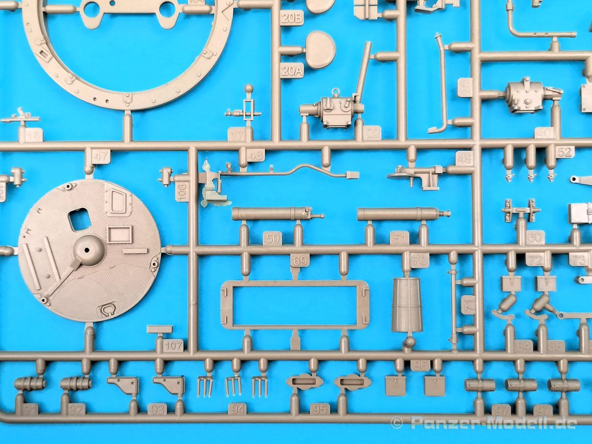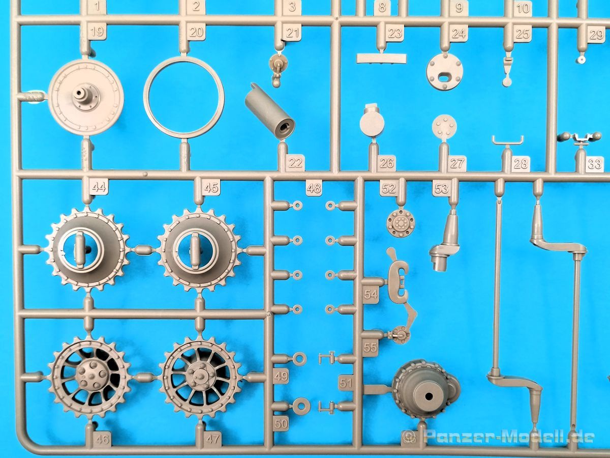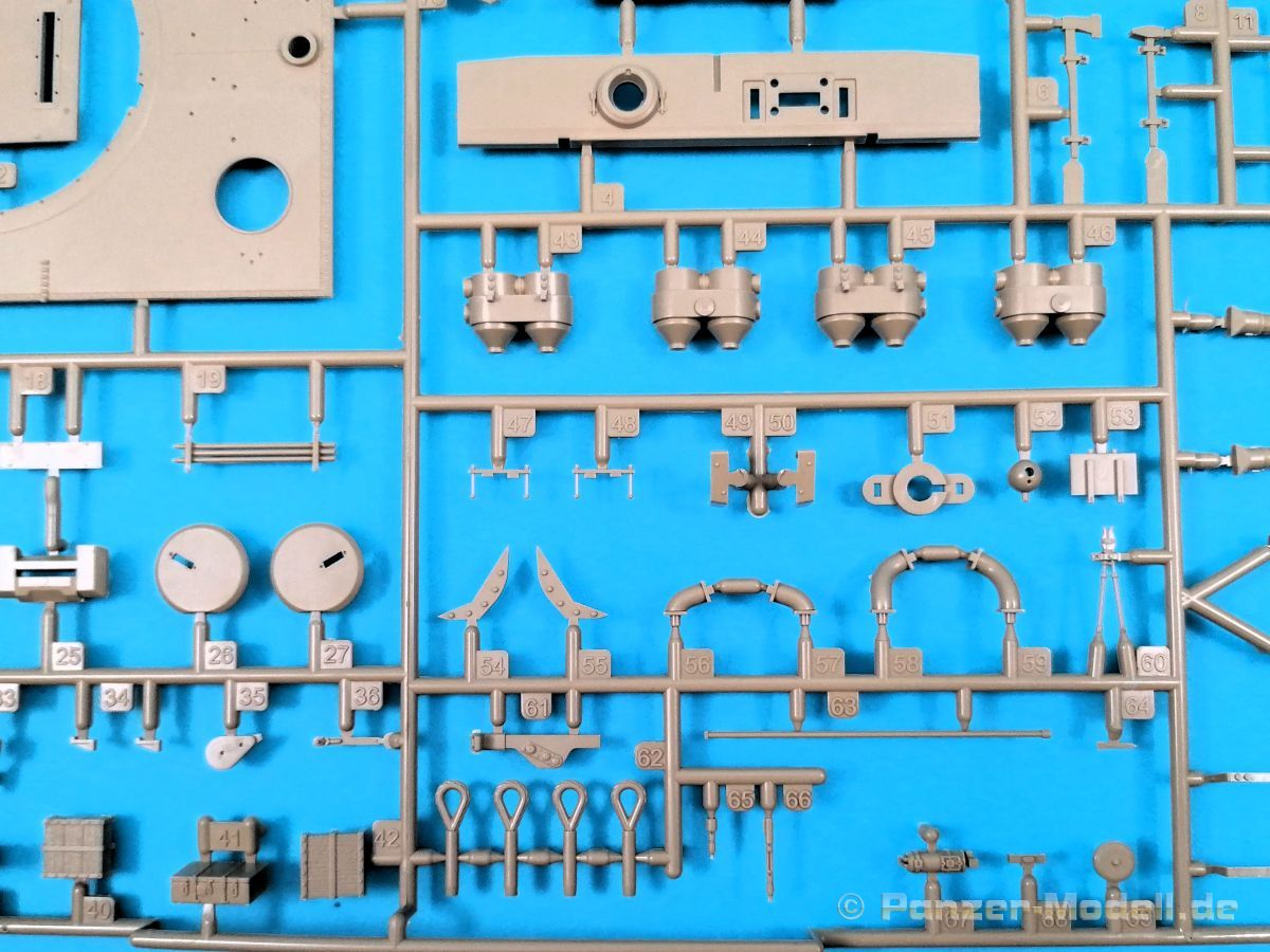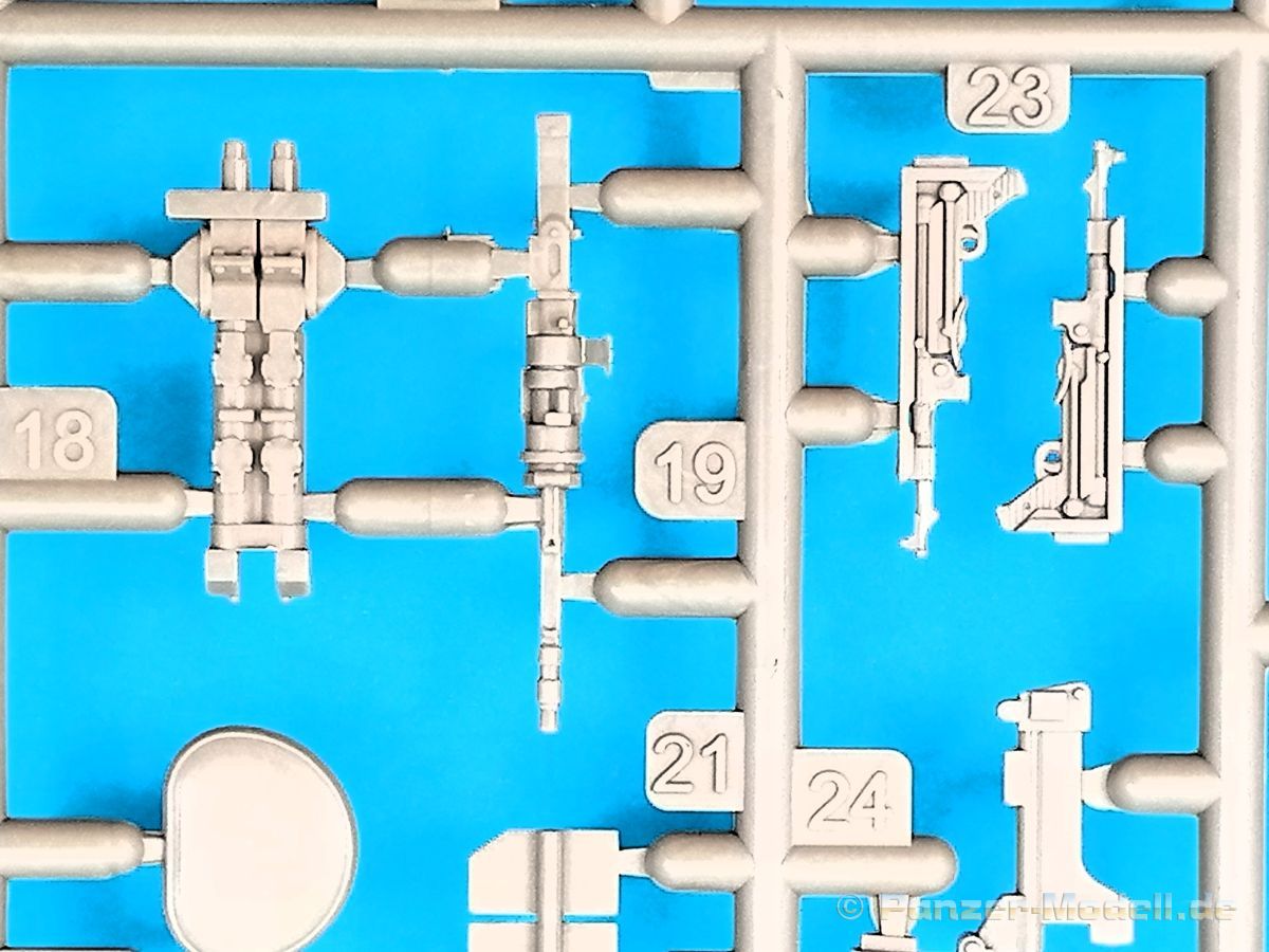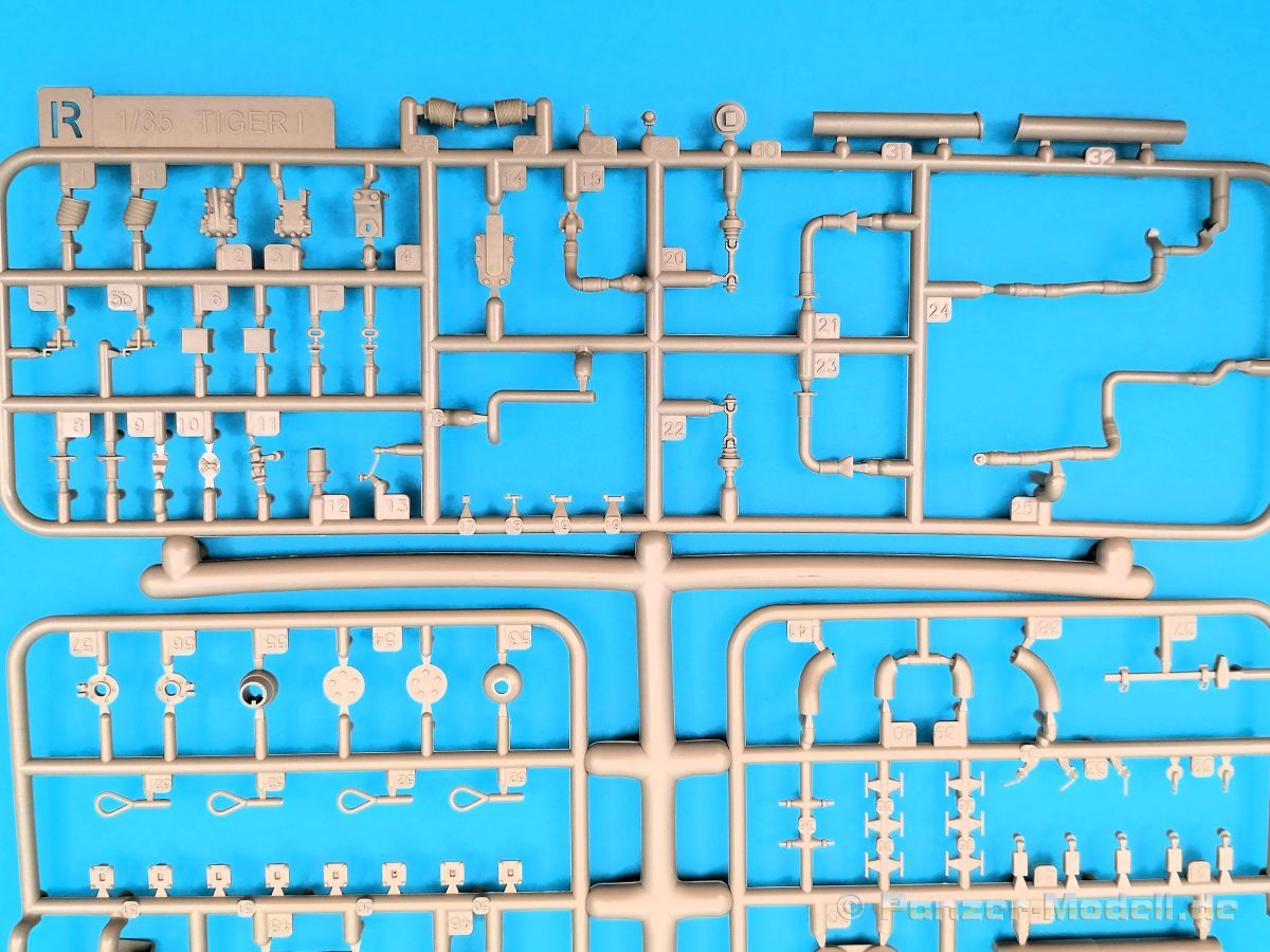Mit dem 100sten Kit hat uns RFM mit einem weiteren Tiger I beglückt. Noch ein Tiger? Richtig, aber dieser Bausatz hat es in sich. In dem voluminösen Karton (38 x 24 x 15 cm) finden sich Bauteile für den Bau eines “normalen” Tigers oder den Bau eines Schnittmodells das in dieser Art in einigen Museen anzutreffen ist. Alles garniert mit einer Inneneinrichtung. Inwieweit der geneigte Modellbauer die Inneneinrichtung bei der “normalen” Bauweise verbaut, muß jeder für sich selbst entscheiden. Macht für mich keinen Sinn, da davon hinterher so gut wie nichts zu sehen ist, außer Teile durch evtl. geöffnete Luken. Zwingend notwendig aber beim Schnittmodell. 23 Rahmen, Klarsichtteile, Einzelgliederketten, drei Ätzteilbögen, ein Metallkabel und ein Decalbogen kommen nach dem Öffnen des Kartons zum Vorschein. Dazu die Bauanleitung, die sich mit 40 Seiten im Format DIN A4 schon als kleines Heftchen zeigt. Bereits der erste prüfende Blick zeigt Spritzguß auf der Höhe der Zeit. Auf den angenehm in einem sandgelben Ton eingefärbten Teilen zeigen sich keine Auswerfer in den sichtbaren Bereichen, geschweige von vorhandenem Flash oder Formenversatz. Auch Sinkstellen waren keine auszumachen. Die Schärfe und die Details der Bauteile lassen richtig Freude aufkommen. Bolzen, Schweißnähte etc. können überzeugen. Gleiches gilt auch für allerfeinste Teile wie z.B. Leitungen. Diese Kriterien gelten im allgemeinen für den Außenbereich ebenso wie für die Inneneinrichtung. Selbstverständlich liegen für den Bau des Schnittmodells alle Bauteile alternativ vor. Das Deckblatt der Bauanleitung beinhaltet neben der Wiedergabe des Deckelbilds die üblichen Piktogramme und Warnhinweise. Die folgenden drei Seiten sind für die Darstellung der Spritzlinge mit den Bauteilen in der gewohnten Manier ausgelegt. Ebenfalls vorhanden und aufgeführt sind alle Optionsteile. Erst auf Seite fünf startet der eigentliche Bau des Panzers bei dem sich der geneigte Modellbauer entscheiden muß welche Variante er bauen will. Hier kommt auch der erste Hinweis zum Bau des Schnittmodells bei dem viele Zeichnungen in Grün gehalten sind. Blau hinterlegt sind häufig bereits eingebaute Teile und auch Klebestellen in Rot gekennzeichnet. Im Prinzip fängt der Bau klassisch mit ausgewählten Unterwanne an der die Komponenten des Laufwerks montiert werden. Um die Schwingarme beweglich zu machen ist lediglich ein kleines Nupsi zu entfernen. Zum Einbau kommen anschließend Stoßdämpfer, Fahrer- und Beifahrersitz und viele weitere Kleinteile. Den größten Brocken machen die Konsole mit den Instrumenten und die ansprechend gestaltete Getriebeeinheit aus. Etwas aufwändig dürften sich die Granathalterungen anlassen die mit einzelnen unterschiedlichen Granaten gefüllt werden. Die Granaten werden mit jeweils drei Decals bestückt. Schränke und weiter Kleinteile wie z.B. die Munitionssäcke für die MGs finden ebenfalls ihren Platz. Der Einbau des Brandschotts zum Motor schließt die Montage des vorderen Bereichs ab. Über sieben Abschnitte zieht sich anschließend der Bau des Motors mit allen Anbauteilen und Aggregaten hin. Auch hier Bauteile, die mit einer tollen Detailtreue aufwarten. Abschluß findet sich mit der Montage des Heckblechs mit seinen Anbauteilen. Ab Baustufe 26 ist erhöhte Aufmersamkeit geboten da hier die Optionen für das Schnittmodell mit aufgeführt werden. In erster Linie beschäftigen sich die Abschnitte mit den “Schuhen” und deren Montage. Etwas aufwändig ist der Bau der Kettentrümmer da die Führungszähne einzeln aufgeklebt werden. Mit den zugehörigen Pins kann die Beweglichkeit der Kette erhalten bleiben. Im Anschluß erfolgt die Montage des Decks mit weiteren Ausrüstungsgegenständen. Wenn hier alles “verbraten” ist folgt letztendlich der Bau des Turmes. Auch in diesem Fall werden detailreiche Teile verbaut. Alles scheinbar vollständig. Angefangen von der 8,8cm mit Laffetierung bis hin zu Handrädern, Sitzen, Kanistern und weiteren Bauteilen… Um auf alles einzugehen ist nicht möglich da das Gesamtpaket einfach zu umfangreich ist. Die Anleitung ist recht gut aufgebaut. In den einzelnen Abschnitten sind Hinweise zu finden wenn z.B. Löcher gebohrt werden müssen. Ebenfalls finden sich kleine Graphiken wenn z.B. Baugruppen zusammengeführt werden, die dann in das Gesamtkonstrukt eingebaut werden. Daneben sind auch weitere Graphiken, teilweise farbig vorhanden, die den jeweiligen Bauabschnitt in einer Gesamtansicht darstellen. Dazu ein Hinweis in eigener Sache: Alle Bauteile sollten im Vorfeld vor Einbau bemalt und gealtert werden. Eine nachträgliche Kolorierung ist etwas schwieriger und zudem nervig. Wo viel Licht ist aber auch Schatten… Negativ macht sich das fehlen eines Zimmerits bemerkbar – sehr schade. Eigenregie ist eventuell angesagt, außer man wird im After-Market-Bereich fündig, z.B. bei ATAK. Nicht zielführend ist auch die Tatsache das in der Anleitung keinerlei Farbangaben zu den einzelnen Teilen zu finden sind. Allerdings sollte das für die “alten Hasen” unter uns kein Problem darstellen. Verwiesen wird u.a. auf Publikationen von AMIG und weiteren Büchern sowie dem Internet. Leider werden keine Farbhersteller mit einer Legende gelistet. Lediglich in den Bemalungsvorschlägen tauchen Farbnummern auf die auf das Sortiment von Mr. Hobby hinweisen. Zumindest in diesem Fall kann der Modellbauer auf Farben von anderen Herstellern einen Rückschluß ziehen. Auf insgesamt vier Seiten stellt uns RFM acht Bemalungsvorschläge zur Verfügung. Interessanterweise nur in einer Drei-Seiten Ansicht. Schade! Hinweise in welchen Abteilungen der Panzer fuhr sind vorhanden. Ort und Zeitpunkt sind ebenfalls deklariert. Diese Angaben fehlen lediglich bei dem vorletzten Bemalungsvorschlag. Die dem Kit beiliegenden Decals sind ohne Tadel gedruckt und können überzeugen. Ohne die Schattenseiten überzubewerten haben wir einen schönen und überzeugenden Bausatz vor uns liegen.