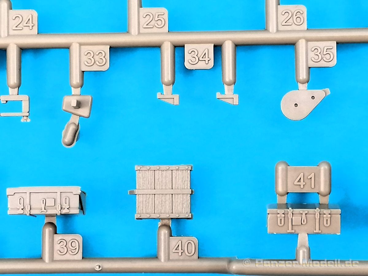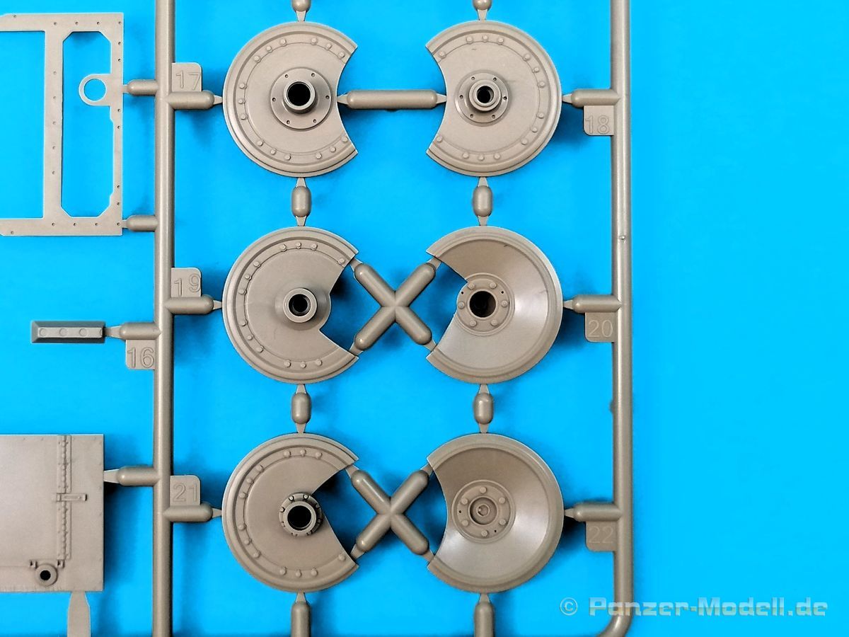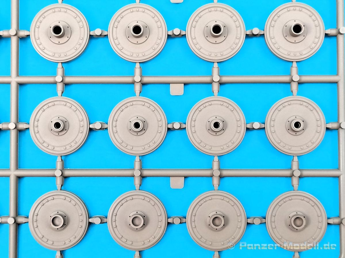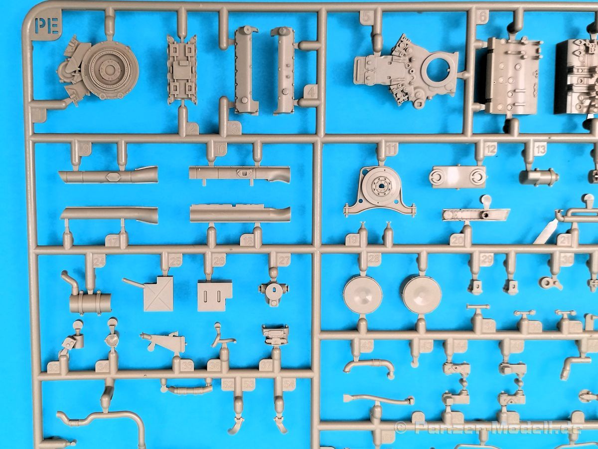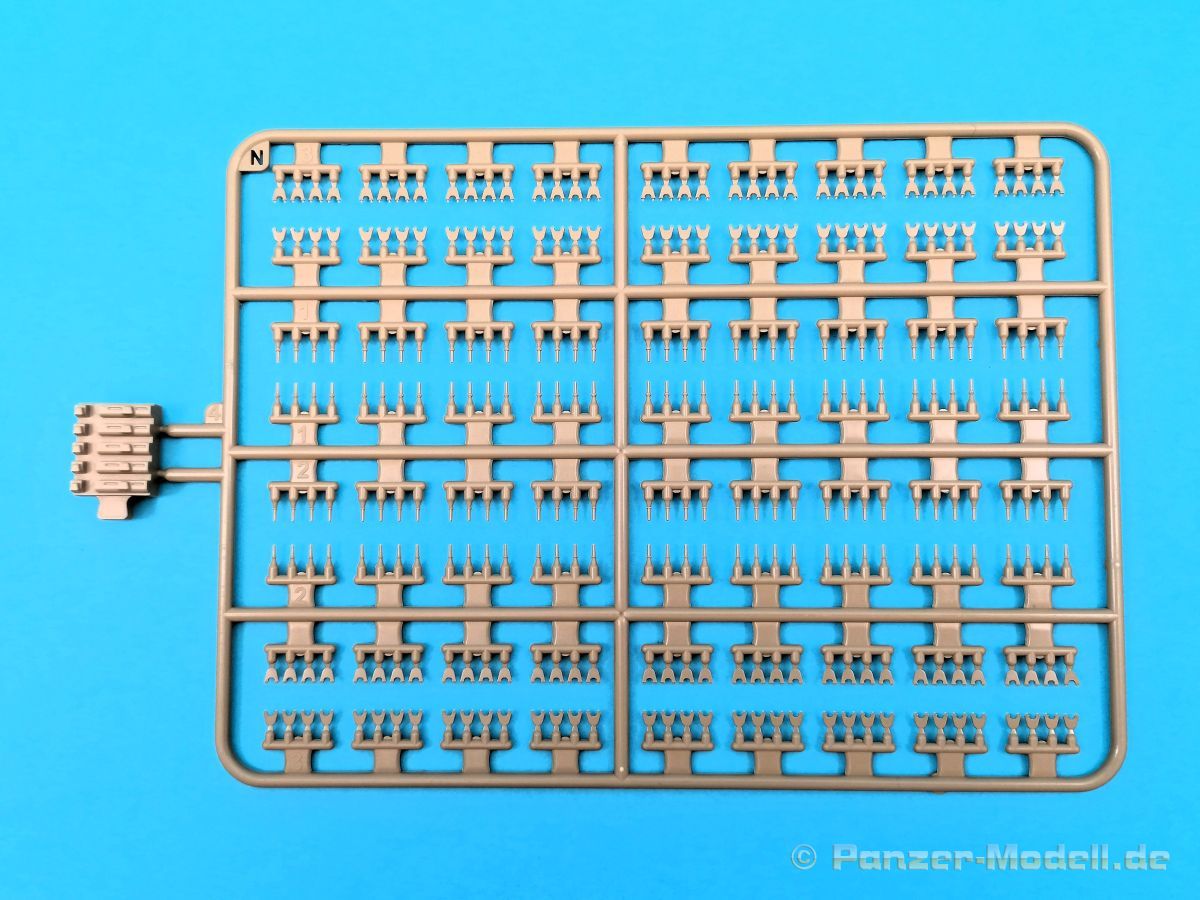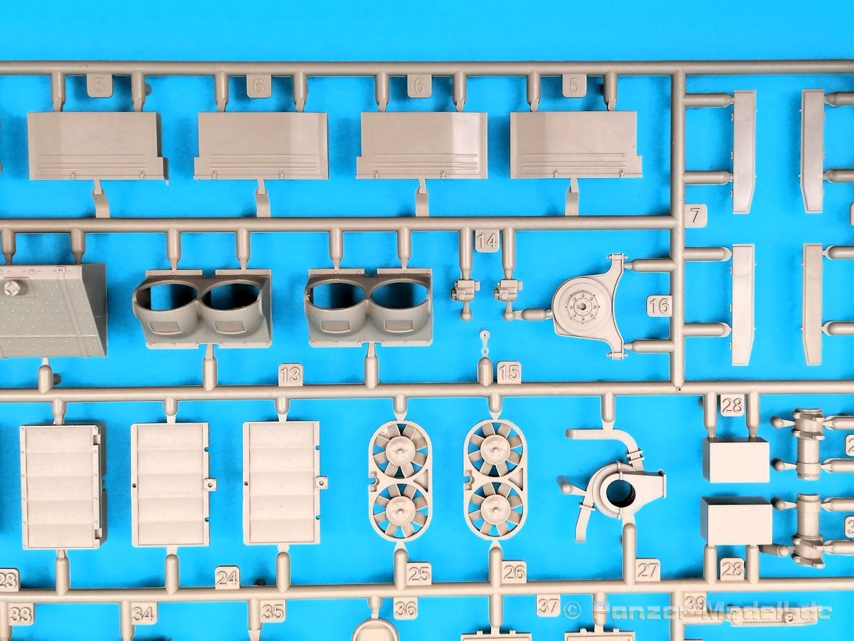 Mit dem 100sten Kit hat uns RFM mit einem weiteren Tiger I beglückt. Noch ein Tiger? Richtig, aber dieser Bausatz hat es in sich. In dem voluminösen Karton (38 x 24 x 15 cm) finden sich Bauteile für den Bau eines “normalen” Tigers oder den Bau eines Schnittmodells das in dieser Art in einigen Museen anzutreffen ist. Alles garniert mit einer Inneneinrichtung. Inwieweit der geneigte Modellbauer die Inneneinrichtung bei der “normalen” Bauweise verbaut, muß jeder für sich selbst entscheiden. Macht für mich keinen Sinn, da davon hinterher so gut wie nichts zu sehen ist, außer Teile durch evtl. geöffnete Luken. Zwingend notwendig aber beim Schnittmodell. 23 Rahmen, Klarsichtteile, Einzelgliederketten, drei Ätzteilbögen, ein Metallkabel und ein Decalbogen kommen nach dem Öffnen des Kartons zum Vorschein. Dazu die Bauanleitung, die sich mit 40 Seiten im Format DIN A4 schon als kleines Heftchen zeigt. Bereits der erste prüfende Blick zeigt Spritzguß auf der Höhe der Zeit. Auf den angenehm in einem sandgelben Ton eingefärbten Teilen zeigen sich keine Auswerfer in den sichtbaren Bereichen, geschweige von vorhandenem Flash oder Formenversatz. Auch Sinkstellen waren keine auszumachen. Die Schärfe und die Details der Bauteile lassen richtig Freude aufkommen. Bolzen, Schweißnähte etc. können überzeugen. Gleiches gilt auch für allerfeinste Teile wie z.B. Leitungen. Diese Kriterien gelten im allgemeinen für den Außenbereich ebenso wie für die Inneneinrichtung. Selbstverständlich liegen für den Bau des Schnittmodells alle Bauteile alternativ vor. Das Deckblatt der Bauanleitung beinhaltet neben der Wiedergabe des Deckelbilds die üblichen Piktogramme und Warnhinweise. Die folgenden drei Seiten sind für die Darstellung der Spritzlinge mit den Bauteilen in der gewohnten Manier ausgelegt. Ebenfalls vorhanden und aufgeführt sind alle Optionsteile. Erst auf Seite fünf startet der eigentliche Bau des Panzers bei dem sich der geneigte Modellbauer entscheiden muß welche Variante er bauen will. Hier kommt auch der erste Hinweis zum Bau des Schnittmodells bei dem viele Zeichnungen in Grün gehalten sind. Blau hinterlegt sind häufig bereits eingebaute Teile und auch Klebestellen in Rot gekennzeichnet. Im Prinzip fängt der Bau klassisch mit ausgewählten Unterwanne an der die Komponenten des Laufwerks montiert werden. Um die Schwingarme beweglich zu machen ist lediglich ein kleines Nupsi zu entfernen. Zum Einbau kommen anschließend Stoßdämpfer, Fahrer- und Beifahrersitz und viele weitere Kleinteile. Den größten Brocken machen die Konsole mit den Instrumenten und die ansprechend gestaltete Getriebeeinheit aus. Etwas aufwändig dürften sich die Granathalterungen anlassen die mit einzelnen unterschiedlichen Granaten gefüllt werden. Die Granaten werden mit jeweils drei Decals bestückt. Schränke und weiter Kleinteile wie z.B. die Munitionssäcke für die MGs finden ebenfalls ihren Platz. Der Einbau des Brandschotts zum Motor schließt die Montage des vorderen Bereichs ab. Über sieben Abschnitte zieht sich anschließend der Bau des Motors mit allen Anbauteilen und Aggregaten hin. Auch hier Bauteile, die mit einer tollen Detailtreue aufwarten. Abschluß findet sich mit der Montage des Heckblechs mit seinen Anbauteilen. Ab Baustufe 26 ist erhöhte Aufmersamkeit geboten da hier die Optionen für das Schnittmodell mit aufgeführt werden. In erster Linie beschäftigen sich die Abschnitte mit den “Schuhen” und deren Montage. Etwas aufwändig ist der Bau der Kettentrümmer da die Führungszähne einzeln aufgeklebt werden. Mit den zugehörigen Pins kann die Beweglichkeit der Kette erhalten bleiben. Im Anschluß erfolgt die Montage des Decks mit weiteren Ausrüstungsgegenständen. Wenn hier alles “verbraten” ist folgt letztendlich der Bau des Turmes. Auch in diesem Fall werden detailreiche Teile verbaut. Alles scheinbar vollständig. Angefangen von der 8,8cm mit Laffetierung bis hin zu Handrädern, Sitzen, Kanistern und weiteren Bauteilen… Um auf alles einzugehen ist nicht möglich da das Gesamtpaket einfach zu umfangreich ist. Die Anleitung ist recht gut aufgebaut. In den einzelnen Abschnitten sind Hinweise zu finden wenn z.B. Löcher gebohrt werden müssen. Ebenfalls finden sich kleine Graphiken wenn z.B. Baugruppen zusammengeführt werden, die dann in das Gesamtkonstrukt eingebaut werden. Daneben sind auch weitere Graphiken, teilweise farbig vorhanden, die den jeweiligen Bauabschnitt in einer Gesamtansicht darstellen. Dazu ein Hinweis in eigener Sache: Alle Bauteile sollten im Vorfeld vor Einbau bemalt und gealtert werden. Eine nachträgliche Kolorierung ist etwas schwieriger und zudem nervig. Wo viel Licht ist aber auch Schatten… Negativ macht sich das fehlen eines Zimmerits bemerkbar – sehr schade. Eigenregie ist eventuell angesagt, außer man wird im After-Market-Bereich fündig, z.B. bei ATAK. Nicht zielführend ist auch die Tatsache das in der Anleitung keinerlei Farbangaben zu den einzelnen Teilen zu finden sind. Allerdings sollte das für die “alten Hasen” unter uns kein Problem darstellen. Verwiesen wird u.a. auf Publikationen von AMIG und weiteren Büchern sowie dem Internet. Leider werden keine Farbhersteller mit einer Legende gelistet. Lediglich in den Bemalungsvorschlägen tauchen Farbnummern auf die auf das Sortiment von Mr. Hobby hinweisen. Zumindest in diesem Fall kann der Modellbauer auf Farben von anderen Herstellern einen Rückschluß ziehen. Auf insgesamt vier Seiten stellt uns RFM acht Bemalungsvorschläge zur Verfügung. Interessanterweise nur in einer Drei-Seiten Ansicht. Schade! Hinweise in welchen Abteilungen der Panzer fuhr sind vorhanden. Ort und Zeitpunkt sind ebenfalls deklariert. Diese Angaben fehlen lediglich bei dem vorletzten Bemalungsvorschlag. Die dem Kit beiliegenden Decals sind ohne Tadel gedruckt und können überzeugen. Ohne die Schattenseiten überzubewerten haben wir einen schönen und überzeugenden Bausatz vor uns liegen.