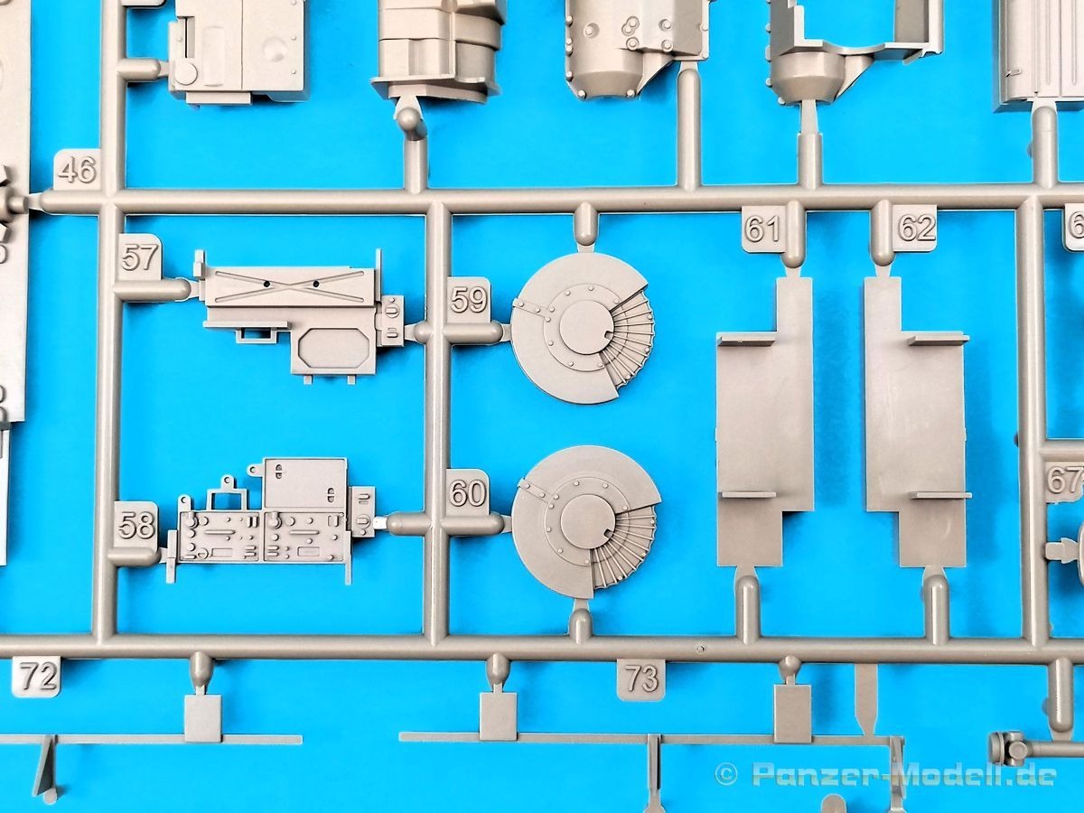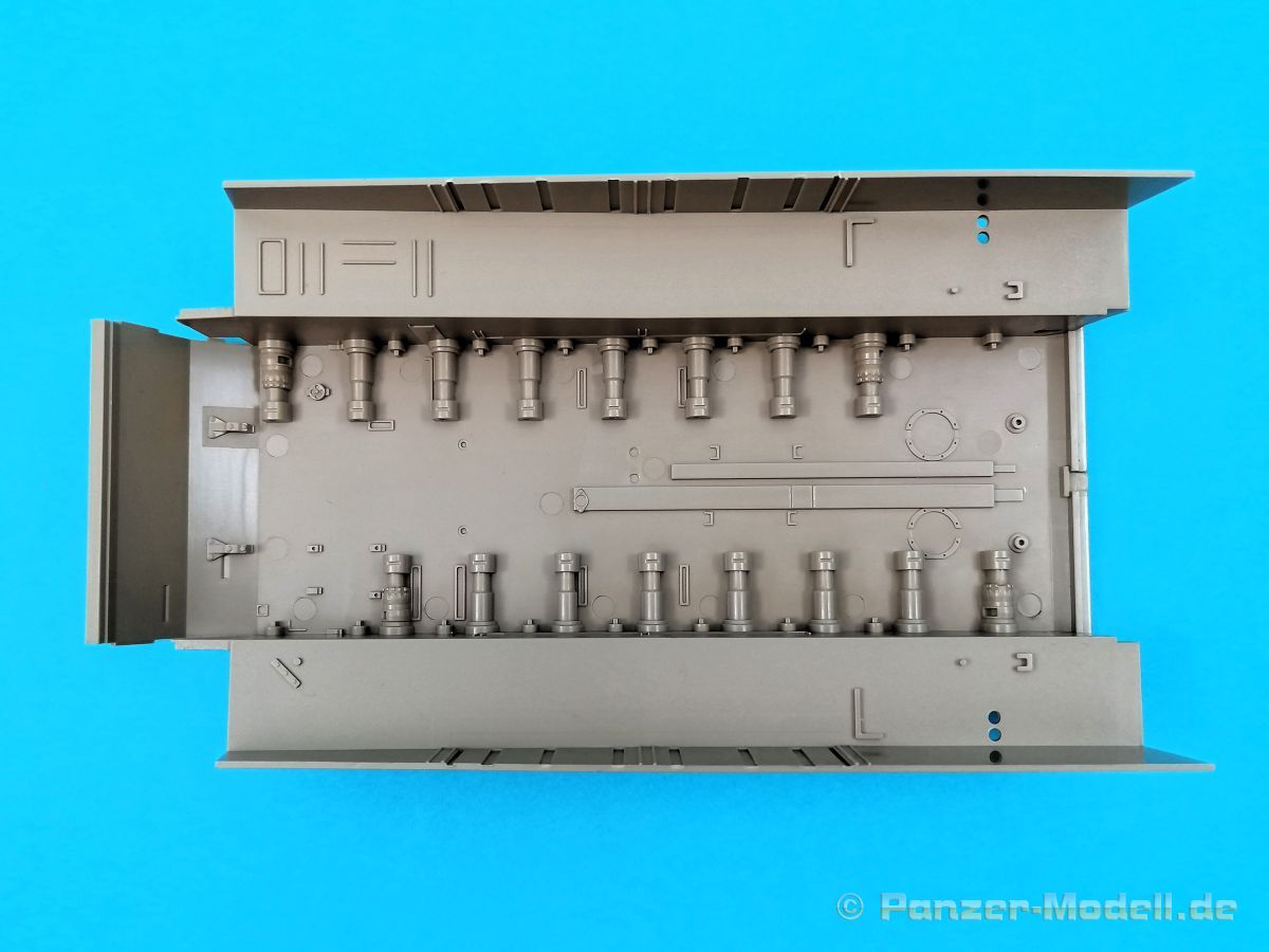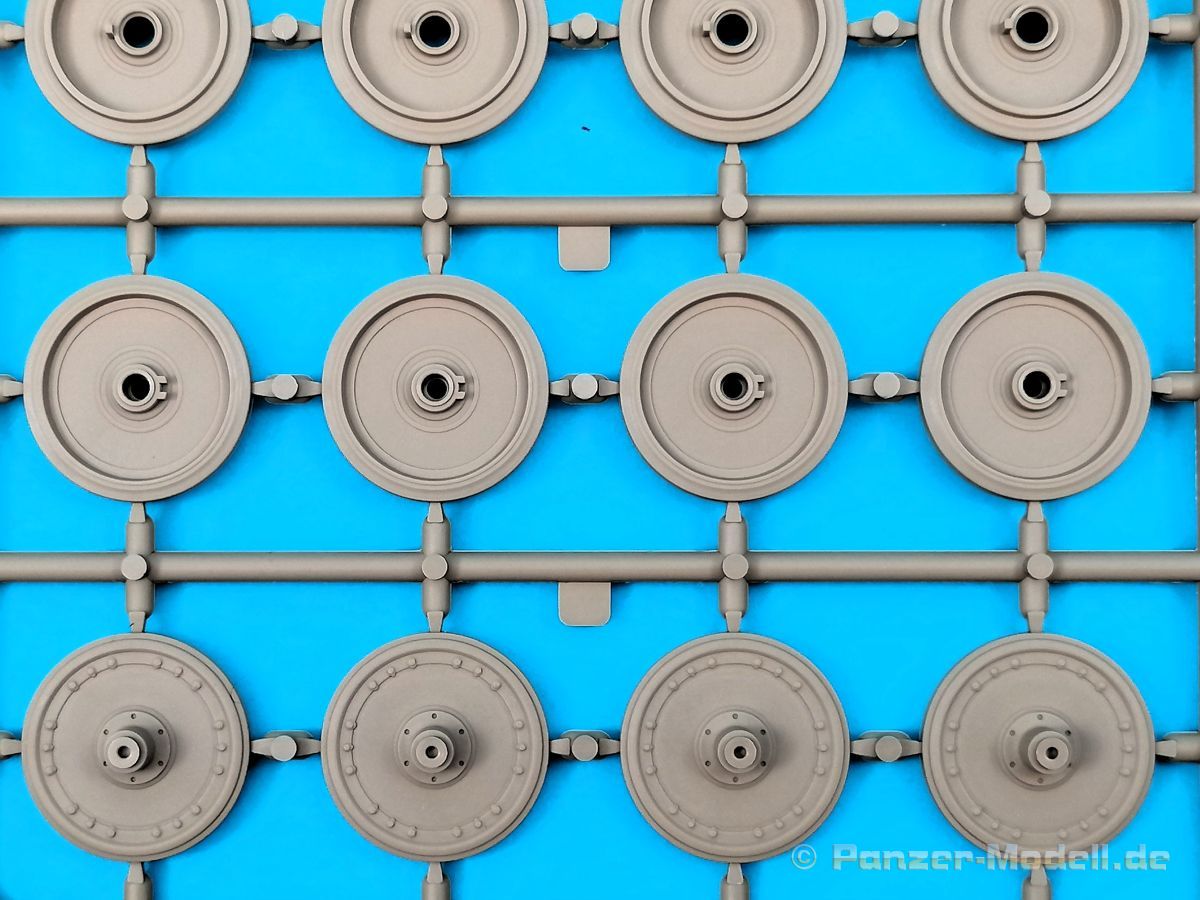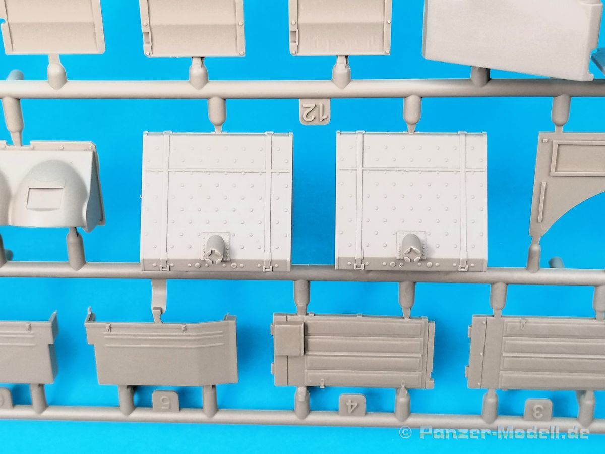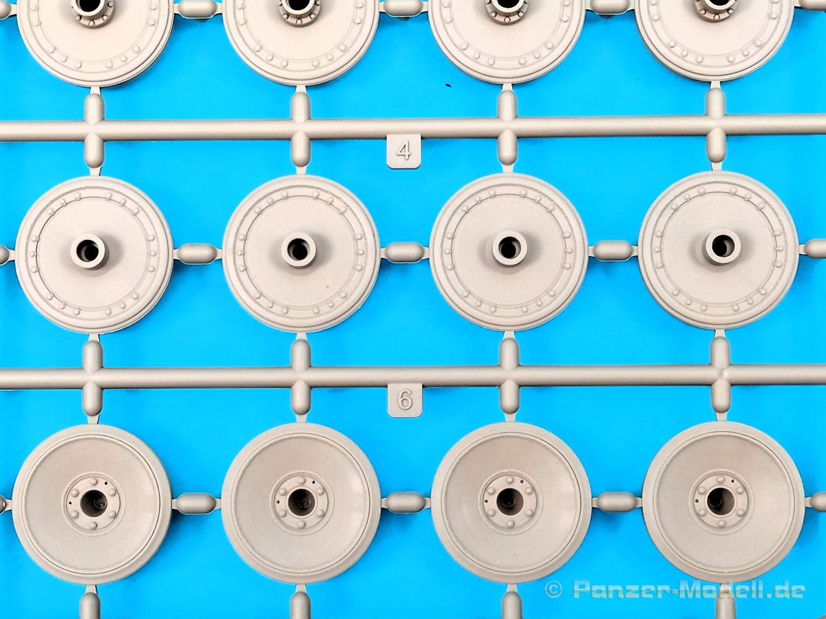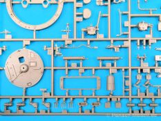 Mit dem 100sten Kit hat uns RFM mit einem weiteren Tiger I beglückt. Noch ein Tiger? Richtig, aber dieser Bausatz hat es in sich. In dem voluminösen Karton (38 x 24 x 15 cm) finden sich Bauteile für den Bau eines “normalen” Tigers oder den Bau eines Schnittmodells das in dieser Art in einigen Museen anzutreffen ist. Alles garniert mit einer Inneneinrichtung. Inwieweit der geneigte Modellbauer die Inneneinrichtung bei der “normalen” Bauweise verbaut, muß jeder für sich selbst entscheiden. Macht für mich keinen Sinn, da davon hinterher so gut wie nichts zu sehen ist, außer Teile durch evtl. geöffnete Luken. Zwingend notwendig aber beim Schnittmodell. 23 Rahmen, Klarsichtteile, Einzelgliederketten, drei Ätzteilbögen, ein Metallkabel und ein Decalbogen kommen nach dem Öffnen des Kartons zum Vorschein. Dazu die Bauanleitung, die sich mit 40 Seiten im Format DIN A4 schon als kleines Heftchen zeigt. Bereits der erste prüfende Blick zeigt Spritzguß auf der Höhe der Zeit. Auf den angenehm in einem sandgelben Ton eingefärbten Teilen zeigen sich keine Auswerfer in den sichtbaren Bereichen, geschweige von vorhandenem Flash oder Formenversatz. Auch Sinkstellen waren keine auszumachen. Die Schärfe und die Details der Bauteile lassen richtig Freude aufkommen. Bolzen, Schweißnähte etc. können überzeugen. Gleiches gilt auch für allerfeinste Teile wie z.B. Leitungen. Diese Kriterien gelten im allgemeinen für den Außenbereich ebenso wie für die Inneneinrichtung. Selbstverständlich liegen für den Bau des Schnittmodells alle Bauteile alternativ vor. Das Deckblatt der Bauanleitung beinhaltet neben der Wiedergabe des Deckelbilds die üblichen Piktogramme und Warnhinweise. Die folgenden drei Seiten sind für die Darstellung der Spritzlinge mit den Bauteilen in der gewohnten Manier ausgelegt. Ebenfalls vorhanden und aufgeführt sind alle Optionsteile. Erst auf Seite fünf startet der eigentliche Bau des Panzers bei dem sich der geneigte Modellbauer entscheiden muß welche Variante er bauen will. Hier kommt auch der erste Hinweis zum Bau des Schnittmodells bei dem viele Zeichnungen in Grün gehalten sind. Blau hinterlegt sind häufig bereits eingebaute Teile und auch Klebestellen in Rot gekennzeichnet. Im Prinzip fängt der Bau klassisch mit ausgewählten Unterwanne an der die Komponenten des Laufwerks montiert werden. Um die Schwingarme beweglich zu machen ist lediglich ein kleines Nupsi zu entfernen. Zum Einbau kommen anschließend Stoßdämpfer, Fahrer- und Beifahrersitz und viele weitere Kleinteile. Den größten Brocken machen die Konsole mit den Instrumenten und die ansprechend gestaltete Getriebeeinheit aus. Etwas aufwändig dürften sich die Granathalterungen anlassen die mit einzelnen unterschiedlichen Granaten gefüllt werden. Die Granaten werden mit jeweils drei Decals bestückt. Schränke und weiter Kleinteile wie z.B. die Munitionssäcke für die MGs finden ebenfalls ihren Platz. Der Einbau des Brandschotts zum Motor schließt die Montage des vorderen Bereichs ab. Über sieben Abschnitte zieht sich anschließend der Bau des Motors mit allen Anbauteilen und Aggregaten hin. Auch hier Bauteile, die mit einer tollen Detailtreue aufwarten. Abschluß findet sich mit der Montage des Heckblechs mit seinen Anbauteilen. Ab Baustufe 26 ist erhöhte Aufmersamkeit geboten da hier die Optionen für das Schnittmodell mit aufgeführt werden. In erster Linie beschäftigen sich die Abschnitte mit den “Schuhen” und deren Montage. Etwas aufwändig ist der Bau der Kettentrümmer da die Führungszähne einzeln aufgeklebt werden. Mit den zugehörigen Pins kann die Beweglichkeit der Kette erhalten bleiben. Im Anschluß erfolgt die Montage des Decks mit weiteren Ausrüstungsgegenständen. Wenn hier alles “verbraten” ist folgt letztendlich der Bau des Turmes. Auch in diesem Fall werden detailreiche Teile verbaut. Alles scheinbar vollständig. Angefangen von der 8,8cm mit Laffetierung bis hin zu Handrädern, Sitzen, Kanistern und weiteren Bauteilen… Um auf alles einzugehen ist nicht möglich da das Gesamtpaket einfach zu umfangreich ist. Die Anleitung ist recht gut aufgebaut. In den einzelnen Abschnitten sind Hinweise zu finden wenn z.B. Löcher gebohrt werden müssen. Ebenfalls finden sich kleine Graphiken wenn z.B. Baugruppen zusammengeführt werden, die dann in das Gesamtkonstrukt eingebaut werden. Daneben sind auch weitere Graphiken, teilweise farbig vorhanden, die den jeweiligen Bauabschnitt in einer Gesamtansicht darstellen. Dazu ein Hinweis in eigener Sache: Alle Bauteile sollten im Vorfeld vor Einbau bemalt und gealtert werden. Eine nachträgliche Kolorierung ist etwas schwieriger und zudem nervig. Wo viel Licht ist aber auch Schatten… Negativ macht sich das fehlen eines Zimmerits bemerkbar – sehr schade. Eigenregie ist eventuell angesagt, außer man wird im After-Market-Bereich fündig, z.B. bei ATAK. Nicht zielführend ist auch die Tatsache das in der Anleitung keinerlei Farbangaben zu den einzelnen Teilen zu finden sind. Allerdings sollte das für die “alten Hasen” unter uns kein Problem darstellen. Verwiesen wird u.a. auf Publikationen von AMIG und weiteren Büchern sowie dem Internet. Leider werden keine Farbhersteller mit einer Legende gelistet. Lediglich in den Bemalungsvorschlägen tauchen Farbnummern auf die auf das Sortiment von Mr. Hobby hinweisen. Zumindest in diesem Fall kann der Modellbauer auf Farben von anderen Herstellern einen Rückschluß ziehen. Auf insgesamt vier Seiten stellt uns RFM acht Bemalungsvorschläge zur Verfügung. Interessanterweise nur in einer Drei-Seiten Ansicht. Schade! Hinweise in welchen Abteilungen der Panzer fuhr sind vorhanden. Ort und Zeitpunkt sind ebenfalls deklariert. Diese Angaben fehlen lediglich bei dem vorletzten Bemalungsvorschlag. Die dem Kit beiliegenden Decals sind ohne Tadel gedruckt und können überzeugen. Ohne die Schattenseiten überzubewerten haben wir einen schönen und überzeugenden Bausatz vor uns liegen.