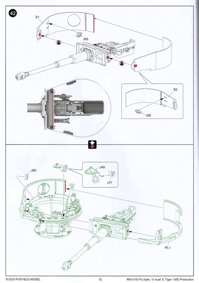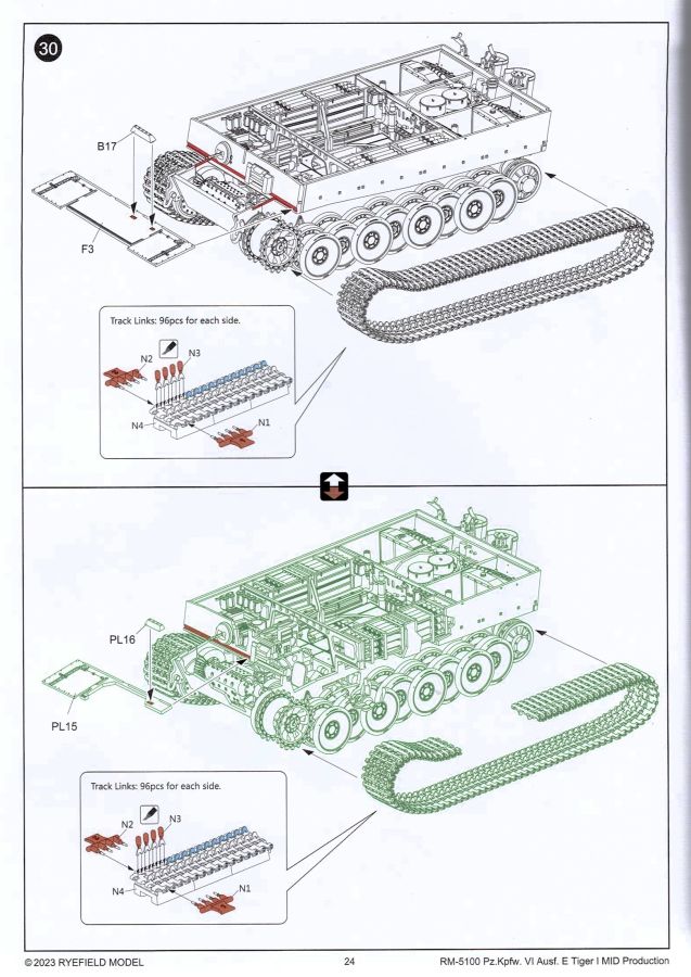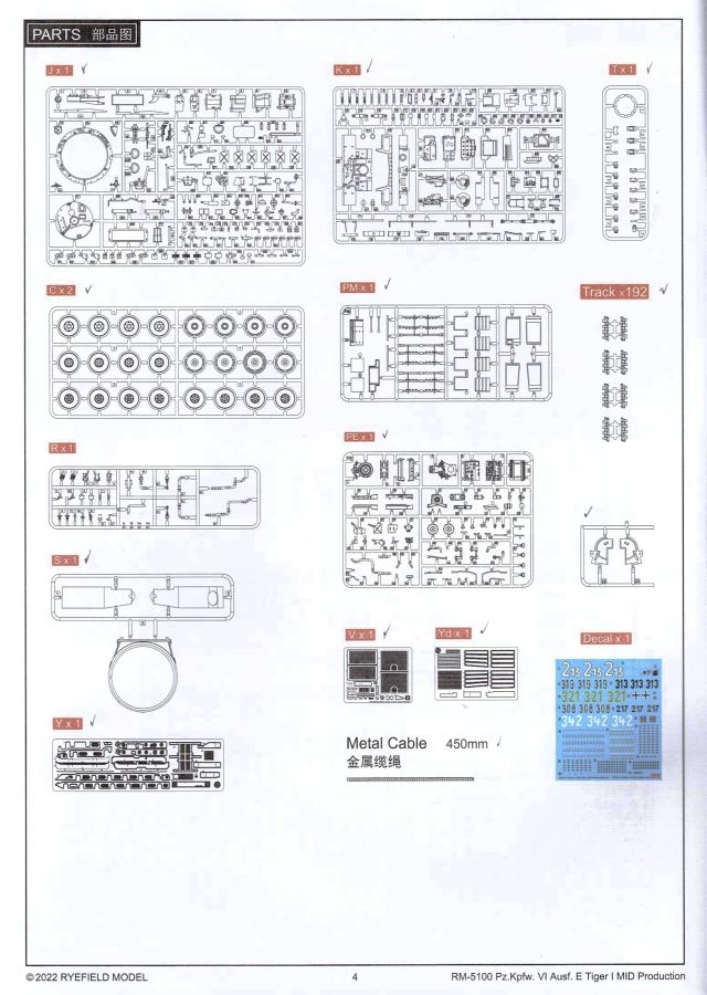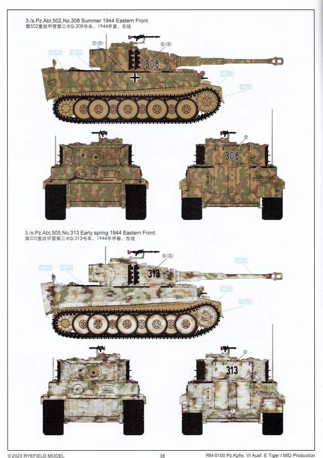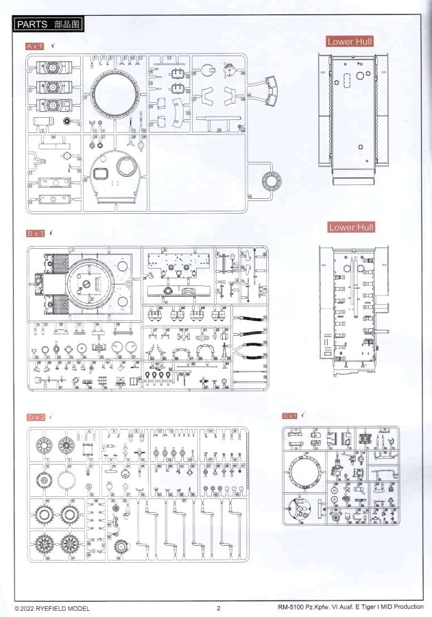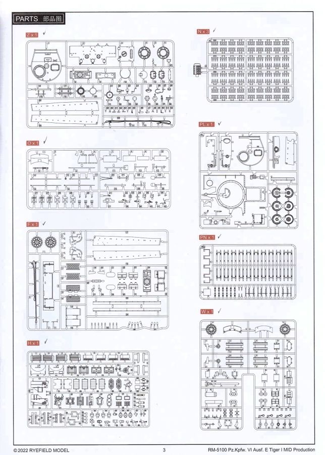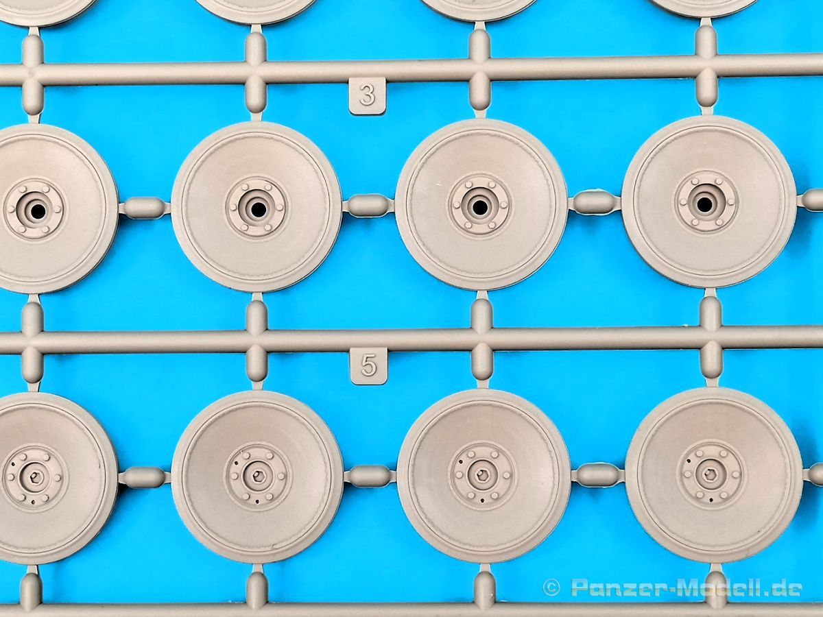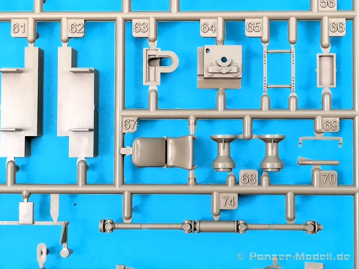 Mit dem 100sten Kit hat uns RFM mit einem weiteren Tiger I beglückt. Noch ein Tiger? Richtig, aber dieser Bausatz hat es in sich. In dem voluminösen Karton (38 x 24 x 15 cm) finden sich Bauteile für den Bau eines “normalen” Tigers oder den Bau eines Schnittmodells das in dieser Art in einigen Museen anzutreffen ist. Alles garniert mit einer Inneneinrichtung. Inwieweit der geneigte Modellbauer die Inneneinrichtung bei der “normalen” Bauweise verbaut, muß jeder für sich selbst entscheiden. Macht für mich keinen Sinn, da davon hinterher so gut wie nichts zu sehen ist, außer Teile durch evtl. geöffnete Luken. Zwingend notwendig aber beim Schnittmodell. 23 Rahmen, Klarsichtteile, Einzelgliederketten, drei Ätzteilbögen, ein Metallkabel und ein Decalbogen kommen nach dem Öffnen des Kartons zum Vorschein. Dazu die Bauanleitung, die sich mit 40 Seiten im Format DIN A4 schon als kleines Heftchen zeigt. Bereits der erste prüfende Blick zeigt Spritzguß auf der Höhe der Zeit. Auf den angenehm in einem sandgelben Ton eingefärbten Teilen zeigen sich keine Auswerfer in den sichtbaren Bereichen, geschweige von vorhandenem Flash oder Formenversatz. Auch Sinkstellen waren keine auszumachen. Die Schärfe und die Details der Bauteile lassen richtig Freude aufkommen. Bolzen, Schweißnähte etc. können überzeugen. Gleiches gilt auch für allerfeinste Teile wie z.B. Leitungen. Diese Kriterien gelten im allgemeinen für den Außenbereich ebenso wie für die Inneneinrichtung. Selbstverständlich liegen für den Bau des Schnittmodells alle Bauteile alternativ vor. Das Deckblatt der Bauanleitung beinhaltet neben der Wiedergabe des Deckelbilds die üblichen Piktogramme und Warnhinweise. Die folgenden drei Seiten sind für die Darstellung der Spritzlinge mit den Bauteilen in der gewohnten Manier ausgelegt. Ebenfalls vorhanden und aufgeführt sind alle Optionsteile. Erst auf Seite fünf startet der eigentliche Bau des Panzers bei dem sich der geneigte Modellbauer entscheiden muß welche Variante er bauen will. Hier kommt auch der erste Hinweis zum Bau des Schnittmodells bei dem viele Zeichnungen in Grün gehalten sind. Blau hinterlegt sind häufig bereits eingebaute Teile und auch Klebestellen in Rot gekennzeichnet. Im Prinzip fängt der Bau klassisch mit ausgewählten Unterwanne an der die Komponenten des Laufwerks montiert werden. Um die Schwingarme beweglich zu machen ist lediglich ein kleines Nupsi zu entfernen. Zum Einbau kommen anschließend Stoßdämpfer, Fahrer- und Beifahrersitz und viele weitere Kleinteile. Den größten Brocken machen die Konsole mit den Instrumenten und die ansprechend gestaltete Getriebeeinheit aus. Etwas aufwändig dürften sich die Granathalterungen anlassen die mit einzelnen unterschiedlichen Granaten gefüllt werden. Die Granaten werden mit jeweils drei Decals bestückt. Schränke und weiter Kleinteile wie z.B. die Munitionssäcke für die MGs finden ebenfalls ihren Platz. Der Einbau des Brandschotts zum Motor schließt die Montage des vorderen Bereichs ab. Über sieben Abschnitte zieht sich anschließend der Bau des Motors mit allen Anbauteilen und Aggregaten hin. Auch hier Bauteile, die mit einer tollen Detailtreue aufwarten. Abschluß findet sich mit der Montage des Heckblechs mit seinen Anbauteilen. Ab Baustufe 26 ist erhöhte Aufmersamkeit geboten da hier die Optionen für das Schnittmodell mit aufgeführt werden. In erster Linie beschäftigen sich die Abschnitte mit den “Schuhen” und deren Montage. Etwas aufwändig ist der Bau der Kettentrümmer da die Führungszähne einzeln aufgeklebt werden. Mit den zugehörigen Pins kann die Beweglichkeit der Kette erhalten bleiben. Im Anschluß erfolgt die Montage des Decks mit weiteren Ausrüstungsgegenständen. Wenn hier alles “verbraten” ist folgt letztendlich der Bau des Turmes. Auch in diesem Fall werden detailreiche Teile verbaut. Alles scheinbar vollständig. Angefangen von der 8,8cm mit Laffetierung bis hin zu Handrädern, Sitzen, Kanistern und weiteren Bauteilen… Um auf alles einzugehen ist nicht möglich da das Gesamtpaket einfach zu umfangreich ist. Die Anleitung ist recht gut aufgebaut. In den einzelnen Abschnitten sind Hinweise zu finden wenn z.B. Löcher gebohrt werden müssen. Ebenfalls finden sich kleine Graphiken wenn z.B. Baugruppen zusammengeführt werden, die dann in das Gesamtkonstrukt eingebaut werden. Daneben sind auch weitere Graphiken, teilweise farbig vorhanden, die den jeweiligen Bauabschnitt in einer Gesamtansicht darstellen. Dazu ein Hinweis in eigener Sache: Alle Bauteile sollten im Vorfeld vor Einbau bemalt und gealtert werden. Eine nachträgliche Kolorierung ist etwas schwieriger und zudem nervig. Wo viel Licht ist aber auch Schatten… Negativ macht sich das fehlen eines Zimmerits bemerkbar – sehr schade. Eigenregie ist eventuell angesagt, außer man wird im After-Market-Bereich fündig, z.B. bei ATAK. Nicht zielführend ist auch die Tatsache das in der Anleitung keinerlei Farbangaben zu den einzelnen Teilen zu finden sind. Allerdings sollte das für die “alten Hasen” unter uns kein Problem darstellen. Verwiesen wird u.a. auf Publikationen von AMIG und weiteren Büchern sowie dem Internet. Leider werden keine Farbhersteller mit einer Legende gelistet. Lediglich in den Bemalungsvorschlägen tauchen Farbnummern auf die auf das Sortiment von Mr. Hobby hinweisen. Zumindest in diesem Fall kann der Modellbauer auf Farben von anderen Herstellern einen Rückschluß ziehen. Auf insgesamt vier Seiten stellt uns RFM acht Bemalungsvorschläge zur Verfügung. Interessanterweise nur in einer Drei-Seiten Ansicht. Schade! Hinweise in welchen Abteilungen der Panzer fuhr sind vorhanden. Ort und Zeitpunkt sind ebenfalls deklariert. Diese Angaben fehlen lediglich bei dem vorletzten Bemalungsvorschlag. Die dem Kit beiliegenden Decals sind ohne Tadel gedruckt und können überzeugen. Ohne die Schattenseiten überzubewerten haben wir einen schönen und überzeugenden Bausatz vor uns liegen.