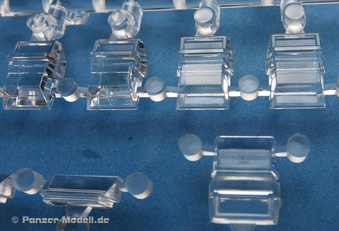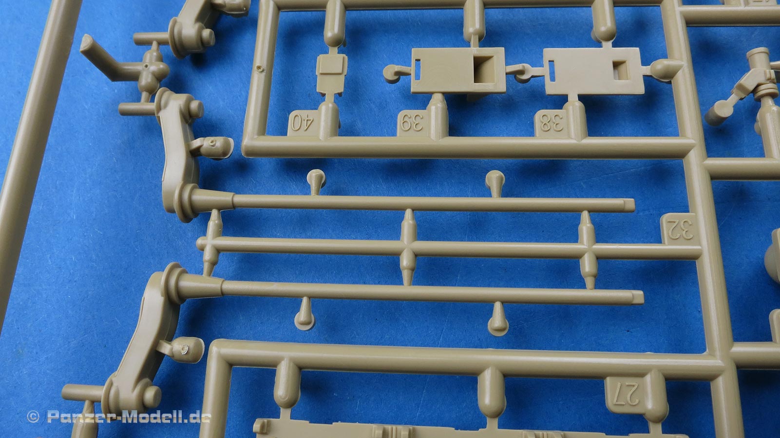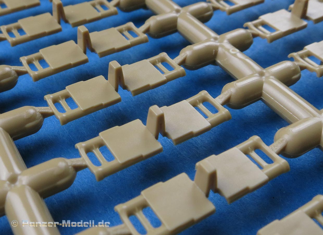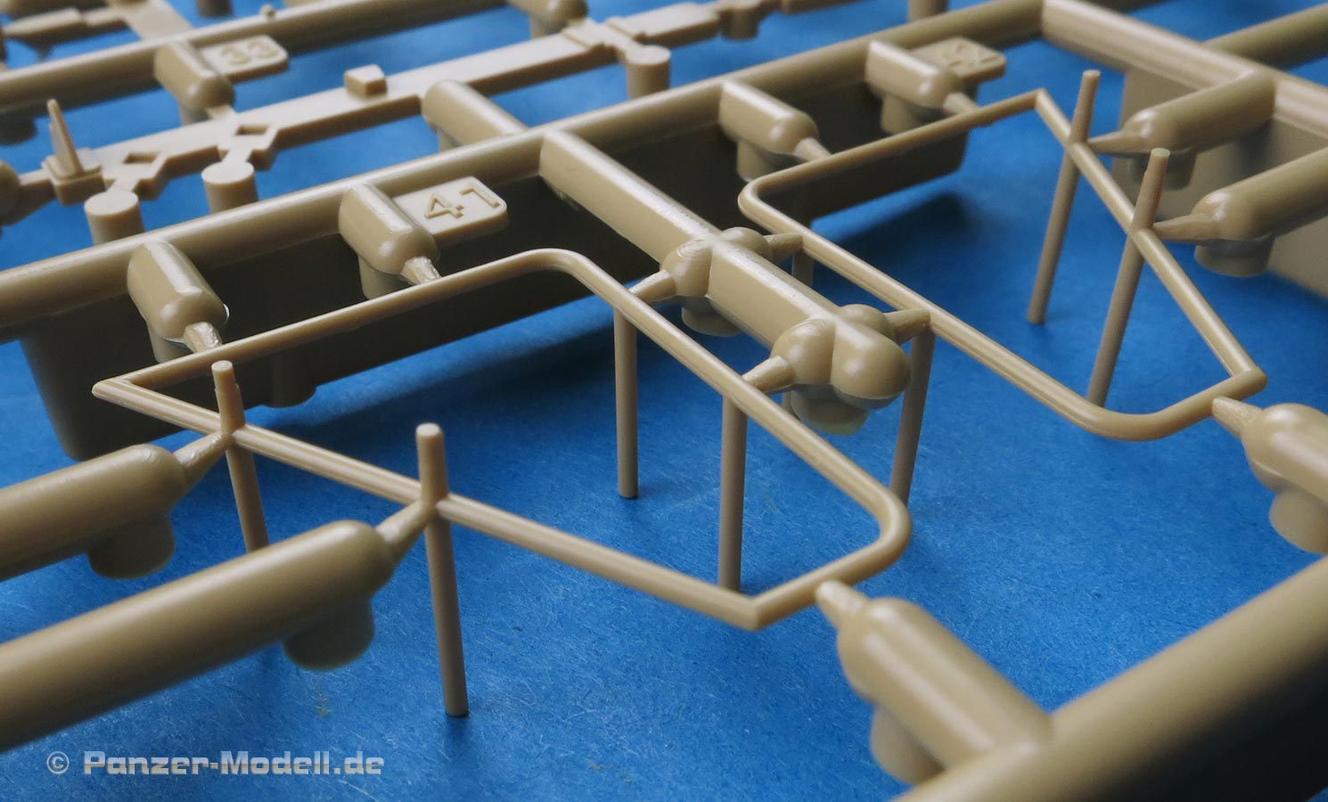 Bei grober Durchsicht der Teile stellt man erfreut wieder eine sehr hohe Qualität der Spritzgussteile fest mit feinen und scharfen Details, wenig störenden Auswerfermarken und keine Fischhaut, Sinkstellen oder Formversätze.