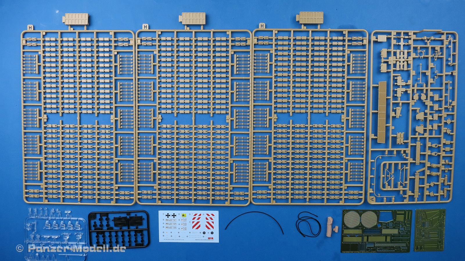Hier finden wir 15 beige Spritzlinge, einen transparenten Spritzling, einen Vinylspritzling, die Oberwanne, das Turmoberteil, Seilmaterial, 2 3D Druckteile, zwei PE Platinen und einen Decalbogen. Ein kleiner Spritzling und die kleine Platine gehören allerdings nur in der ersten Produktionsserie zum Lieferumfang.