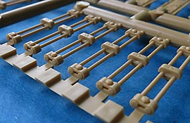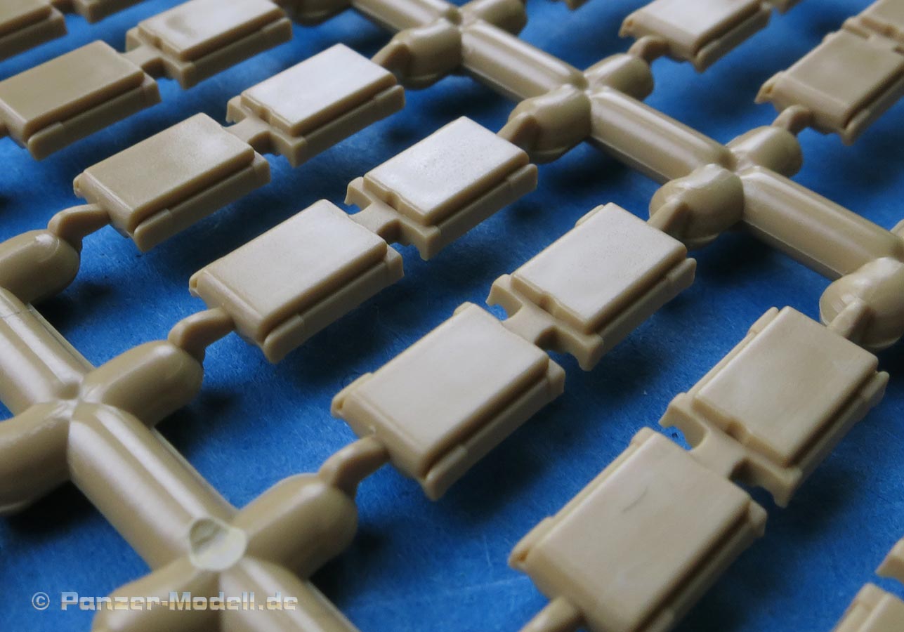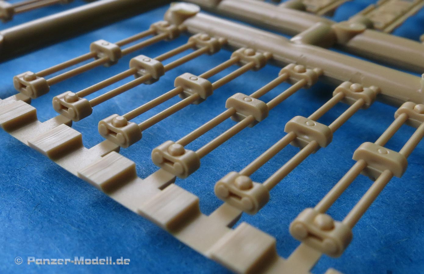 Und das macht hier natürlich absolut Sinn, denn die Ketten, die Ryefield dem Bausatz spendiert lassen sich ebenfalls beweglich bauen. Dabei greift Ryefield auf das bewährte Kettensystem zurück, bei dem die Doppelbolzen mit Mittel und Endverbinder in einem Stück zwischen jeweils zwei Unter- und Oberteile der Kettenkörper eingeklemmt werden und die Glieder daurch realistisch beweglich bleiben. Die Qualität der Ketten ist hervorragend - sauber und fehlerfrei gespritzt, keine Auswerferstellen und sehr schöne Details wie den von vorn nach hinten offenen Führungszähnen oder den Bolzendarstellungen an Mittel und Endverbindern.