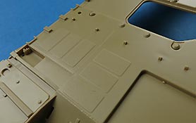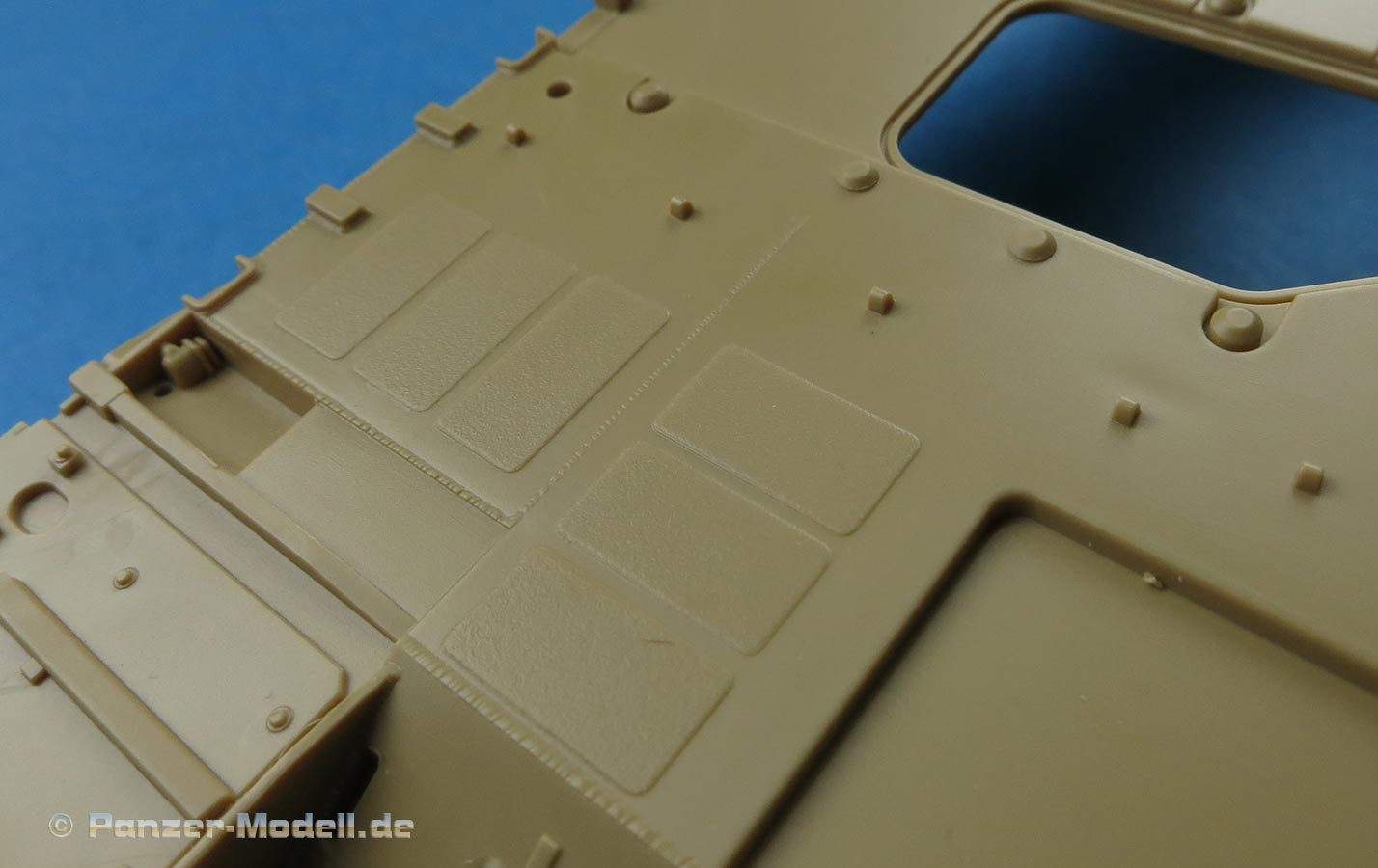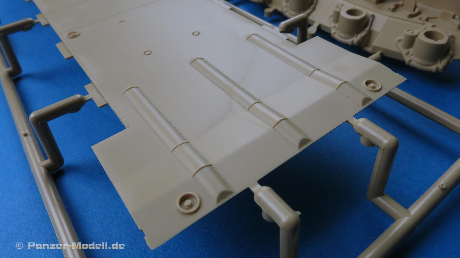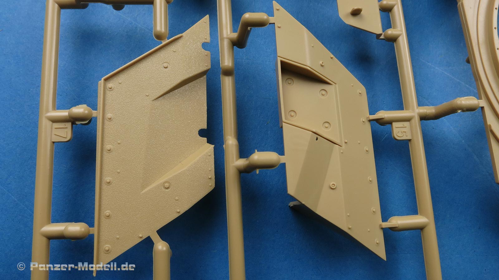 Die Seitenteile weisen zwar die Zusatzpanzerungselemente an den Wannenseiten im Laufwerk auf, aber irgendwie fehlen hier die Befestigungsbolzen. Und die extra geschützten Anschlagdämpfer scheinen zu fehlen. Man sieht diese bei angebrachten Schürzen aber tatsächlich kaum, aber schon irgendwie erstaunlich, dass das vergessen wurde, zumal der Bausatz die Möglichkeit bietet die schweren Kettenschürzen auch hochgeklappt darzustellen.