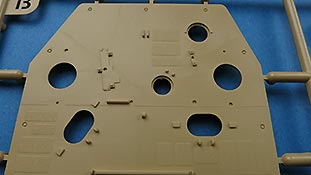 Das Laufwerk ist mit Schwingarmen, die glücklicherweise mit den Drehstäben einteilig dargestellt sind, einzeln in die Wanne einzustecken und dann, wie es sich für einen hochklassigen Bausatz gehört, entweder mit starrem Laufwerk baubar, oder wahlweise durch das abtrennen der Passnippel auch mit funktionsfähiger Federung.