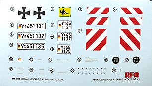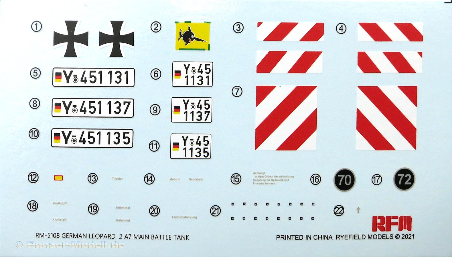 Ebenfalls positiv vermerken muss man hier, dass der Decalbogen soweit ausgestattet ist, dass selbst die kleinen Zahlen an den Nebelwurfbechern und die Wartungshinweise un Markierungen auf dem Motordeck enthalten sind - damit rundet der Decalsatz diesen Bausatz perfekt ab.