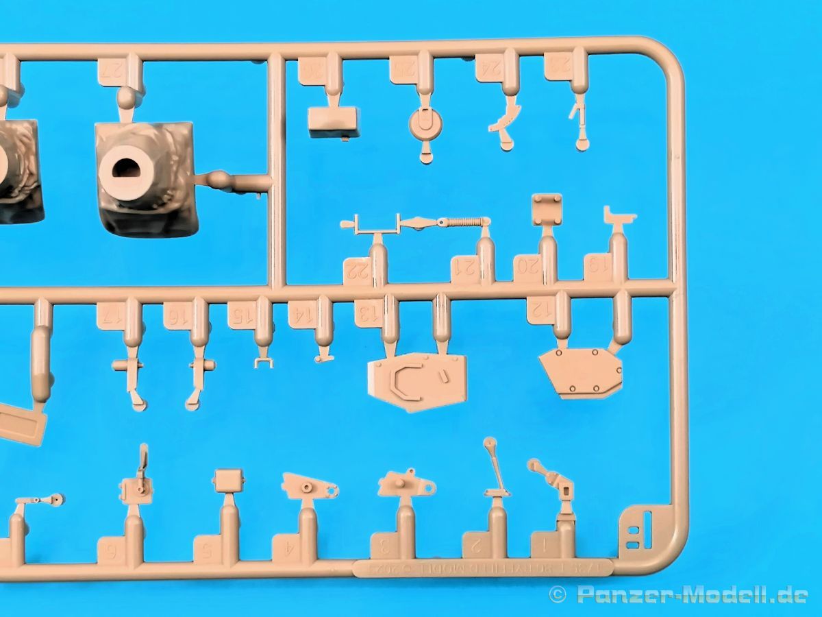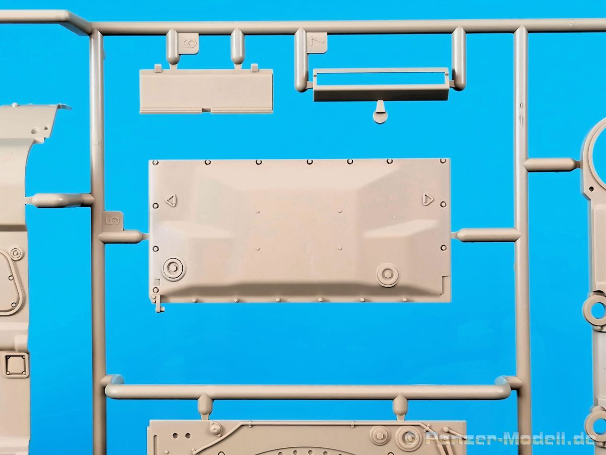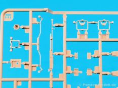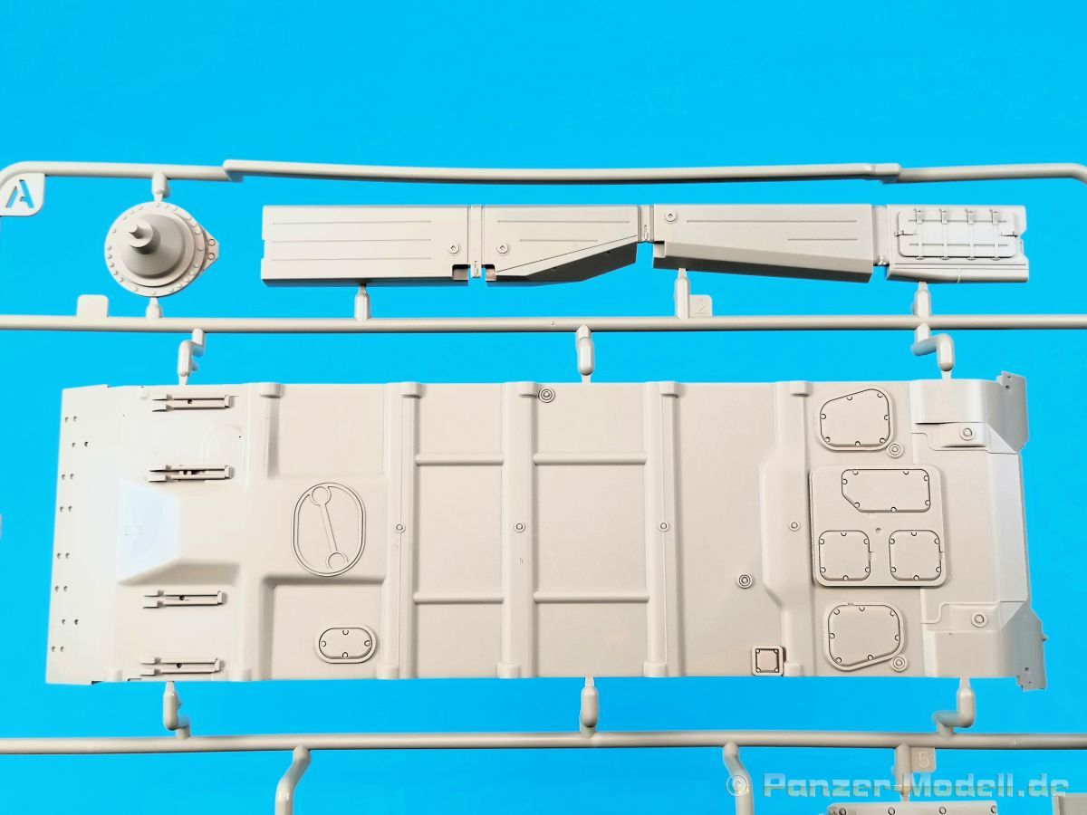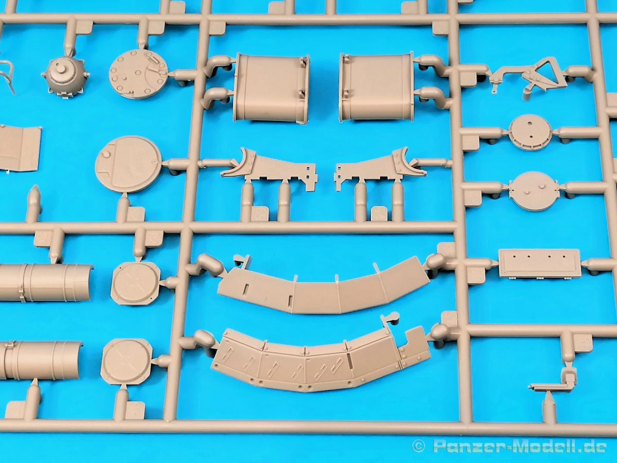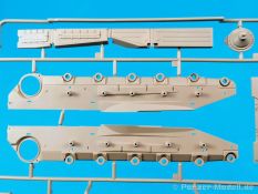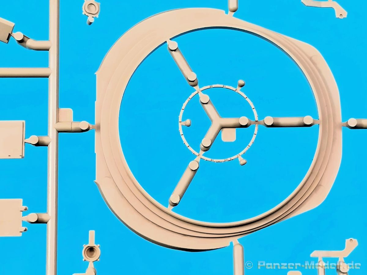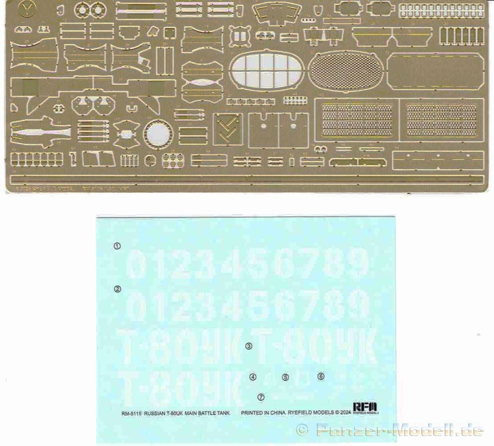 Der letzte Kampfpanzer, der noch vor ihrem Zerfall in der Sowjetunion entworfen und in größeren Stückzahlen gebaut wurde, war der T-80. Dieser war eine Weiterentwicklung des problembehafteten T-64. Mitte der 90er Jahre wurde die Produktion zugunsten des T-90 eingestellt. Allerdings wurde im September 2023 die Wiederaufnahme der Produktion in Omsk angekündigt. In der Version UK wurde zusätzliche Ausrüstung verbaut um den Panzer als Befehlsfahrzeug einsetzten zu können, allerdings zu Lasten des Munitionsvorrats der damit geringer ausfiel. Das ganze Bundle kommt sicher verpackt in einem Top Opener auf unsere Basteltische, versehen mit einer recht gut gemachten Grafik. Enthalten sind acht Rahmen mit diversen Bauteilen die in einem sandfarbenen Ton gespritzt sind. Im gleichen Ton kommt die zugehörige Turmkuppel. In Schwarz ausgelegt sind zwei Rahmen mit den Kettengliedern und den Kettenführungszähnen. Vier Stränge, aus einem vinylähnlichem Material halten die Endverbinder der Kette bereit. Doch dazu weiter unten mehr. Mit einer PE-Platine, einem Decalbogen, Seilmaterial und Klarsichtteilen werden die Komponenten des Kits vervollständigt. Letztendlich noch die Bauanleitung die mit 22 Seiten aufwartet. Schon auf den ersten Blick wird klar, das hier erneut spritzgußtechnisch auf absolut höchsten Niveau gearbeitet wurde. Es ist egal welchen Spritzling oder welches Bauteil man genauer ansieht… Alles ist sehr scharf und absolut sauber dargestellt. Flash, Auswerfer in sichtbaren Bereichen oder Verzug konnte bei dem mir vorliegenden Muster keiner festgestellt werden. Die Filigranität erreicht auch bei den kleinsten Teilen eine spitzenmäßige Güte. Hier ist alles in erstklassiger Form wiedergegeben; auch in den Bereichen, die sich später dem Auge des Betrachters entziehen. Nieten, Bolzen, Federn sowie kleinste Teile sind randscharf gegossen und überzeugen auf der ganzen Linie. Die Bauanleitung, im üblichen Stil von RFM und im DIN A4 Format gehalten, führt den Modellbauer in 30 Schritten zum Ziel. Ebenfalls wie mittlerweile üblich sind die Anleitungen z.T. farblich abgesetzt. Mit Rot hinterlegt sind Flächen die mit Klebstoff versehen werden, mit Gelb werden Ätzteile definiert und mit Blau erscheinen immer wieder Komponenten die bereits verbaut sind. Untergruppen zu den einzelnen Abschnitten finden sich immer wieder. Nur selten erscheinen die Bauschritte etwas mit Bauteilen überfrachtet. Die Angaben zum Bau sind gut erstellt und sollten keine Fragen aufwerfen. Der Bau des Panzers startet mit der Montage der dreiteiligen Panzerwanne bei der man Wert auf eine exakte Passung legen sollte da sich Fehler in diesem Bereich durch den restlichen Bau ziehen könnten. Bestückt wird die Wanne mit allen weiteren Komponenten die sich hier wiederfinden; Stoßdämper, Achslager, Kettenspanner und so fort, bis hin zu den Ketten, die in Baustufe 9 aufgezogen werden. Interessant ist die Montage und der Bau der Ketten, für die entsprechende Lehren beiliegen, definitiv. Laut Bauanleitung wird kein Klebstoff verwendet. Zuerst werden die Führungszähne jeweils zwischen die Kettenpolster eingebracht. Durch die Bauweise bleiben diese dann zwischen den Kettenpolstern eingeklemmt. Um alles abzusichern sind nur noch die Endverbinder aufzustecken. Das passiert ebenfalls mit einer beiliegenden Lehre und sichert die Kette im Anschluß durch die gummiartige Konsistenz der Endverbinder vor einem Auseinderfallen… Zugegeben, eine etwas sicherlich aufwändige Arbeit. Davon ab, man erhält in sich stimmige und zudem bewegliche Kettentrümmer. Im Hinblick auf das beweglich zu bauende Laufwerk sicherlich ein Pluspunkt. Der weitere Bau gestaltet sich dann wieder unproblematisch. Mit der Montage der Oberwanne und vieler weiterer Kleinteile sowie den Schutzblechen incl. Anbauteilen ist schon mal die halbe Miete gezahlt. Löblich ist die Tatsache das uns immer wieder zusätzliche Grafiken begegnen, die zusätzlich genaue Lagen von Teilen angeben. Der Turm, gänzlich ohne Innenleben schließt den Bau ab. Immerhin neun Baustufen sind vorgesehen. Eine relativ hohe Menge von Bauteilen, die sehr detailreich sind, ist zu verarbeiten. Zur Anwendung kommt ebenfalls der Haupteil der PEs. Das Rohr, einteilig, ist lediglich von der kaum wahrnehmbaren Trennnaht zu befreien. Die offene Mündung, im Slide-Mould Verfahren hergestellt kann ebenfalls punkten. Selbiges gilt auch für die Sekundärbewaffnung, die sich ebenfalls hervorragend zeigt. Auf Seite 22 werden uns noch zwei Bemalvorschläge präsentiert, wie mittlerweile schon Usus bei RFM ohne großartig weiterführende Farbangaben. Die angegebenen Nummern deuten auf Farben der Reihe Mr.Color hin. Schade. Allerdings dürften die geneigten Modellbauer die Farben ihrer Wahl schon in Griffweite haben… Der Decalbogen ist sauber und matt gedruckt. Auf jeden Fall haben wir es hier mit einem hochkomplexen, äußerst detailreichen und filigranen Kit zu tun, der eher etwas für erfahrene Anwender und Experten ist.
