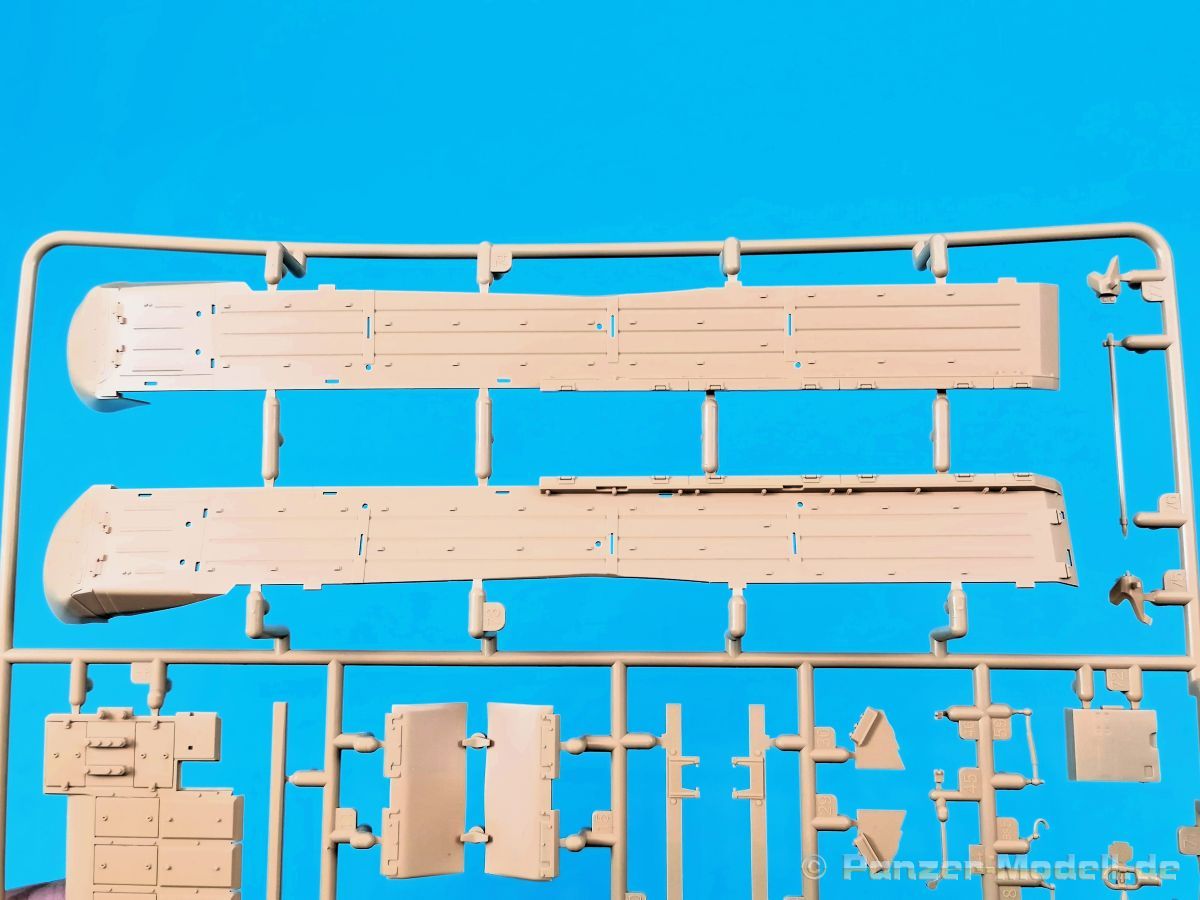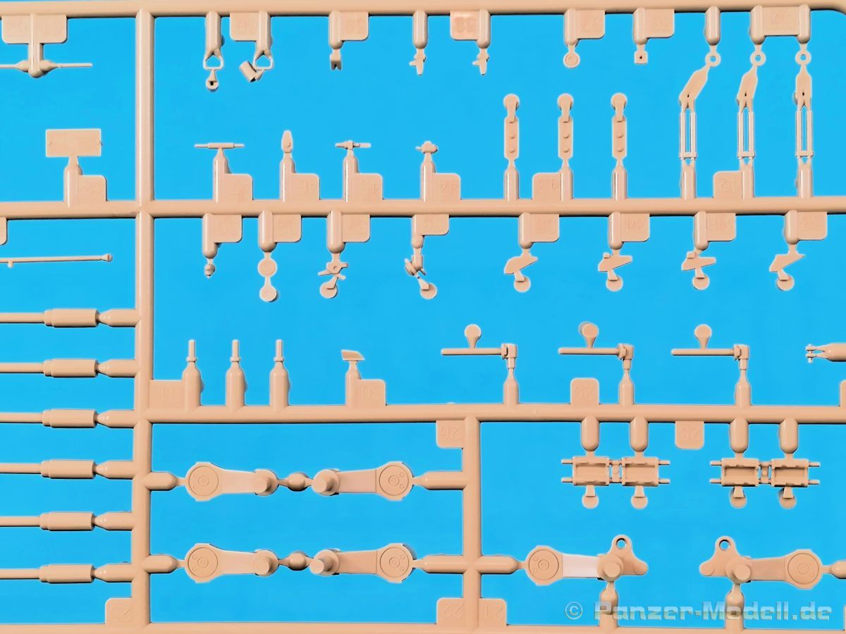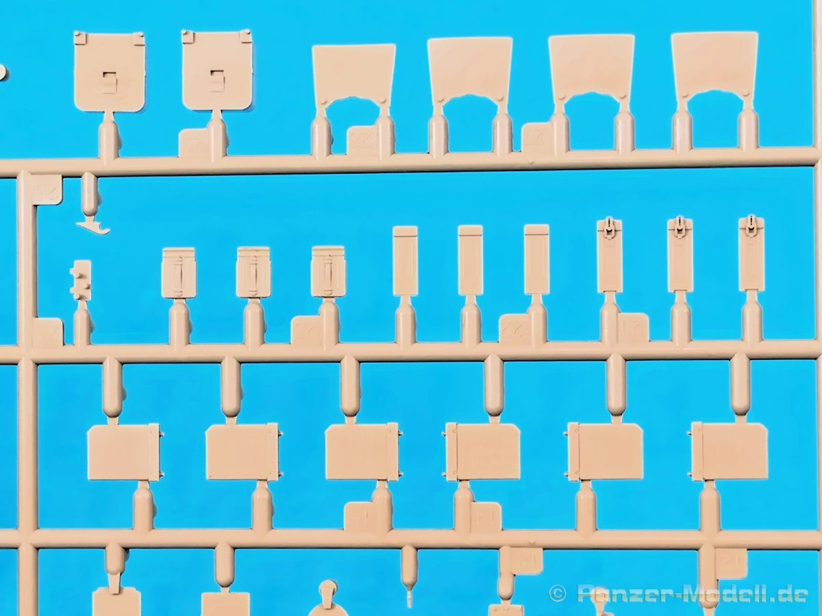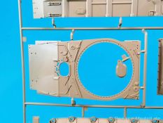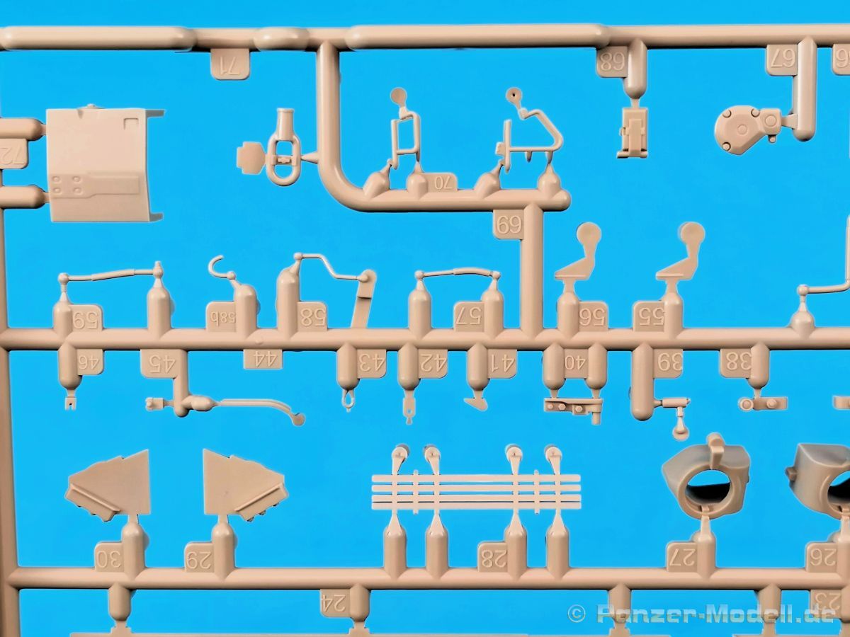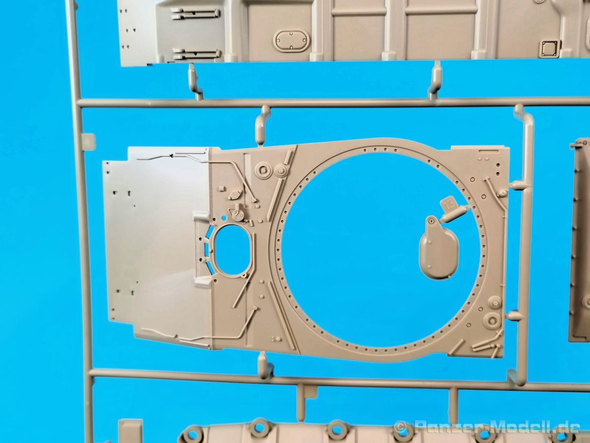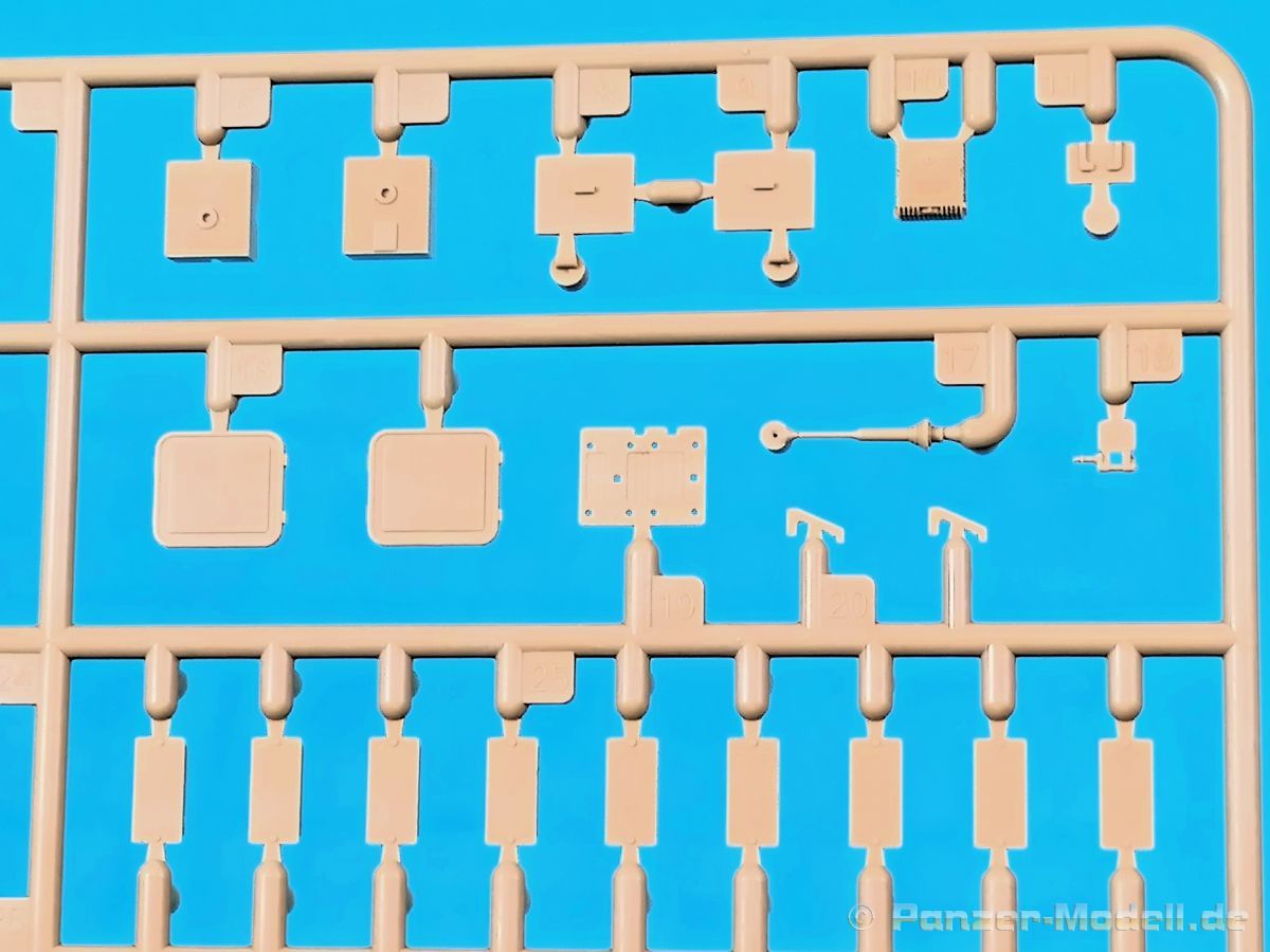 Der letzte Kampfpanzer, der noch vor ihrem Zerfall in der Sowjetunion entworfen und in größeren Stückzahlen gebaut wurde, war der T-80. Dieser war eine Weiterentwicklung des problembehafteten T-64. Mitte der 90er Jahre wurde die Produktion zugunsten des T-90 eingestellt. Allerdings wurde im September 2023 die Wiederaufnahme der Produktion in Omsk angekündigt. In der Version UK wurde zusätzliche Ausrüstung verbaut um den Panzer als Befehlsfahrzeug einsetzten zu können, allerdings zu Lasten des Munitionsvorrats der damit geringer ausfiel. Das ganze Bundle kommt sicher verpackt in einem Top Opener auf unsere Basteltische, versehen mit einer recht gut gemachten Grafik. Enthalten sind acht Rahmen mit diversen Bauteilen die in einem sandfarbenen Ton gespritzt sind. Im gleichen Ton kommt die zugehörige Turmkuppel. In Schwarz ausgelegt sind zwei Rahmen mit den Kettengliedern und den Kettenführungszähnen. Vier Stränge, aus einem vinylähnlichem Material halten die Endverbinder der Kette bereit. Doch dazu weiter unten mehr. Mit einer PE-Platine, einem Decalbogen, Seilmaterial und Klarsichtteilen werden die Komponenten des Kits vervollständigt. Letztendlich noch die Bauanleitung die mit 22 Seiten aufwartet. Schon auf den ersten Blick wird klar, das hier erneut spritzgußtechnisch auf absolut höchsten Niveau gearbeitet wurde. Es ist egal welchen Spritzling oder welches Bauteil man genauer ansieht… Alles ist sehr scharf und absolut sauber dargestellt. Flash, Auswerfer in sichtbaren Bereichen oder Verzug konnte bei dem mir vorliegenden Muster keiner festgestellt werden. Die Filigranität erreicht auch bei den kleinsten Teilen eine spitzenmäßige Güte. Hier ist alles in erstklassiger Form wiedergegeben; auch in den Bereichen, die sich später dem Auge des Betrachters entziehen. Nieten, Bolzen, Federn sowie kleinste Teile sind randscharf gegossen und überzeugen auf der ganzen Linie. Die Bauanleitung, im üblichen Stil von RFM und im DIN A4 Format gehalten, führt den Modellbauer in 30 Schritten zum Ziel. Ebenfalls wie mittlerweile üblich sind die Anleitungen z.T. farblich abgesetzt. Mit Rot hinterlegt sind Flächen die mit Klebstoff versehen werden, mit Gelb werden Ätzteile definiert und mit Blau erscheinen immer wieder Komponenten die bereits verbaut sind. Untergruppen zu den einzelnen Abschnitten finden sich immer wieder. Nur selten erscheinen die Bauschritte etwas mit Bauteilen überfrachtet. Die Angaben zum Bau sind gut erstellt und sollten keine Fragen aufwerfen. Der Bau des Panzers startet mit der Montage der dreiteiligen Panzerwanne bei der man Wert auf eine exakte Passung legen sollte da sich Fehler in diesem Bereich durch den restlichen Bau ziehen könnten. Bestückt wird die Wanne mit allen weiteren Komponenten die sich hier wiederfinden; Stoßdämper, Achslager, Kettenspanner und so fort, bis hin zu den Ketten, die in Baustufe 9 aufgezogen werden. Interessant ist die Montage und der Bau der Ketten, für die entsprechende Lehren beiliegen, definitiv. Laut Bauanleitung wird kein Klebstoff verwendet. Zuerst werden die Führungszähne jeweils zwischen die Kettenpolster eingebracht. Durch die Bauweise bleiben diese dann zwischen den Kettenpolstern eingeklemmt. Um alles abzusichern sind nur noch die Endverbinder aufzustecken. Das passiert ebenfalls mit einer beiliegenden Lehre und sichert die Kette im Anschluß durch die gummiartige Konsistenz der Endverbinder vor einem Auseinderfallen… Zugegeben, eine etwas sicherlich aufwändige Arbeit. Davon ab, man erhält in sich stimmige und zudem bewegliche Kettentrümmer. Im Hinblick auf das beweglich zu bauende Laufwerk sicherlich ein Pluspunkt. Der weitere Bau gestaltet sich dann wieder unproblematisch. Mit der Montage der Oberwanne und vieler weiterer Kleinteile sowie den Schutzblechen incl. Anbauteilen ist schon mal die halbe Miete gezahlt. Löblich ist die Tatsache das uns immer wieder zusätzliche Grafiken begegnen, die zusätzlich genaue Lagen von Teilen angeben. Der Turm, gänzlich ohne Innenleben schließt den Bau ab. Immerhin neun Baustufen sind vorgesehen. Eine relativ hohe Menge von Bauteilen, die sehr detailreich sind, ist zu verarbeiten. Zur Anwendung kommt ebenfalls der Haupteil der PEs. Das Rohr, einteilig, ist lediglich von der kaum wahrnehmbaren Trennnaht zu befreien. Die offene Mündung, im Slide-Mould Verfahren hergestellt kann ebenfalls punkten. Selbiges gilt auch für die Sekundärbewaffnung, die sich ebenfalls hervorragend zeigt. Auf Seite 22 werden uns noch zwei Bemalvorschläge präsentiert, wie mittlerweile schon Usus bei RFM ohne großartig weiterführende Farbangaben. Die angegebenen Nummern deuten auf Farben der Reihe Mr.Color hin. Schade. Allerdings dürften die geneigten Modellbauer die Farben ihrer Wahl schon in Griffweite haben… Der Decalbogen ist sauber und matt gedruckt. Auf jeden Fall haben wir es hier mit einem hochkomplexen, äußerst detailreichen und filigranen Kit zu tun, der eher etwas für erfahrene Anwender und Experten ist.