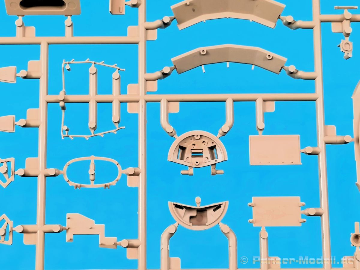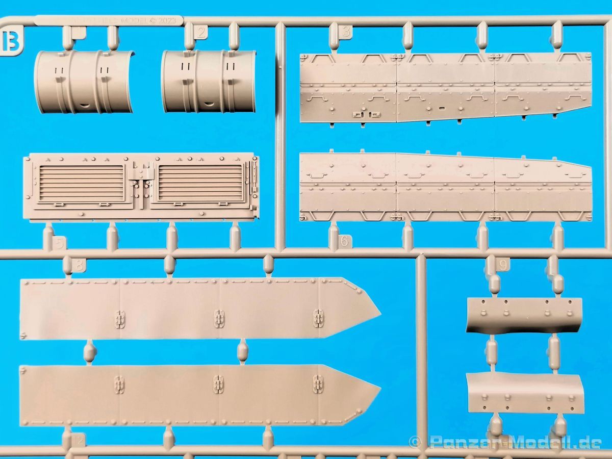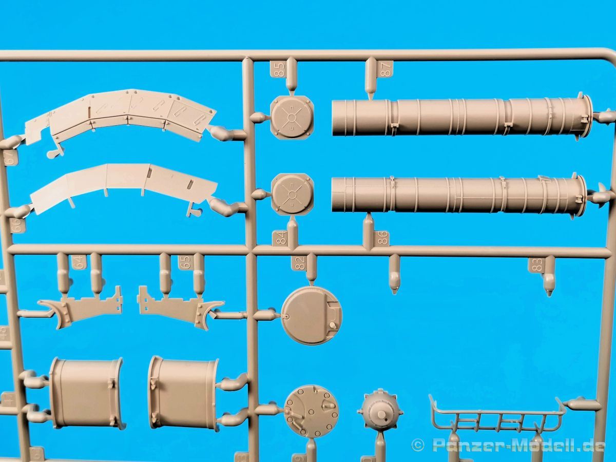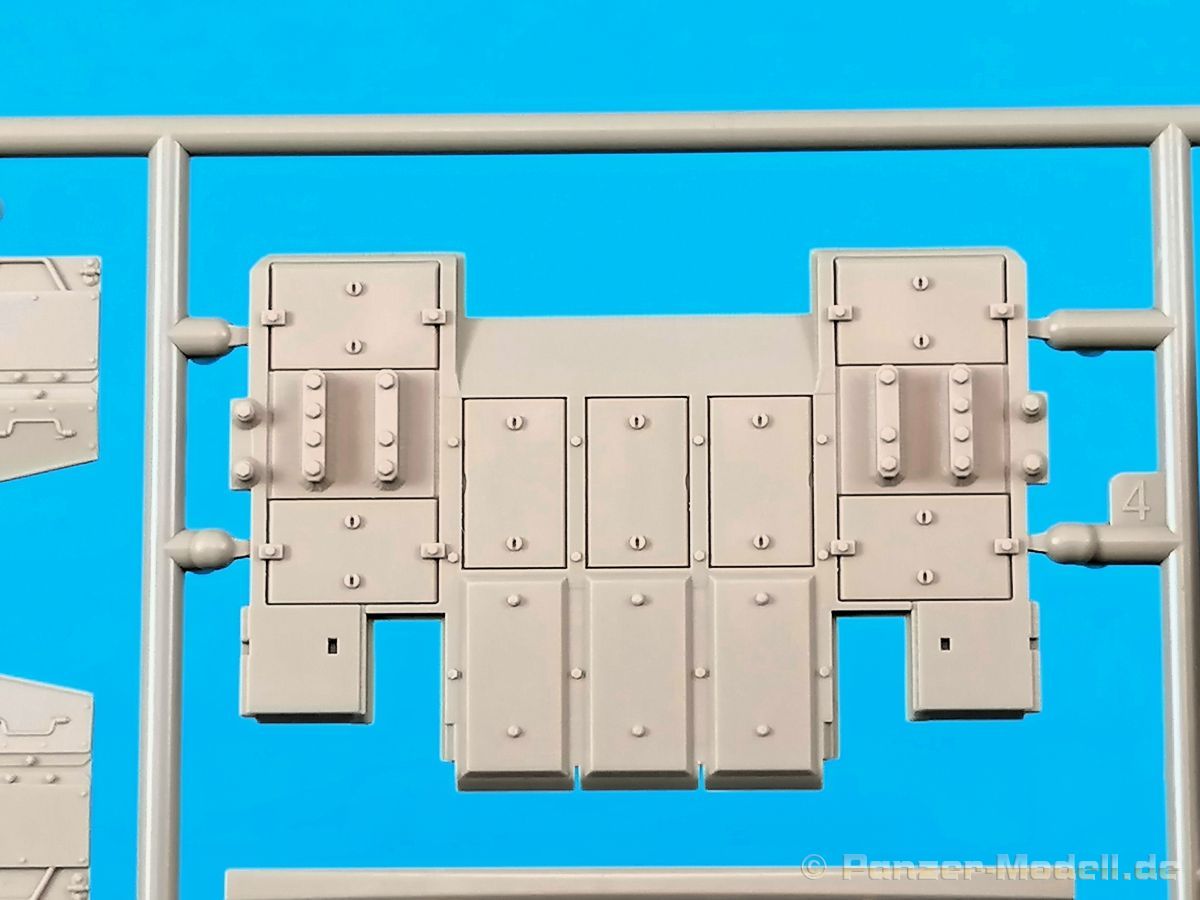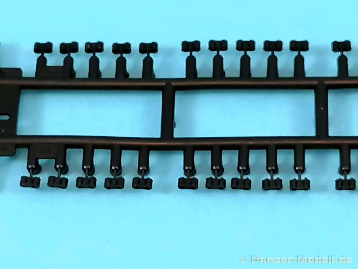 Der letzte Kampfpanzer, der noch vor ihrem Zerfall in der Sowjetunion entworfen und in größeren Stückzahlen gebaut wurde, war der T-80. Dieser war eine Weiterentwicklung des problembehafteten T-64. Mitte der 90er Jahre wurde die Produktion zugunsten des T-90 eingestellt. Allerdings wurde im September 2023 die Wiederaufnahme der Produktion in Omsk angekündigt. In der Version UK wurde zusätzliche Ausrüstung verbaut um den Panzer als Befehlsfahrzeug einsetzten zu können, allerdings zu Lasten des Munitionsvorrats der damit geringer ausfiel. Das ganze Bundle kommt sicher verpackt in einem Top Opener auf unsere Basteltische, versehen mit einer recht gut gemachten Grafik. Enthalten sind acht Rahmen mit diversen Bauteilen die in einem sandfarbenen Ton gespritzt sind. Im gleichen Ton kommt die zugehörige Turmkuppel. In Schwarz ausgelegt sind zwei Rahmen mit den Kettengliedern und den Kettenführungszähnen. Vier Stränge, aus einem vinylähnlichem Material halten die Endverbinder der Kette bereit. Doch dazu weiter unten mehr. Mit einer PE-Platine, einem Decalbogen, Seilmaterial und Klarsichtteilen werden die Komponenten des Kits vervollständigt. Letztendlich noch die Bauanleitung die mit 22 Seiten aufwartet. Schon auf den ersten Blick wird klar, das hier erneut spritzgußtechnisch auf absolut höchsten Niveau gearbeitet wurde. Es ist egal welchen Spritzling oder welches Bauteil man genauer ansieht… Alles ist sehr scharf und absolut sauber dargestellt. Flash, Auswerfer in sichtbaren Bereichen oder Verzug konnte bei dem mir vorliegenden Muster keiner festgestellt werden. Die Filigranität erreicht auch bei den kleinsten Teilen eine spitzenmäßige Güte. Hier ist alles in erstklassiger Form wiedergegeben; auch in den Bereichen, die sich später dem Auge des Betrachters entziehen. Nieten, Bolzen, Federn sowie kleinste Teile sind randscharf gegossen und überzeugen auf der ganzen Linie. Die Bauanleitung, im üblichen Stil von RFM und im DIN A4 Format gehalten, führt den Modellbauer in 30 Schritten zum Ziel. Ebenfalls wie mittlerweile üblich sind die Anleitungen z.T. farblich abgesetzt. Mit Rot hinterlegt sind Flächen die mit Klebstoff versehen werden, mit Gelb werden Ätzteile definiert und mit Blau erscheinen immer wieder Komponenten die bereits verbaut sind. Untergruppen zu den einzelnen Abschnitten finden sich immer wieder. Nur selten erscheinen die Bauschritte etwas mit Bauteilen überfrachtet. Die Angaben zum Bau sind gut erstellt und sollten keine Fragen aufwerfen. Der Bau des Panzers startet mit der Montage der dreiteiligen Panzerwanne bei der man Wert auf eine exakte Passung legen sollte da sich Fehler in diesem Bereich durch den restlichen Bau ziehen könnten. Bestückt wird die Wanne mit allen weiteren Komponenten die sich hier wiederfinden; Stoßdämper, Achslager, Kettenspanner und so fort, bis hin zu den Ketten, die in Baustufe 9 aufgezogen werden. Interessant ist die Montage und der Bau der Ketten, für die entsprechende Lehren beiliegen, definitiv. Laut Bauanleitung wird kein Klebstoff verwendet. Zuerst werden die Führungszähne jeweils zwischen die Kettenpolster eingebracht. Durch die Bauweise bleiben diese dann zwischen den Kettenpolstern eingeklemmt. Um alles abzusichern sind nur noch die Endverbinder aufzustecken. Das passiert ebenfalls mit einer beiliegenden Lehre und sichert die Kette im Anschluß durch die gummiartige Konsistenz der Endverbinder vor einem Auseinderfallen… Zugegeben, eine etwas sicherlich aufwändige Arbeit. Davon ab, man erhält in sich stimmige und zudem bewegliche Kettentrümmer. Im Hinblick auf das beweglich zu bauende Laufwerk sicherlich ein Pluspunkt. Der weitere Bau gestaltet sich dann wieder unproblematisch. Mit der Montage der Oberwanne und vieler weiterer Kleinteile sowie den Schutzblechen incl. Anbauteilen ist schon mal die halbe Miete gezahlt. Löblich ist die Tatsache das uns immer wieder zusätzliche Grafiken begegnen, die zusätzlich genaue Lagen von Teilen angeben. Der Turm, gänzlich ohne Innenleben schließt den Bau ab. Immerhin neun Baustufen sind vorgesehen. Eine relativ hohe Menge von Bauteilen, die sehr detailreich sind, ist zu verarbeiten. Zur Anwendung kommt ebenfalls der Haupteil der PEs. Das Rohr, einteilig, ist lediglich von der kaum wahrnehmbaren Trennnaht zu befreien. Die offene Mündung, im Slide-Mould Verfahren hergestellt kann ebenfalls punkten. Selbiges gilt auch für die Sekundärbewaffnung, die sich ebenfalls hervorragend zeigt. Auf Seite 22 werden uns noch zwei Bemalvorschläge präsentiert, wie mittlerweile schon Usus bei RFM ohne großartig weiterführende Farbangaben. Die angegebenen Nummern deuten auf Farben der Reihe Mr.Color hin. Schade. Allerdings dürften die geneigten Modellbauer die Farben ihrer Wahl schon in Griffweite haben… Der Decalbogen ist sauber und matt gedruckt. Auf jeden Fall haben wir es hier mit einem hochkomplexen, äußerst detailreichen und filigranen Kit zu tun, der eher etwas für erfahrene Anwender und Experten ist.