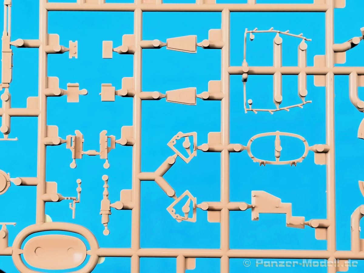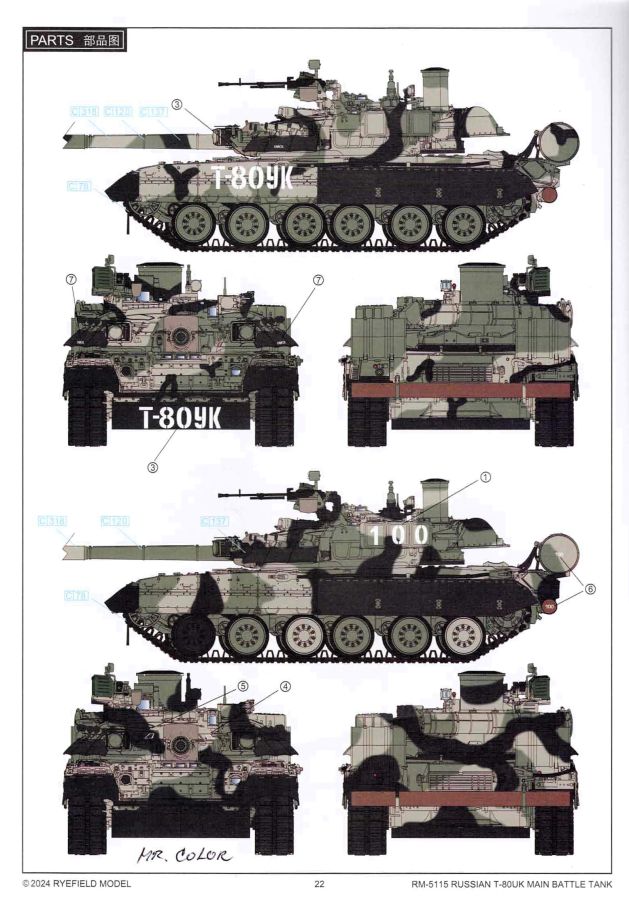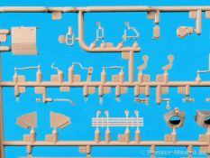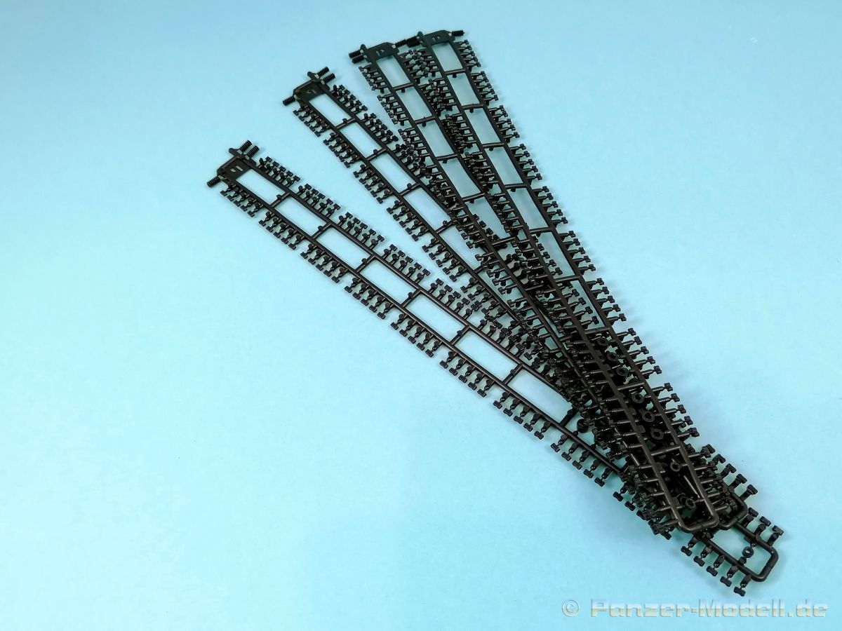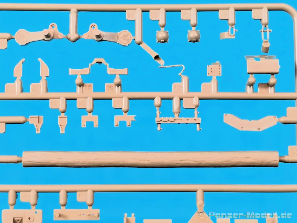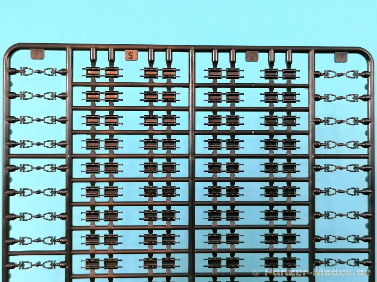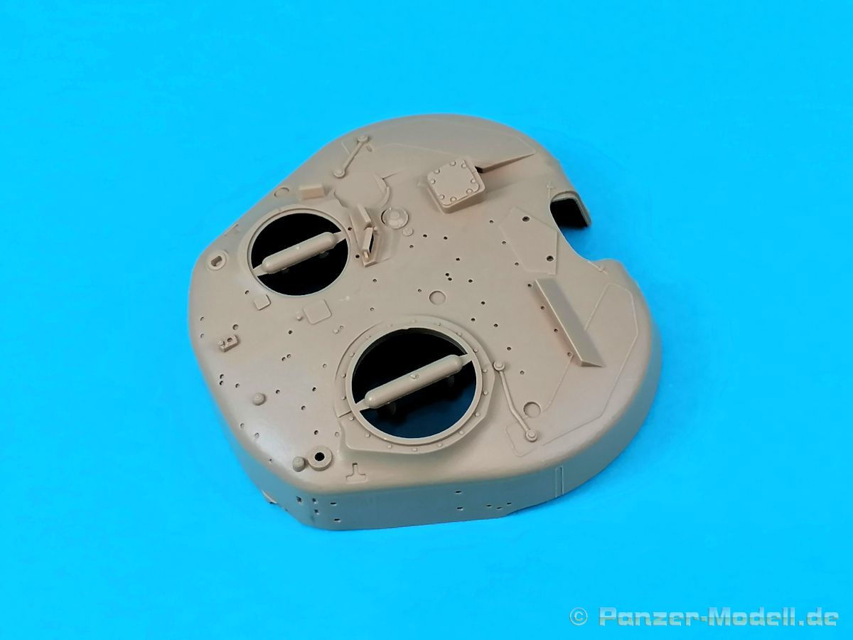 Der letzte Kampfpanzer, der noch vor ihrem Zerfall in der Sowjetunion entworfen und in größeren Stückzahlen gebaut wurde, war der T-80. Dieser war eine Weiterentwicklung des problembehafteten T-64. Mitte der 90er Jahre wurde die Produktion zugunsten des T-90 eingestellt. Allerdings wurde im September 2023 die Wiederaufnahme der Produktion in Omsk angekündigt. In der Version UK wurde zusätzliche Ausrüstung verbaut um den Panzer als Befehlsfahrzeug einsetzten zu können, allerdings zu Lasten des Munitionsvorrats der damit geringer ausfiel. Das ganze Bundle kommt sicher verpackt in einem Top Opener auf unsere Basteltische, versehen mit einer recht gut gemachten Grafik. Enthalten sind acht Rahmen mit diversen Bauteilen die in einem sandfarbenen Ton gespritzt sind. Im gleichen Ton kommt die zugehörige Turmkuppel. In Schwarz ausgelegt sind zwei Rahmen mit den Kettengliedern und den Kettenführungszähnen. Vier Stränge, aus einem vinylähnlichem Material halten die Endverbinder der Kette bereit. Doch dazu weiter unten mehr. Mit einer PE-Platine, einem Decalbogen, Seilmaterial und Klarsichtteilen werden die Komponenten des Kits vervollständigt. Letztendlich noch die Bauanleitung die mit 22 Seiten aufwartet. Schon auf den ersten Blick wird klar, das hier erneut spritzgußtechnisch auf absolut höchsten Niveau gearbeitet wurde. Es ist egal welchen Spritzling oder welches Bauteil man genauer ansieht… Alles ist sehr scharf und absolut sauber dargestellt. Flash, Auswerfer in sichtbaren Bereichen oder Verzug konnte bei dem mir vorliegenden Muster keiner festgestellt werden. Die Filigranität erreicht auch bei den kleinsten Teilen eine spitzenmäßige Güte. Hier ist alles in erstklassiger Form wiedergegeben; auch in den Bereichen, die sich später dem Auge des Betrachters entziehen. Nieten, Bolzen, Federn sowie kleinste Teile sind randscharf gegossen und überzeugen auf der ganzen Linie. Die Bauanleitung, im üblichen Stil von RFM und im DIN A4 Format gehalten, führt den Modellbauer in 30 Schritten zum Ziel. Ebenfalls wie mittlerweile üblich sind die Anleitungen z.T. farblich abgesetzt. Mit Rot hinterlegt sind Flächen die mit Klebstoff versehen werden, mit Gelb werden Ätzteile definiert und mit Blau erscheinen immer wieder Komponenten die bereits verbaut sind. Untergruppen zu den einzelnen Abschnitten finden sich immer wieder. Nur selten erscheinen die Bauschritte etwas mit Bauteilen überfrachtet. Die Angaben zum Bau sind gut erstellt und sollten keine Fragen aufwerfen. Der Bau des Panzers startet mit der Montage der dreiteiligen Panzerwanne bei der man Wert auf eine exakte Passung legen sollte da sich Fehler in diesem Bereich durch den restlichen Bau ziehen könnten. Bestückt wird die Wanne mit allen weiteren Komponenten die sich hier wiederfinden; Stoßdämper, Achslager, Kettenspanner und so fort, bis hin zu den Ketten, die in Baustufe 9 aufgezogen werden. Interessant ist die Montage und der Bau der Ketten, für die entsprechende Lehren beiliegen, definitiv. Laut Bauanleitung wird kein Klebstoff verwendet. Zuerst werden die Führungszähne jeweils zwischen die Kettenpolster eingebracht. Durch die Bauweise bleiben diese dann zwischen den Kettenpolstern eingeklemmt. Um alles abzusichern sind nur noch die Endverbinder aufzustecken. Das passiert ebenfalls mit einer beiliegenden Lehre und sichert die Kette im Anschluß durch die gummiartige Konsistenz der Endverbinder vor einem Auseinderfallen… Zugegeben, eine etwas sicherlich aufwändige Arbeit. Davon ab, man erhält in sich stimmige und zudem bewegliche Kettentrümmer. Im Hinblick auf das beweglich zu bauende Laufwerk sicherlich ein Pluspunkt. Der weitere Bau gestaltet sich dann wieder unproblematisch. Mit der Montage der Oberwanne und vieler weiterer Kleinteile sowie den Schutzblechen incl. Anbauteilen ist schon mal die halbe Miete gezahlt. Löblich ist die Tatsache das uns immer wieder zusätzliche Grafiken begegnen, die zusätzlich genaue Lagen von Teilen angeben. Der Turm, gänzlich ohne Innenleben schließt den Bau ab. Immerhin neun Baustufen sind vorgesehen. Eine relativ hohe Menge von Bauteilen, die sehr detailreich sind, ist zu verarbeiten. Zur Anwendung kommt ebenfalls der Haupteil der PEs. Das Rohr, einteilig, ist lediglich von der kaum wahrnehmbaren Trennnaht zu befreien. Die offene Mündung, im Slide-Mould Verfahren hergestellt kann ebenfalls punkten. Selbiges gilt auch für die Sekundärbewaffnung, die sich ebenfalls hervorragend zeigt. Auf Seite 22 werden uns noch zwei Bemalvorschläge präsentiert, wie mittlerweile schon Usus bei RFM ohne großartig weiterführende Farbangaben. Die angegebenen Nummern deuten auf Farben der Reihe Mr.Color hin. Schade. Allerdings dürften die geneigten Modellbauer die Farben ihrer Wahl schon in Griffweite haben… Der Decalbogen ist sauber und matt gedruckt. Auf jeden Fall haben wir es hier mit einem hochkomplexen, äußerst detailreichen und filigranen Kit zu tun, der eher etwas für erfahrene Anwender und Experten ist.
