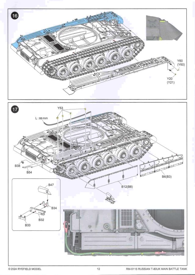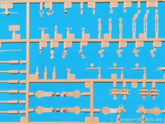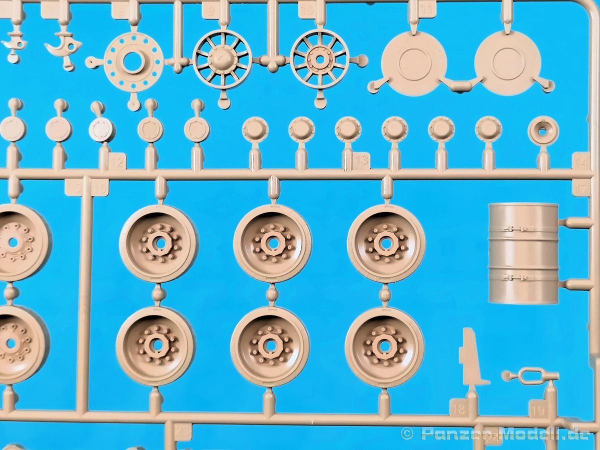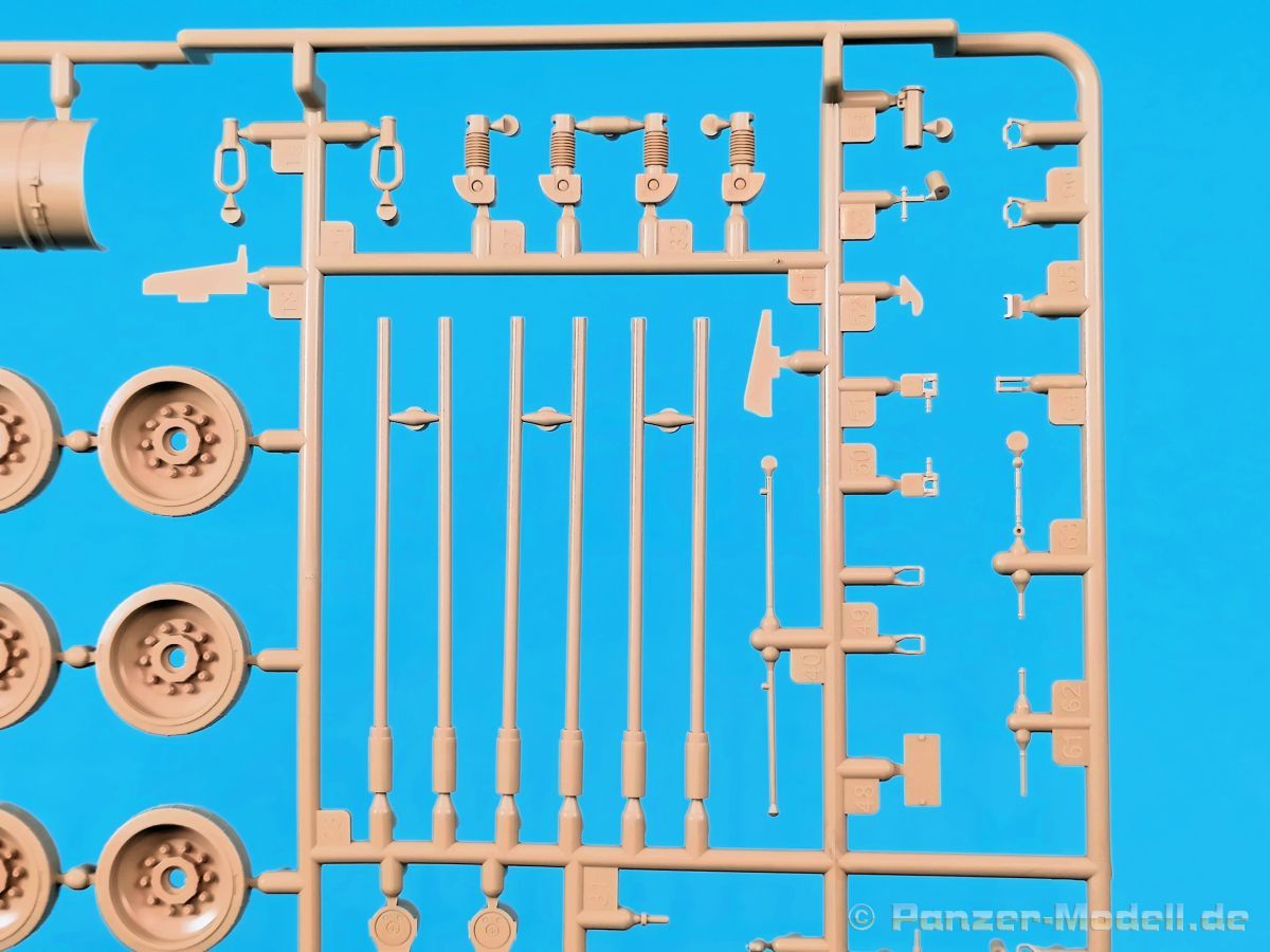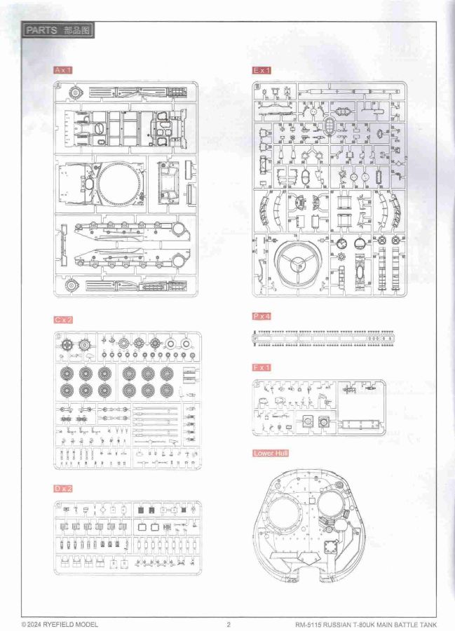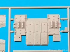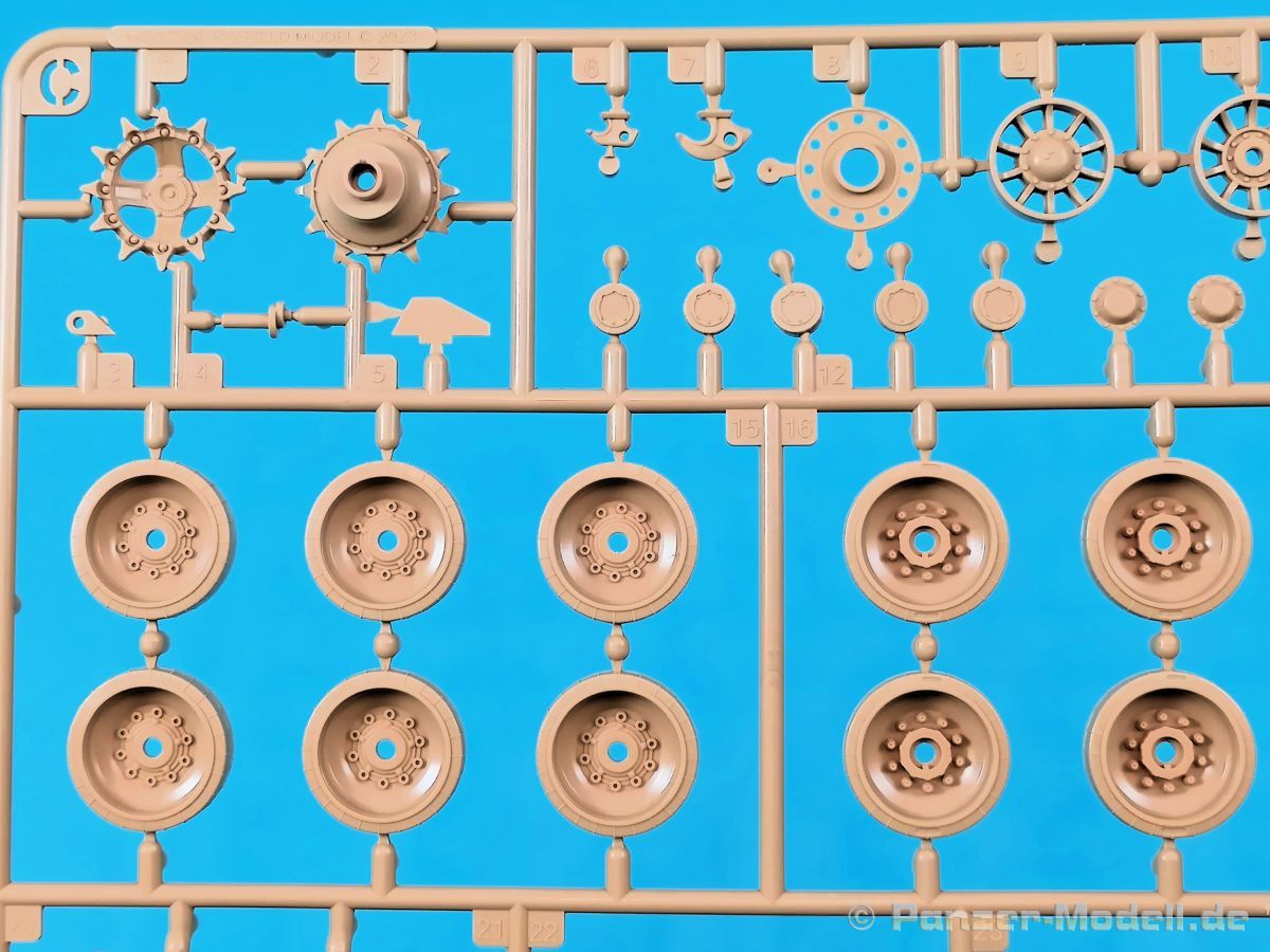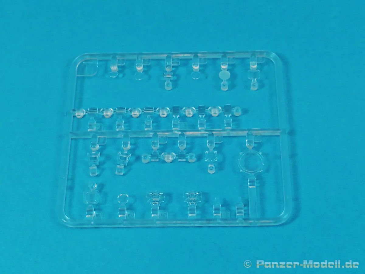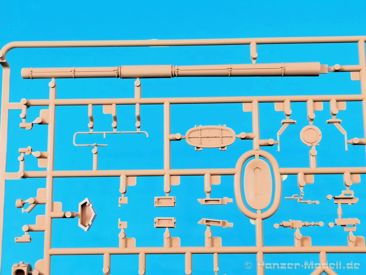 Der letzte Kampfpanzer, der noch vor ihrem Zerfall in der Sowjetunion entworfen und in größeren Stückzahlen gebaut wurde, war der T-80. Dieser war eine Weiterentwicklung des problembehafteten T-64. Mitte der 90er Jahre wurde die Produktion zugunsten des T-90 eingestellt. Allerdings wurde im September 2023 die Wiederaufnahme der Produktion in Omsk angekündigt. In der Version UK wurde zusätzliche Ausrüstung verbaut um den Panzer als Befehlsfahrzeug einsetzten zu können, allerdings zu Lasten des Munitionsvorrats der damit geringer ausfiel. Das ganze Bundle kommt sicher verpackt in einem Top Opener auf unsere Basteltische, versehen mit einer recht gut gemachten Grafik. Enthalten sind acht Rahmen mit diversen Bauteilen die in einem sandfarbenen Ton gespritzt sind. Im gleichen Ton kommt die zugehörige Turmkuppel. In Schwarz ausgelegt sind zwei Rahmen mit den Kettengliedern und den Kettenführungszähnen. Vier Stränge, aus einem vinylähnlichem Material halten die Endverbinder der Kette bereit. Doch dazu weiter unten mehr. Mit einer PE-Platine, einem Decalbogen, Seilmaterial und Klarsichtteilen werden die Komponenten des Kits vervollständigt. Letztendlich noch die Bauanleitung die mit 22 Seiten aufwartet. Schon auf den ersten Blick wird klar, das hier erneut spritzgußtechnisch auf absolut höchsten Niveau gearbeitet wurde. Es ist egal welchen Spritzling oder welches Bauteil man genauer ansieht… Alles ist sehr scharf und absolut sauber dargestellt. Flash, Auswerfer in sichtbaren Bereichen oder Verzug konnte bei dem mir vorliegenden Muster keiner festgestellt werden. Die Filigranität erreicht auch bei den kleinsten Teilen eine spitzenmäßige Güte. Hier ist alles in erstklassiger Form wiedergegeben; auch in den Bereichen, die sich später dem Auge des Betrachters entziehen. Nieten, Bolzen, Federn sowie kleinste Teile sind randscharf gegossen und überzeugen auf der ganzen Linie. Die Bauanleitung, im üblichen Stil von RFM und im DIN A4 Format gehalten, führt den Modellbauer in 30 Schritten zum Ziel. Ebenfalls wie mittlerweile üblich sind die Anleitungen z.T. farblich abgesetzt. Mit Rot hinterlegt sind Flächen die mit Klebstoff versehen werden, mit Gelb werden Ätzteile definiert und mit Blau erscheinen immer wieder Komponenten die bereits verbaut sind. Untergruppen zu den einzelnen Abschnitten finden sich immer wieder. Nur selten erscheinen die Bauschritte etwas mit Bauteilen überfrachtet. Die Angaben zum Bau sind gut erstellt und sollten keine Fragen aufwerfen. Der Bau des Panzers startet mit der Montage der dreiteiligen Panzerwanne bei der man Wert auf eine exakte Passung legen sollte da sich Fehler in diesem Bereich durch den restlichen Bau ziehen könnten. Bestückt wird die Wanne mit allen weiteren Komponenten die sich hier wiederfinden; Stoßdämper, Achslager, Kettenspanner und so fort, bis hin zu den Ketten, die in Baustufe 9 aufgezogen werden. Interessant ist die Montage und der Bau der Ketten, für die entsprechende Lehren beiliegen, definitiv. Laut Bauanleitung wird kein Klebstoff verwendet. Zuerst werden die Führungszähne jeweils zwischen die Kettenpolster eingebracht. Durch die Bauweise bleiben diese dann zwischen den Kettenpolstern eingeklemmt. Um alles abzusichern sind nur noch die Endverbinder aufzustecken. Das passiert ebenfalls mit einer beiliegenden Lehre und sichert die Kette im Anschluß durch die gummiartige Konsistenz der Endverbinder vor einem Auseinderfallen… Zugegeben, eine etwas sicherlich aufwändige Arbeit. Davon ab, man erhält in sich stimmige und zudem bewegliche Kettentrümmer. Im Hinblick auf das beweglich zu bauende Laufwerk sicherlich ein Pluspunkt. Der weitere Bau gestaltet sich dann wieder unproblematisch. Mit der Montage der Oberwanne und vieler weiterer Kleinteile sowie den Schutzblechen incl. Anbauteilen ist schon mal die halbe Miete gezahlt. Löblich ist die Tatsache das uns immer wieder zusätzliche Grafiken begegnen, die zusätzlich genaue Lagen von Teilen angeben. Der Turm, gänzlich ohne Innenleben schließt den Bau ab. Immerhin neun Baustufen sind vorgesehen. Eine relativ hohe Menge von Bauteilen, die sehr detailreich sind, ist zu verarbeiten. Zur Anwendung kommt ebenfalls der Haupteil der PEs. Das Rohr, einteilig, ist lediglich von der kaum wahrnehmbaren Trennnaht zu befreien. Die offene Mündung, im Slide-Mould Verfahren hergestellt kann ebenfalls punkten. Selbiges gilt auch für die Sekundärbewaffnung, die sich ebenfalls hervorragend zeigt. Auf Seite 22 werden uns noch zwei Bemalvorschläge präsentiert, wie mittlerweile schon Usus bei RFM ohne großartig weiterführende Farbangaben. Die angegebenen Nummern deuten auf Farben der Reihe Mr.Color hin. Schade. Allerdings dürften die geneigten Modellbauer die Farben ihrer Wahl schon in Griffweite haben… Der Decalbogen ist sauber und matt gedruckt. Auf jeden Fall haben wir es hier mit einem hochkomplexen, äußerst detailreichen und filigranen Kit zu tun, der eher etwas für erfahrene Anwender und Experten ist.