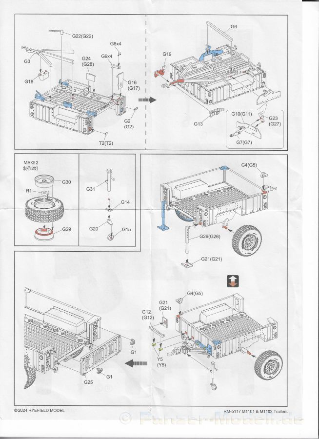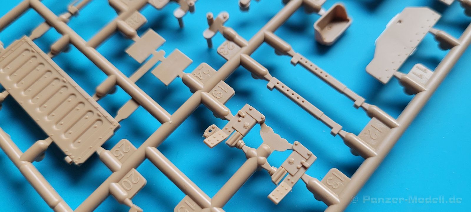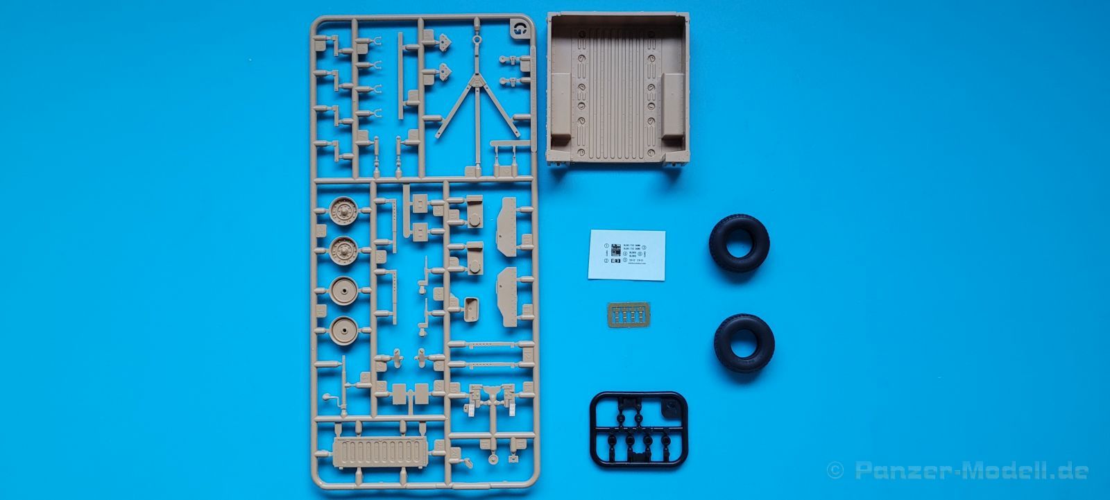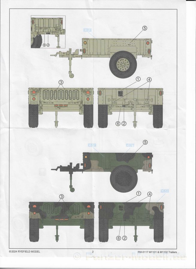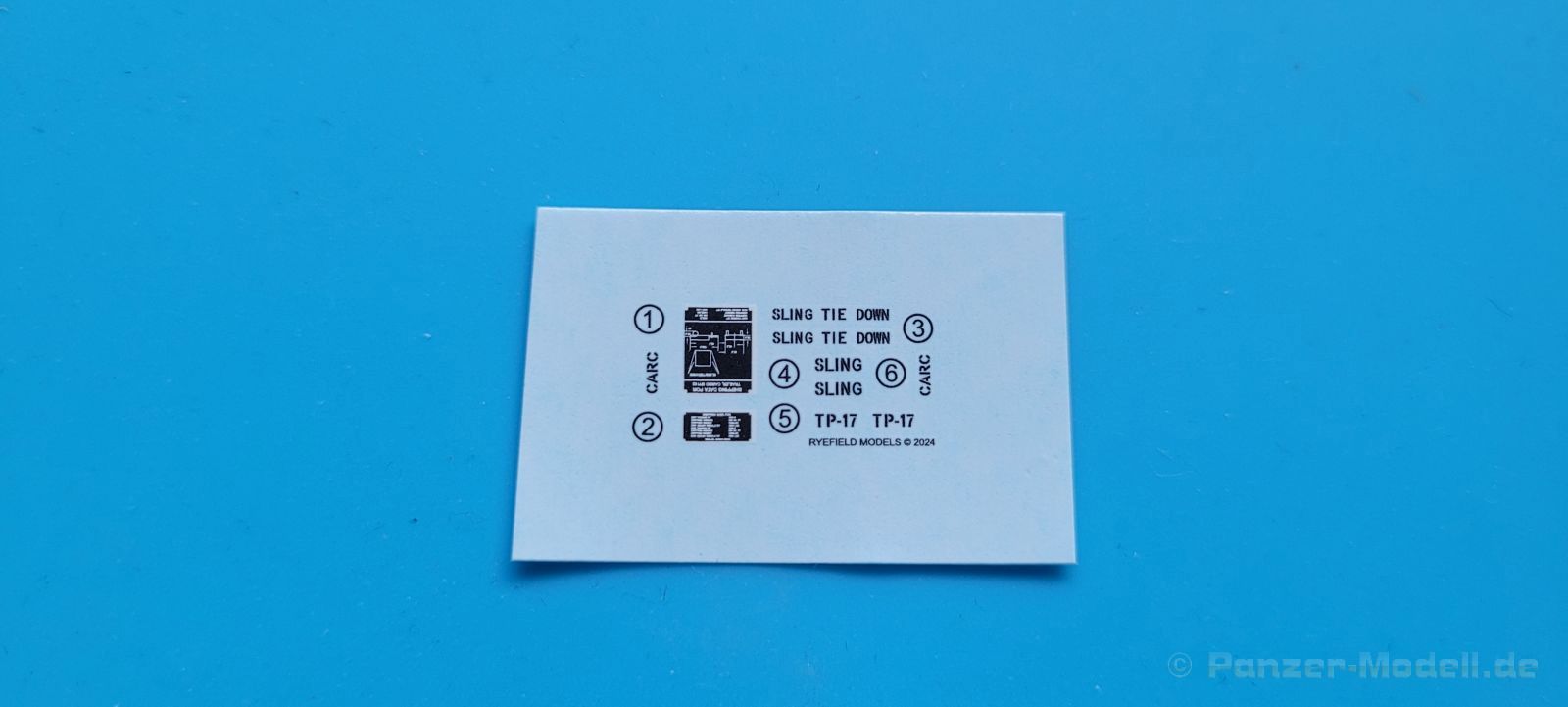 Der Light Tactical Trailer M1101 / M1102 ist ein einachsiger, zweirädriger Anhänger, der zum Ziehen durch ein HMMWV oder JVLT als Zugfahrzeug konzipiert ist. Der Bausatz von Rye Field Model umfasst: · Ein beiger Spritzling Auch an diesem kleinen Bausatz machen alle Bauteile machen einen ganz hervorragenden und sehr hochwertigen Eindruck. Der Bau Fahrzeuges ist denkbar einfach, alle Anbauteile werden an die randscharf ausgeführte Anhängerpritsche geklebt. Optional kann der Anhänger in Schleppstellung oder abgestellt gebaut werden. Die einseitige Bauanleitung führt in leicht verständlichen Baustufen zum Ziel. Als Bemalungsvorschläge sind folgende Fahrzeuge vorhanden: · Anhänger in Sandfarben Hierbei gibt es keine Angaben zu Einheit, Einsatzraum oder Einsatzzeit. Die Farbangaben beziehen sich GSI Creos, obwohl der Hersteller nicht genannt wird, jedoch sind die Farbnummern angegeben. Mein Fazit: Ein sehr erfreulicher kleiner Bausatz, der für den Profi und den Anfänger viel Potential bietet.