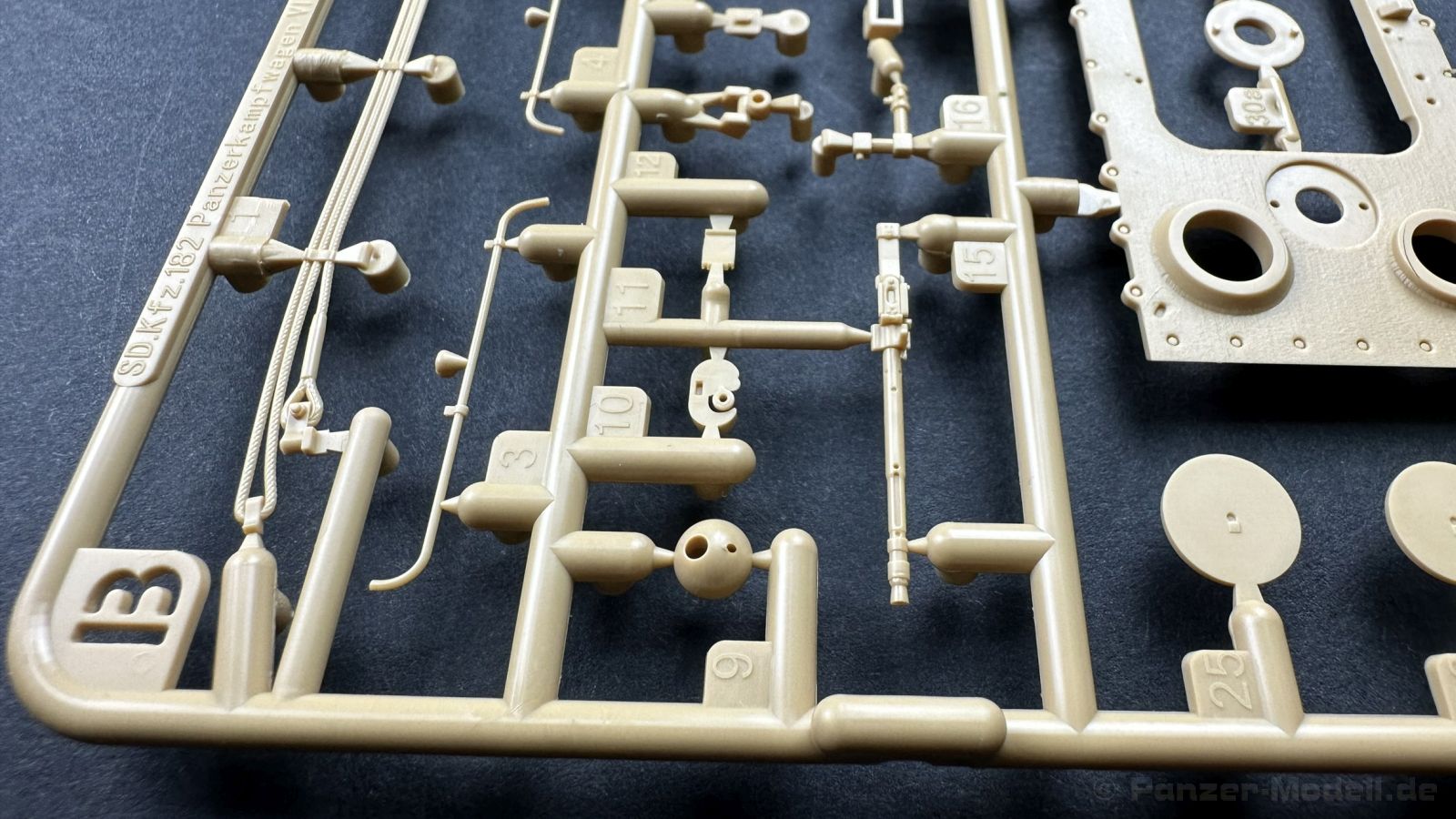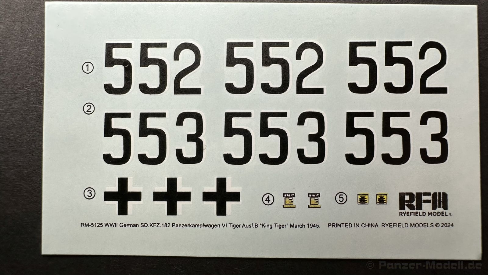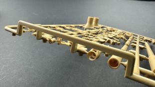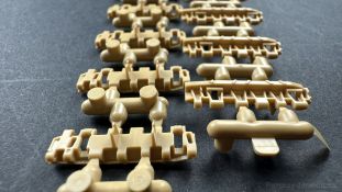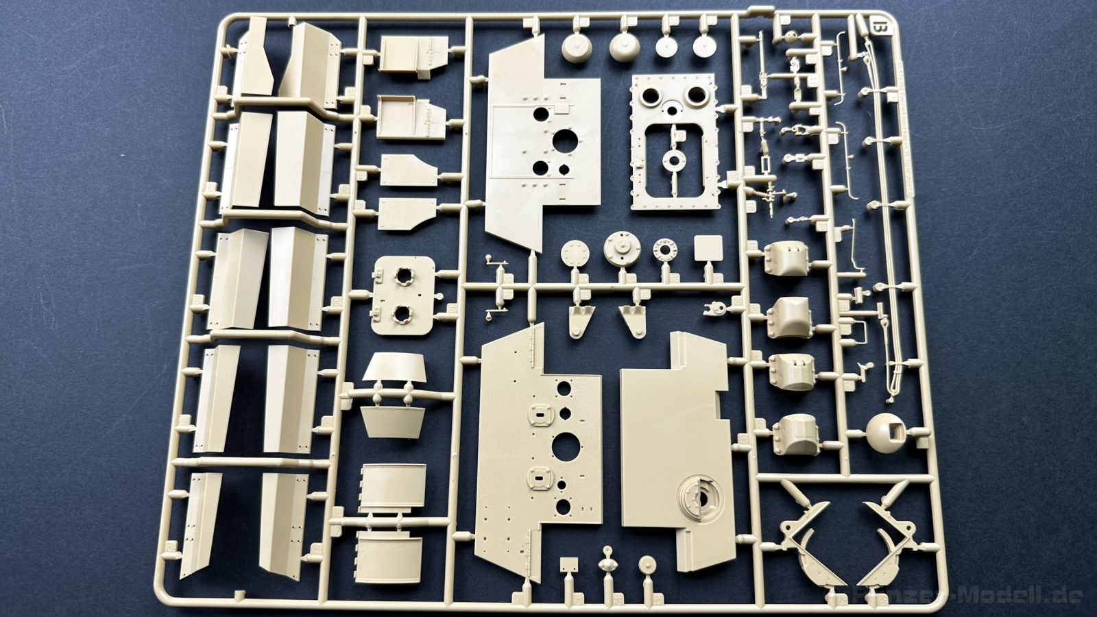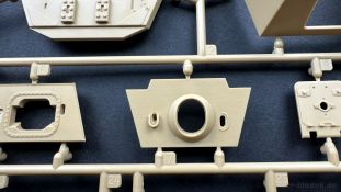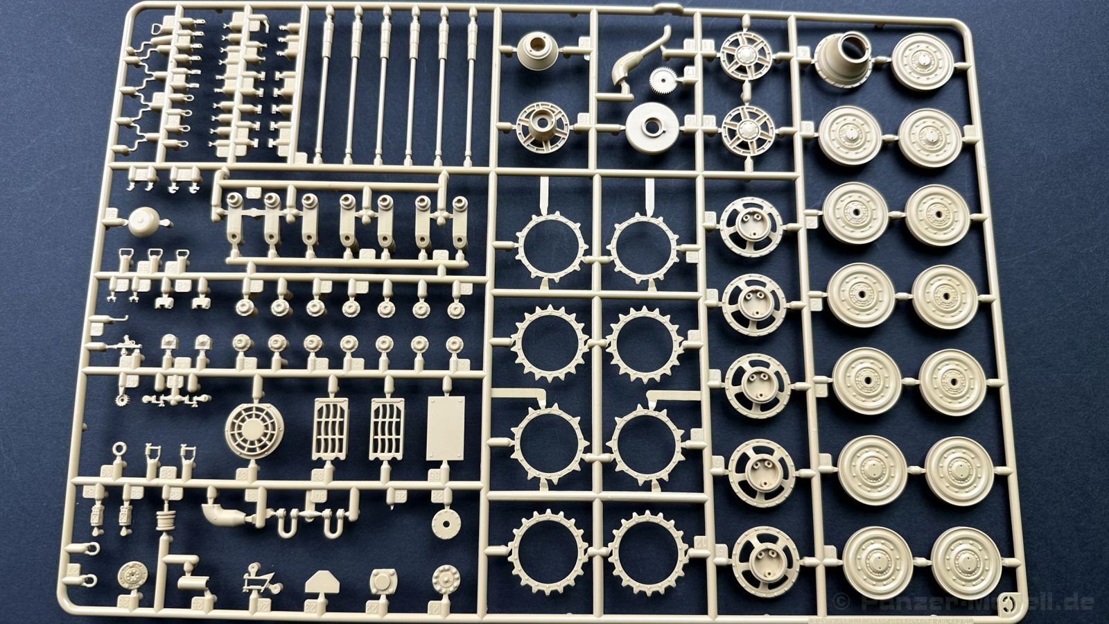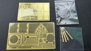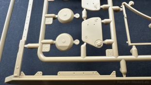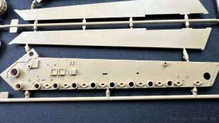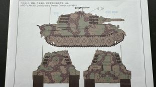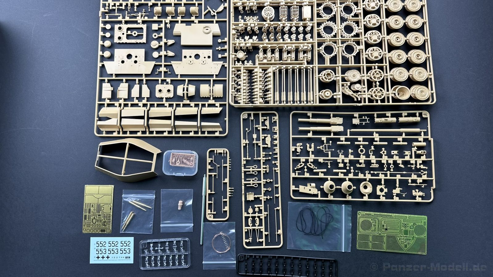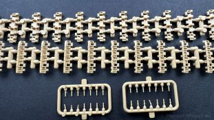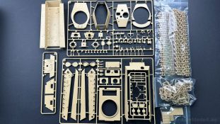 Der gleiche Grundbausatz wird auch noch in einer „Standard“ Version angeboten. Beide Versionen stellen ein sehr spätes Baulos der Tigers II oder Ausf. B dar, der ohne Zimmerit daherkommt. Was die Upgrade Version von der Standardversion unterscheidet liste ich euch auf: - Zusätzlicher umfangreicher Ätzteilebogen wie z.B. für Lampenumfassung, Lüfterschutz, Werkzeughalterungen - 3D gedruckte Bauteile für Mündungsbremse, Lampe, Kauschen, Feuerlöscher - Gedrehtes Alurohr (hier liegt nochmals eine 3D gedruckte Mündungsbremse dabei) - Bewegliche Einzelgliederkette - Antriebsräder in Einzelteilen; 4 verschiedene Zahnkranztypen - Seitenschürzen in einzelnen Segmenten Sowie in der 1. Auflage des Upgrade Bausatzes 4 gedrehte Metallgranaten als Goodie. Eine ganze Menge Zubehör, für die man einzeln bestimmt zwischen 25-30 Euro mehr ausgeben müsste, wenn man alles dazu kaufen würde. Die restliche oder Grundausstattung umfasst folgendes: - 9 Spritzlinge in beige - Vinylcaps - Seilmaterial für Abschleppseile inkl. Hilfsseil - 1x Spritzling in durchsichtigen Kunststoff - 1x Decalbogen. - 1x Metallfeder - 1x Ätzteilbogen Die Anleitung ist mehrfarbig gedruckt und sollte, laut meiner Durchsicht keinerlei Probleme bereiten. Besonderheiten oder schwierige Abschnitte / Bauteile sind farblich dargestellt. Insgesamt 31 Baustufen gibt es zu bewältigen. Die Bauteile kommen in dem üblichen Beigen/Dunkelgelben relativ weichen Kunststoff daher, der für Rye Field so typisch ist. Die Bauteile machen auf den ersten Blick einen spitzen Eindruck, kein Versatz, Einschlüsse oder sichtbare Fischhaut. Neben der wirklich feinen Detaillierung und den Gravuren verfügt der Bausatz bzw. die Bauteile über eine unglaubliche Tiefenschärfe, im englischen auch Crisp genannt. Der eigentliche Bau startet traditionell mit der Unterwanne, hier müssen die Seitenteile der „Inneneinrichtung“ links und Rechts verklebt werden, anschließend erfolgt die Montage der Schwingarme, diese sollen bei sparsamstem Einsatz mit Kleber beweglich bleiben. Leider sind die Schwingarme 2-teilig ausgeführt, was für zusätzliche Arbeit sorgt. Viele der Bauteile sind, anders als bei der Standardversion mit Ätzteilen versehen, sorgt einerseits für mehr Detaillierung, aber auch für einen nicht zu unterschätzenden Mehraufwand, als Beispiel sei hier die Halterung für das Marschkolonenlicht genannt. Interessanterweise liegt eine Motorentrennwand zum Kampfraum und für links und rechts dabei, ob wir hier noch eine Variante mit Inneneinrichtung erwarten dürfen? Die Montage der Werkzeuge auf dem Oberteil umfasst wieder viele Ätzteile, wie Halterungen, Schaufelblatt usw. Das Abschleppseil liegt als gedrehtes Seil dabei um macht einen guten Eindruck. Die Einzelgliederketten, werden in eine Lehre gelegt und mittels Bolzen verbunden, die dann abgetrennt werden müssen vom Spritzling. Es wird in der Anleitung angegeben das kein Kleber benötigt wird, ich freue mich schon das selbst testen zu dürfen! Die Motorenklappe kann offen oder geschlossen dargestellt werden, gleiches gilt für sämtliche Luken. Erfreulich das die Schürzen einzeln montierbar sind, das erlaubt dem Modellbauer sein Modell nach Belieben anpassen zu können. Die Kanone kann mit dem Verschlussstück gebaut werden, leider sieht man davon später nichts mehr. Der mehrteilige Turm ist ein wahrer Bausatz im Bausatz, so besteht der Turm aus 2 Teilen, einem separaten Dach, der Front (die auch aus 2 Stck. besteht und natürlich den gesamten Anbauteilen. Allein die Kommandantenkuppel besteht aus nicht weniger als 30 Bauteilen OHNE das MG zum Fliegerbeschuss! Ein nettes Gimnick für das Kanonenrohr ist eine beiliegende Metallfeder die einen Rückstoß simulieren kann oder soll, leider muss dabei recht viel Kraft aufgewendet werden. Für die Blende liegen 2 Ausführungen mit dabei, leider geht RFM nicht auf die unterschiede der Blenden ein, bzw. ordnet die Blenden keiner Decalvariante zu, hier heißt es – selber recherchieren Ich persönlich finde sowas doof – ein Hersteller legt Varianten bei, lässt aber den Kunden völlig im dunklen tappen für welchen Produktion Zeitraum oder Decalvariante welches Bauteil ist. Rye Field spendiert uns insgesamt 4 Decalvarianten, die sich wie folgt gliedern: - s.SS. Pz.Abt. 503, 2nd Company, Danzig, Germany April 1945 in 3-Farb Hinterhalttarnung In meinen Augen haben wir hier einen der besten Königstiger, den ich bisher sehen dürfte. Das wird aber leider durch viele kleinteilige Bauteile, Ätzteilorgien und eine Einzelgliederkette erkauft, die ich gerne durch die Segmentkette aus dem Standardbausatz ersetzt hätte. Für insgesamt 55 Euro die der Bausatz, Stand 11/2024 kostet ist das Preis-Leistungsniveau hervorragend, wie ich Eingangs schon geschrieben habe, alleine die zusätzlichen Bauteile, die in der Upgraded Version enthalten sind, rechtfertig den Kauf! Wer hätte das nach den ganzen guten und goldenen Jahren gedacht, das es die Hersteller immer wieder schaffen dem geneigeten Modellbauer ein Lächeln auf die Lippen zu Zaubern