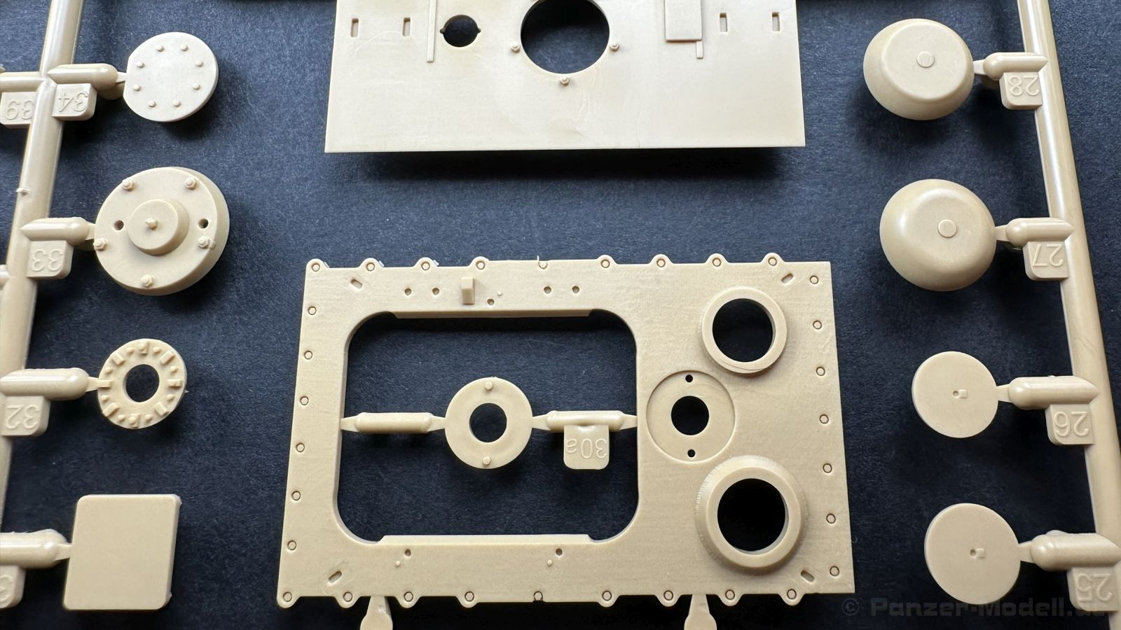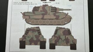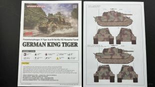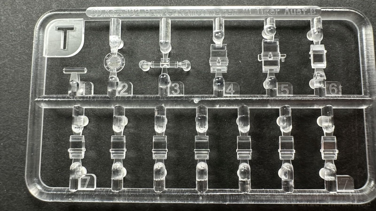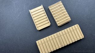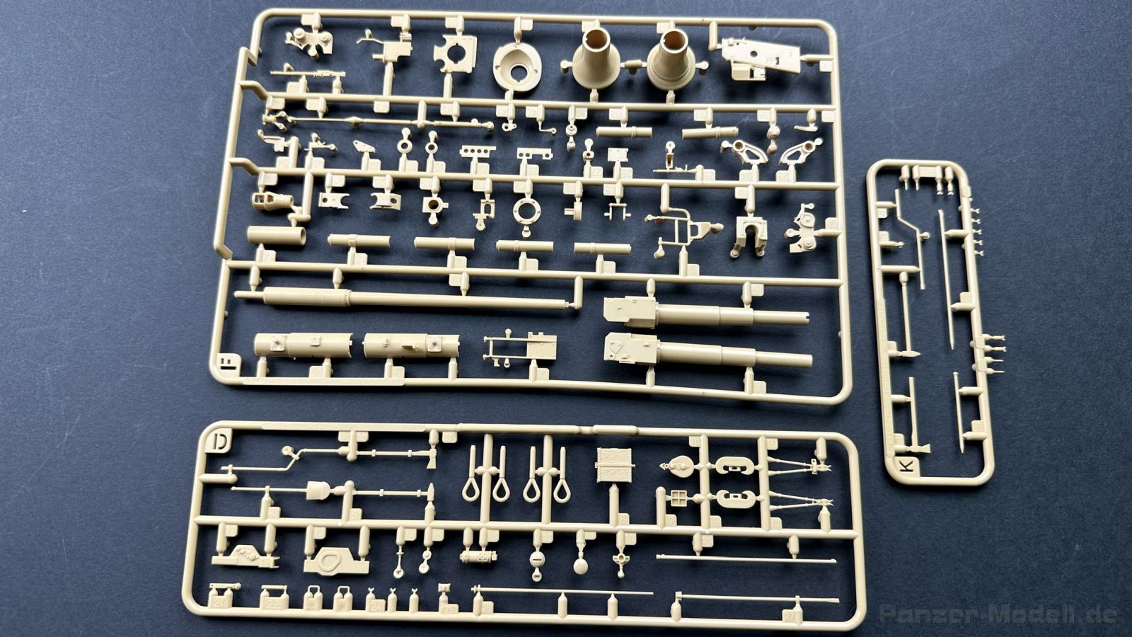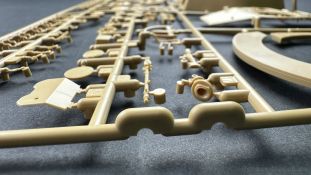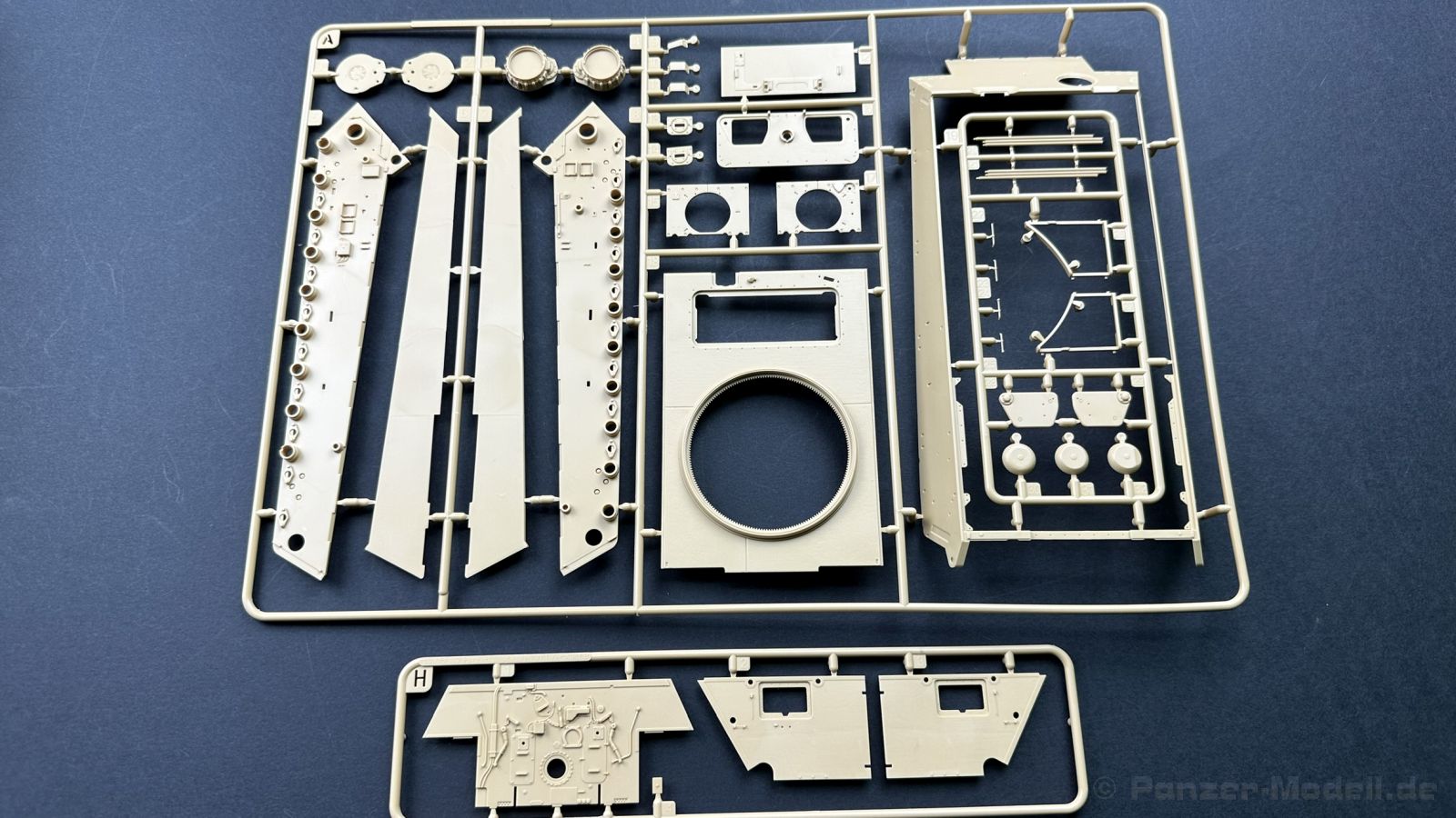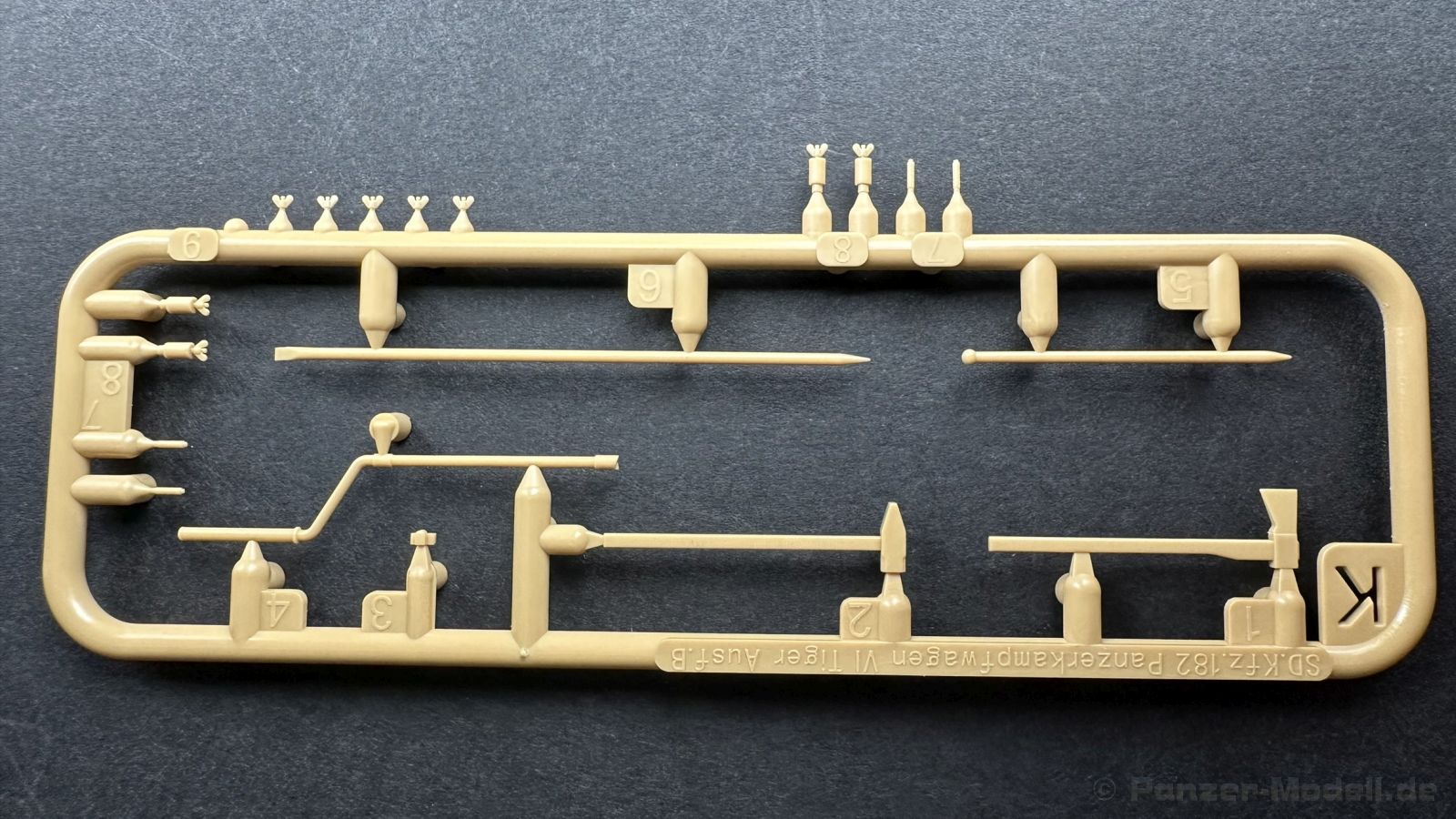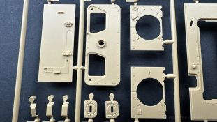 Der gleiche Grundbausatz wird auch noch in einer „Standard“ Version angeboten. Beide Versionen stellen ein sehr spätes Baulos der Tigers II oder Ausf. B dar, der ohne Zimmerit daherkommt. Was die Upgrade Version von der Standardversion unterscheidet liste ich euch auf: - Zusätzlicher umfangreicher Ätzteilebogen wie z.B. für Lampenumfassung, Lüfterschutz, Werkzeughalterungen - 3D gedruckte Bauteile für Mündungsbremse, Lampe, Kauschen, Feuerlöscher - Gedrehtes Alurohr (hier liegt nochmals eine 3D gedruckte Mündungsbremse dabei) - Bewegliche Einzelgliederkette - Antriebsräder in Einzelteilen; 4 verschiedene Zahnkranztypen - Seitenschürzen in einzelnen Segmenten Sowie in der 1. Auflage des Upgrade Bausatzes 4 gedrehte Metallgranaten als Goodie. Eine ganze Menge Zubehör, für die man einzeln bestimmt zwischen 25-30 Euro mehr ausgeben müsste, wenn man alles dazu kaufen würde. Die restliche oder Grundausstattung umfasst folgendes: - 9 Spritzlinge in beige - Vinylcaps - Seilmaterial für Abschleppseile inkl. Hilfsseil - 1x Spritzling in durchsichtigen Kunststoff - 1x Decalbogen. - 1x Metallfeder - 1x Ätzteilbogen Die Anleitung ist mehrfarbig gedruckt und sollte, laut meiner Durchsicht keinerlei Probleme bereiten. Besonderheiten oder schwierige Abschnitte / Bauteile sind farblich dargestellt. Insgesamt 31 Baustufen gibt es zu bewältigen. Die Bauteile kommen in dem üblichen Beigen/Dunkelgelben relativ weichen Kunststoff daher, der für Rye Field so typisch ist. Die Bauteile machen auf den ersten Blick einen spitzen Eindruck, kein Versatz, Einschlüsse oder sichtbare Fischhaut. Neben der wirklich feinen Detaillierung und den Gravuren verfügt der Bausatz bzw. die Bauteile über eine unglaubliche Tiefenschärfe, im englischen auch Crisp genannt. Der eigentliche Bau startet traditionell mit der Unterwanne, hier müssen die Seitenteile der „Inneneinrichtung“ links und Rechts verklebt werden, anschließend erfolgt die Montage der Schwingarme, diese sollen bei sparsamstem Einsatz mit Kleber beweglich bleiben. Leider sind die Schwingarme 2-teilig ausgeführt, was für zusätzliche Arbeit sorgt. Viele der Bauteile sind, anders als bei der Standardversion mit Ätzteilen versehen, sorgt einerseits für mehr Detaillierung, aber auch für einen nicht zu unterschätzenden Mehraufwand, als Beispiel sei hier die Halterung für das Marschkolonenlicht genannt. Interessanterweise liegt eine Motorentrennwand zum Kampfraum und für links und rechts dabei, ob wir hier noch eine Variante mit Inneneinrichtung erwarten dürfen? Die Montage der Werkzeuge auf dem Oberteil umfasst wieder viele Ätzteile, wie Halterungen, Schaufelblatt usw. Das Abschleppseil liegt als gedrehtes Seil dabei um macht einen guten Eindruck. Die Einzelgliederketten, werden in eine Lehre gelegt und mittels Bolzen verbunden, die dann abgetrennt werden müssen vom Spritzling. Es wird in der Anleitung angegeben das kein Kleber benötigt wird, ich freue mich schon das selbst testen zu dürfen! Die Motorenklappe kann offen oder geschlossen dargestellt werden, gleiches gilt für sämtliche Luken. Erfreulich das die Schürzen einzeln montierbar sind, das erlaubt dem Modellbauer sein Modell nach Belieben anpassen zu können. Die Kanone kann mit dem Verschlussstück gebaut werden, leider sieht man davon später nichts mehr. Der mehrteilige Turm ist ein wahrer Bausatz im Bausatz, so besteht der Turm aus 2 Teilen, einem separaten Dach, der Front (die auch aus 2 Stck. besteht und natürlich den gesamten Anbauteilen. Allein die Kommandantenkuppel besteht aus nicht weniger als 30 Bauteilen OHNE das MG zum Fliegerbeschuss! Ein nettes Gimnick für das Kanonenrohr ist eine beiliegende Metallfeder die einen Rückstoß simulieren kann oder soll, leider muss dabei recht viel Kraft aufgewendet werden. Für die Blende liegen 2 Ausführungen mit dabei, leider geht RFM nicht auf die unterschiede der Blenden ein, bzw. ordnet die Blenden keiner Decalvariante zu, hier heißt es – selber recherchieren Ich persönlich finde sowas doof – ein Hersteller legt Varianten bei, lässt aber den Kunden völlig im dunklen tappen für welchen Produktion Zeitraum oder Decalvariante welches Bauteil ist. Rye Field spendiert uns insgesamt 4 Decalvarianten, die sich wie folgt gliedern: - s.SS. Pz.Abt. 503, 2nd Company, Danzig, Germany April 1945 in 3-Farb Hinterhalttarnung In meinen Augen haben wir hier einen der besten Königstiger, den ich bisher sehen dürfte. Das wird aber leider durch viele kleinteilige Bauteile, Ätzteilorgien und eine Einzelgliederkette erkauft, die ich gerne durch die Segmentkette aus dem Standardbausatz ersetzt hätte. Für insgesamt 55 Euro die der Bausatz, Stand 11/2024 kostet ist das Preis-Leistungsniveau hervorragend, wie ich Eingangs schon geschrieben habe, alleine die zusätzlichen Bauteile, die in der Upgraded Version enthalten sind, rechtfertig den Kauf! Wer hätte das nach den ganzen guten und goldenen Jahren gedacht, das es die Hersteller immer wieder schaffen dem geneigeten Modellbauer ein Lächeln auf die Lippen zu Zaubern