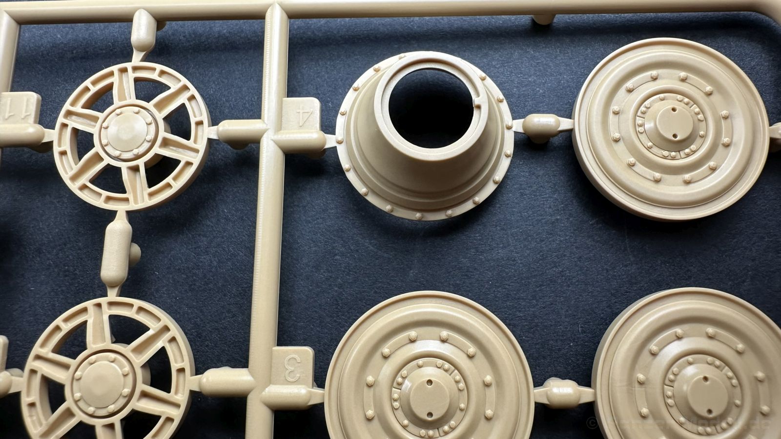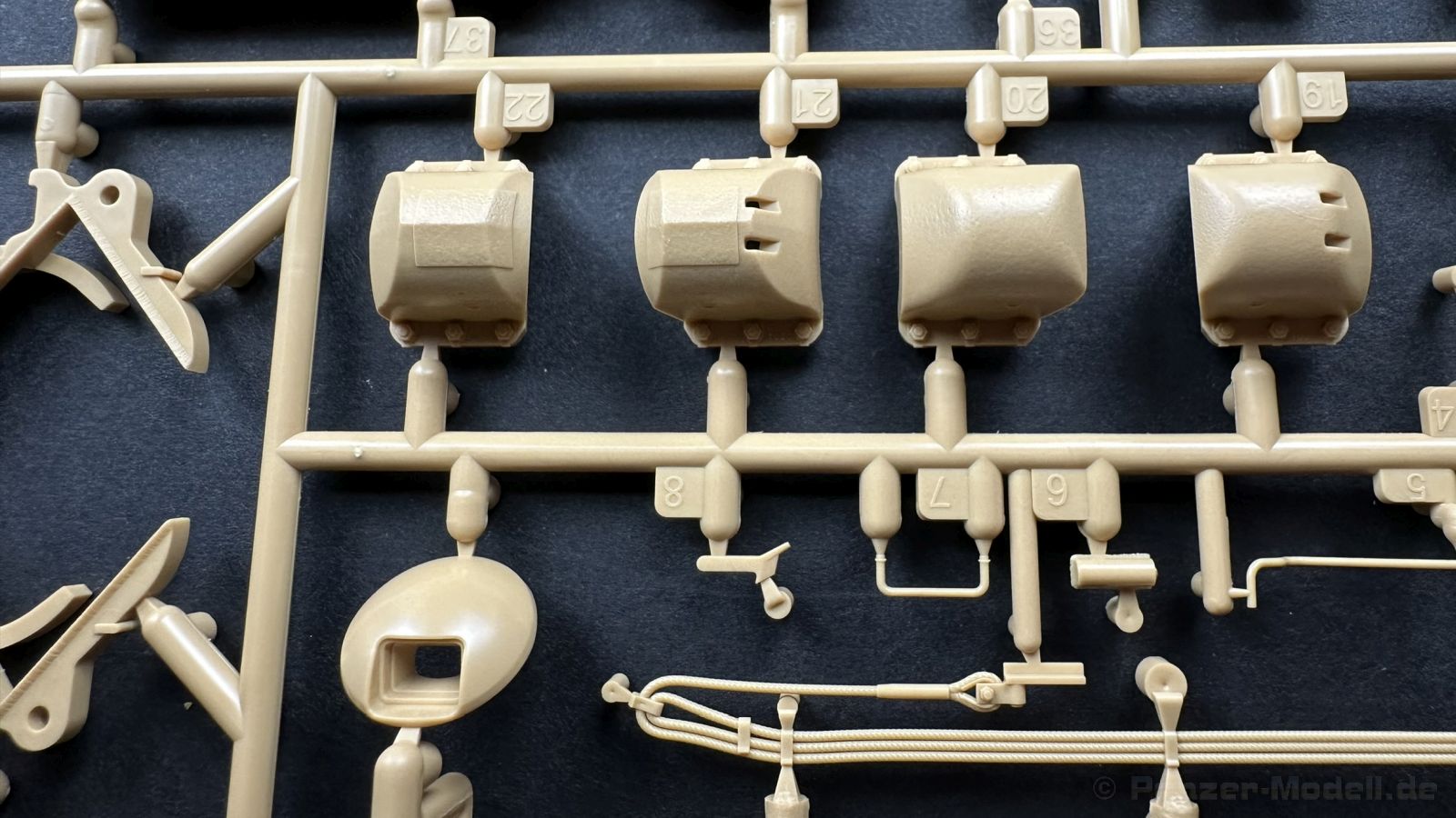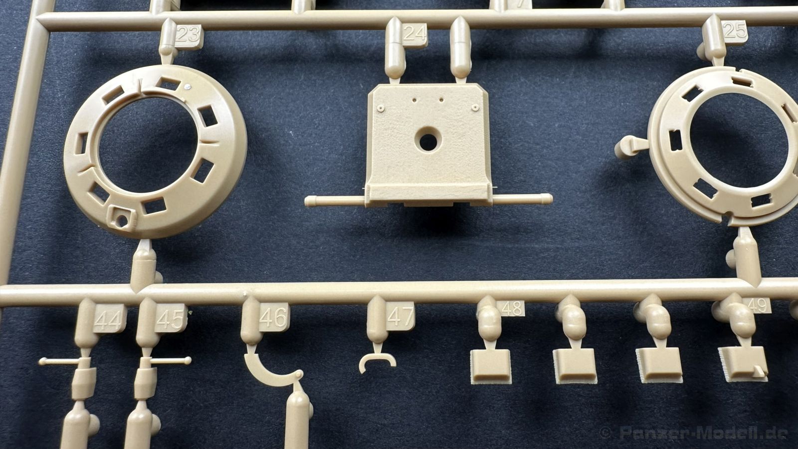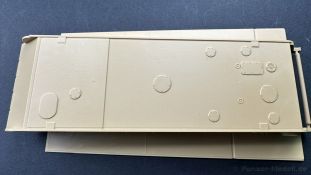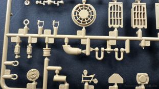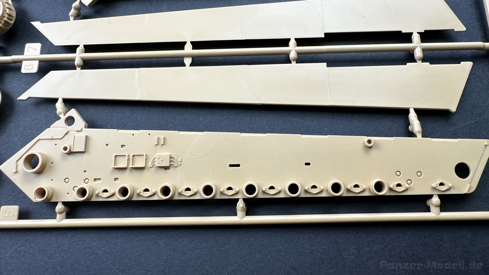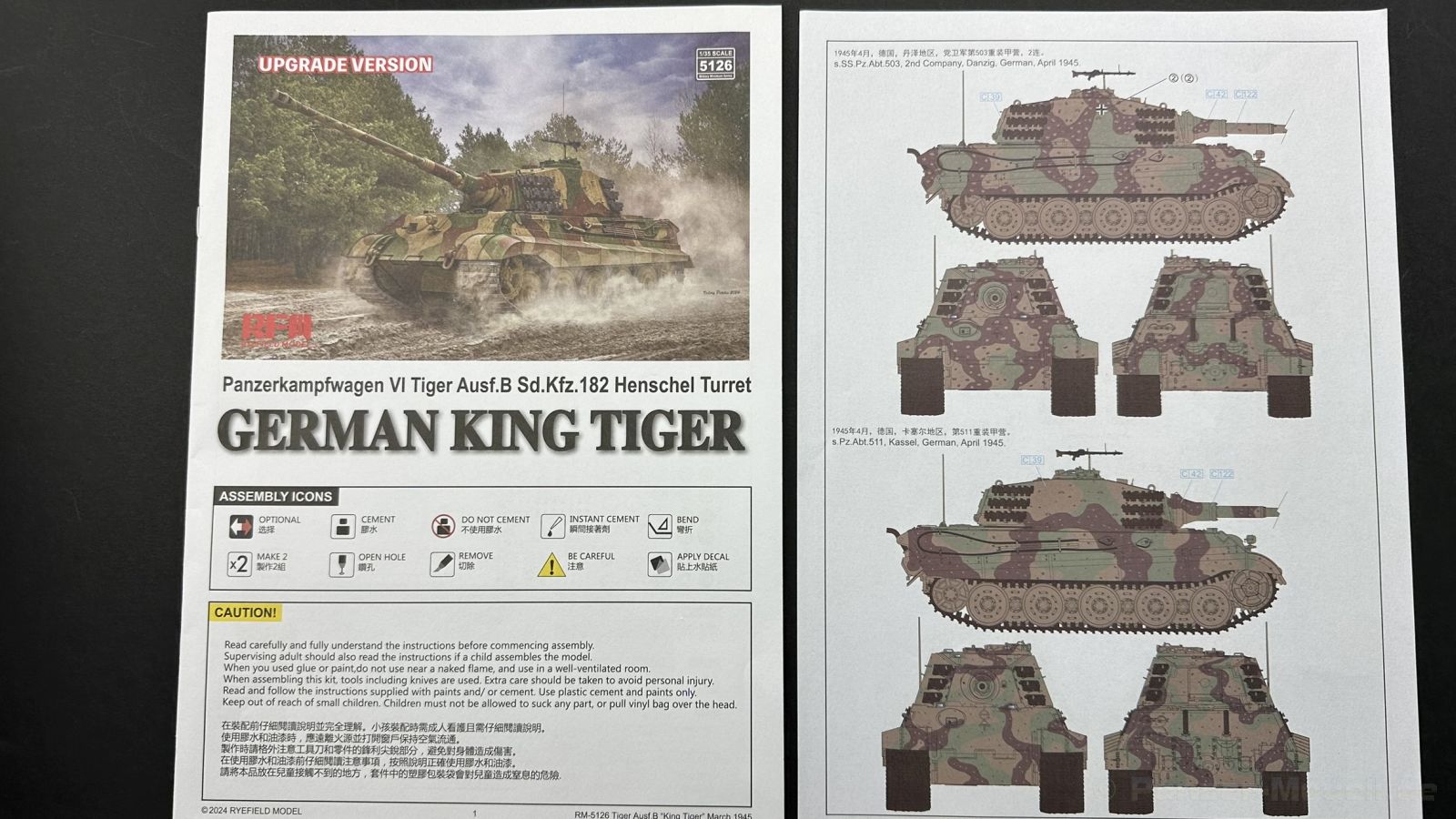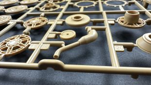 Der gleiche Grundbausatz wird auch noch in einer „Standard“ Version angeboten. Beide Versionen stellen ein sehr spätes Baulos der Tigers II oder Ausf. B dar, der ohne Zimmerit daherkommt. Was die Upgrade Version von der Standardversion unterscheidet liste ich euch auf: - Zusätzlicher umfangreicher Ätzteilebogen wie z.B. für Lampenumfassung, Lüfterschutz, Werkzeughalterungen - 3D gedruckte Bauteile für Mündungsbremse, Lampe, Kauschen, Feuerlöscher - Gedrehtes Alurohr (hier liegt nochmals eine 3D gedruckte Mündungsbremse dabei) - Bewegliche Einzelgliederkette - Antriebsräder in Einzelteilen; 4 verschiedene Zahnkranztypen - Seitenschürzen in einzelnen Segmenten Sowie in der 1. Auflage des Upgrade Bausatzes 4 gedrehte Metallgranaten als Goodie. Eine ganze Menge Zubehör, für die man einzeln bestimmt zwischen 25-30 Euro mehr ausgeben müsste, wenn man alles dazu kaufen würde. Die restliche oder Grundausstattung umfasst folgendes: - 9 Spritzlinge in beige - Vinylcaps - Seilmaterial für Abschleppseile inkl. Hilfsseil - 1x Spritzling in durchsichtigen Kunststoff - 1x Decalbogen. - 1x Metallfeder - 1x Ätzteilbogen Die Anleitung ist mehrfarbig gedruckt und sollte, laut meiner Durchsicht keinerlei Probleme bereiten. Besonderheiten oder schwierige Abschnitte / Bauteile sind farblich dargestellt. Insgesamt 31 Baustufen gibt es zu bewältigen. Die Bauteile kommen in dem üblichen Beigen/Dunkelgelben relativ weichen Kunststoff daher, der für Rye Field so typisch ist. Die Bauteile machen auf den ersten Blick einen spitzen Eindruck, kein Versatz, Einschlüsse oder sichtbare Fischhaut. Neben der wirklich feinen Detaillierung und den Gravuren verfügt der Bausatz bzw. die Bauteile über eine unglaubliche Tiefenschärfe, im englischen auch Crisp genannt. Der eigentliche Bau startet traditionell mit der Unterwanne, hier müssen die Seitenteile der „Inneneinrichtung“ links und Rechts verklebt werden, anschließend erfolgt die Montage der Schwingarme, diese sollen bei sparsamstem Einsatz mit Kleber beweglich bleiben. Leider sind die Schwingarme 2-teilig ausgeführt, was für zusätzliche Arbeit sorgt. Viele der Bauteile sind, anders als bei der Standardversion mit Ätzteilen versehen, sorgt einerseits für mehr Detaillierung, aber auch für einen nicht zu unterschätzenden Mehraufwand, als Beispiel sei hier die Halterung für das Marschkolonenlicht genannt. Interessanterweise liegt eine Motorentrennwand zum Kampfraum und für links und rechts dabei, ob wir hier noch eine Variante mit Inneneinrichtung erwarten dürfen? Die Montage der Werkzeuge auf dem Oberteil umfasst wieder viele Ätzteile, wie Halterungen, Schaufelblatt usw. Das Abschleppseil liegt als gedrehtes Seil dabei um macht einen guten Eindruck. Die Einzelgliederketten, werden in eine Lehre gelegt und mittels Bolzen verbunden, die dann abgetrennt werden müssen vom Spritzling. Es wird in der Anleitung angegeben das kein Kleber benötigt wird, ich freue mich schon das selbst testen zu dürfen! Die Motorenklappe kann offen oder geschlossen dargestellt werden, gleiches gilt für sämtliche Luken. Erfreulich das die Schürzen einzeln montierbar sind, das erlaubt dem Modellbauer sein Modell nach Belieben anpassen zu können. Die Kanone kann mit dem Verschlussstück gebaut werden, leider sieht man davon später nichts mehr. Der mehrteilige Turm ist ein wahrer Bausatz im Bausatz, so besteht der Turm aus 2 Teilen, einem separaten Dach, der Front (die auch aus 2 Stck. besteht und natürlich den gesamten Anbauteilen. Allein die Kommandantenkuppel besteht aus nicht weniger als 30 Bauteilen OHNE das MG zum Fliegerbeschuss! Ein nettes Gimnick für das Kanonenrohr ist eine beiliegende Metallfeder die einen Rückstoß simulieren kann oder soll, leider muss dabei recht viel Kraft aufgewendet werden. Für die Blende liegen 2 Ausführungen mit dabei, leider geht RFM nicht auf die unterschiede der Blenden ein, bzw. ordnet die Blenden keiner Decalvariante zu, hier heißt es – selber recherchieren Ich persönlich finde sowas doof – ein Hersteller legt Varianten bei, lässt aber den Kunden völlig im dunklen tappen für welchen Produktion Zeitraum oder Decalvariante welches Bauteil ist. Rye Field spendiert uns insgesamt 4 Decalvarianten, die sich wie folgt gliedern: - s.SS. Pz.Abt. 503, 2nd Company, Danzig, Germany April 1945 in 3-Farb Hinterhalttarnung In meinen Augen haben wir hier einen der besten Königstiger, den ich bisher sehen dürfte. Das wird aber leider durch viele kleinteilige Bauteile, Ätzteilorgien und eine Einzelgliederkette erkauft, die ich gerne durch die Segmentkette aus dem Standardbausatz ersetzt hätte. Für insgesamt 55 Euro die der Bausatz, Stand 11/2024 kostet ist das Preis-Leistungsniveau hervorragend, wie ich Eingangs schon geschrieben habe, alleine die zusätzlichen Bauteile, die in der Upgraded Version enthalten sind, rechtfertig den Kauf! Wer hätte das nach den ganzen guten und goldenen Jahren gedacht, das es die Hersteller immer wieder schaffen dem geneigeten Modellbauer ein Lächeln auf die Lippen zu Zaubern