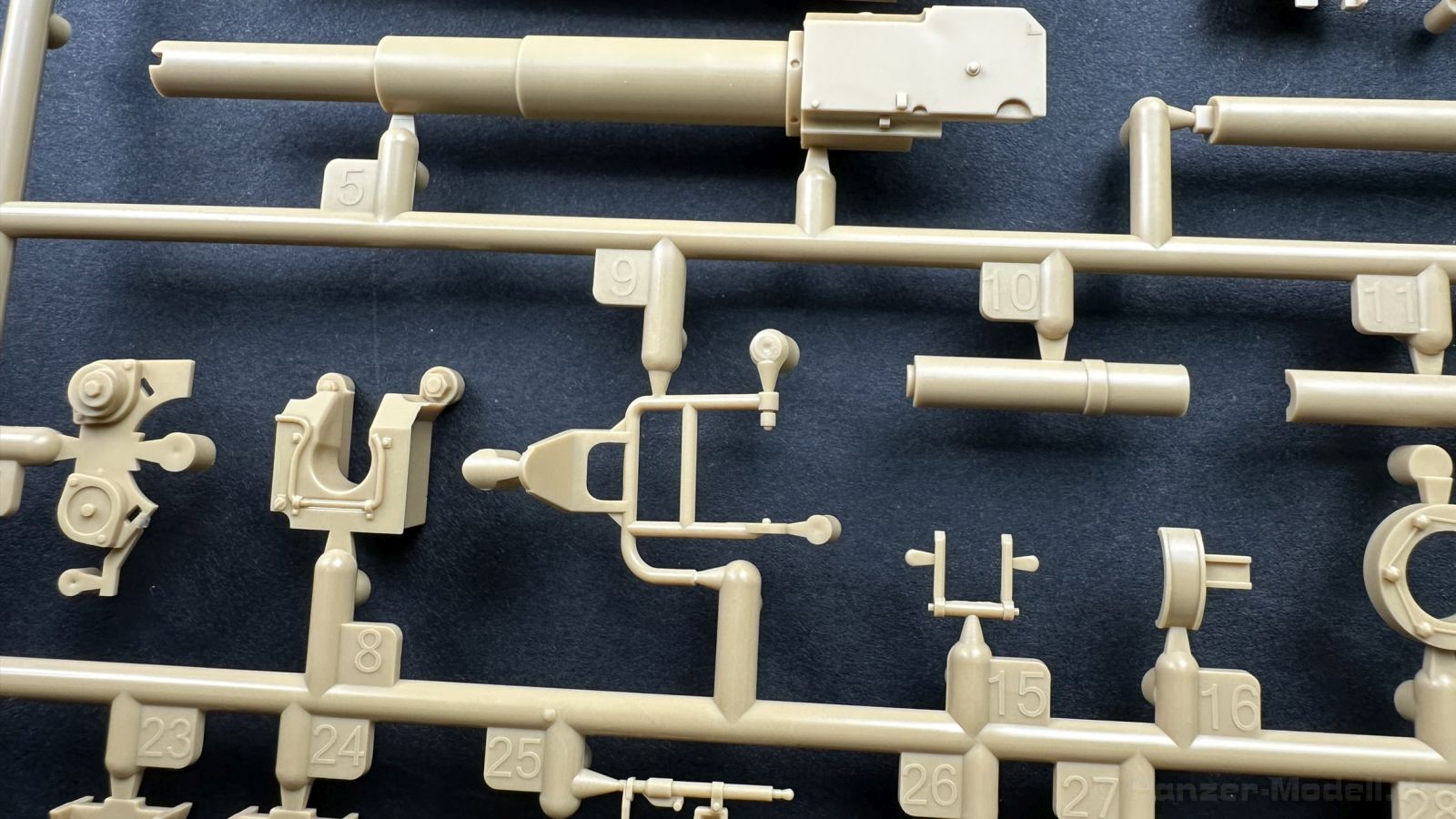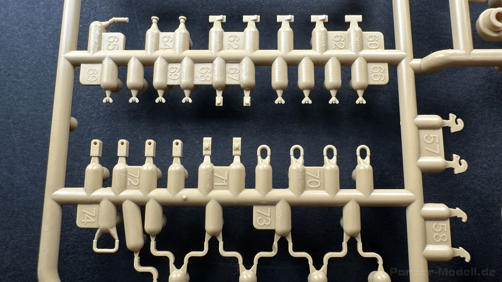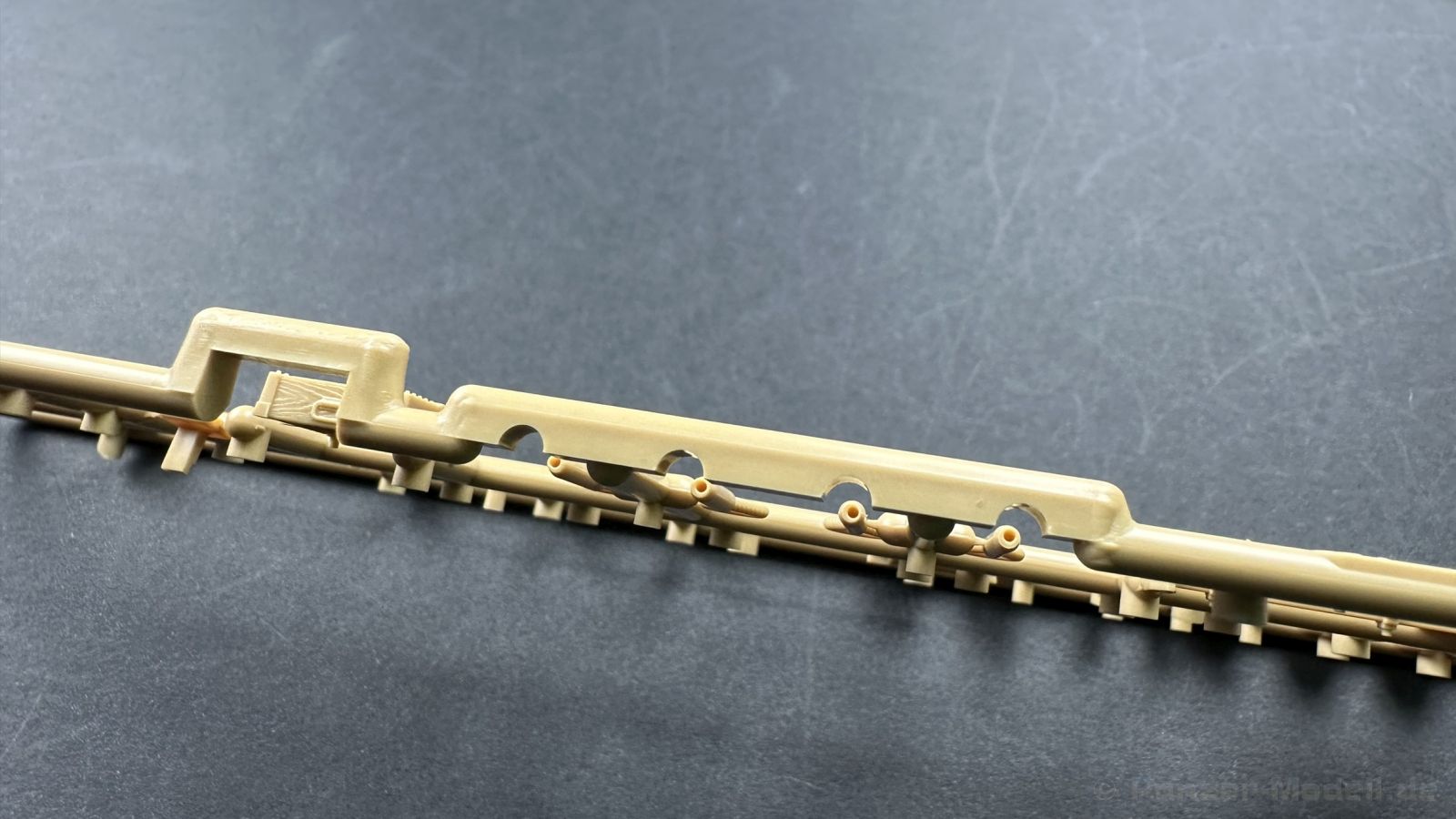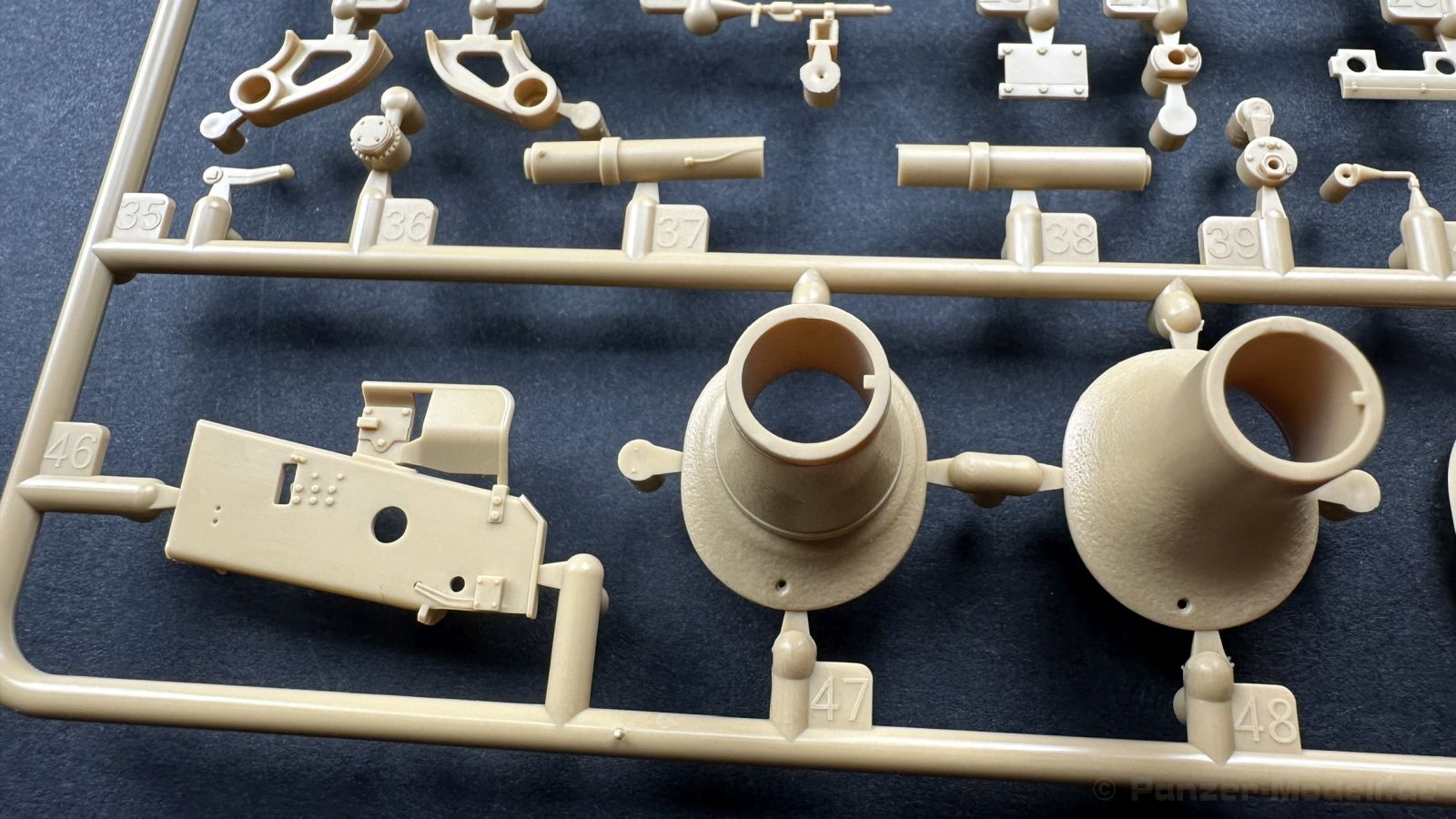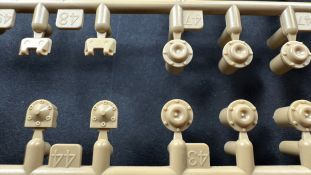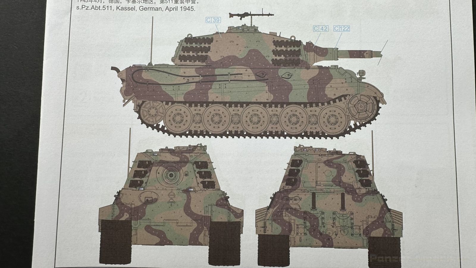 Der gleiche Grundbausatz wird auch noch in einer „Standard“ Version angeboten. Beide Versionen stellen ein sehr spätes Baulos der Tigers II oder Ausf. B dar, der ohne Zimmerit daherkommt. Was die Upgrade Version von der Standardversion unterscheidet liste ich euch auf: - Zusätzlicher umfangreicher Ätzteilebogen wie z.B. für Lampenumfassung, Lüfterschutz, Werkzeughalterungen - 3D gedruckte Bauteile für Mündungsbremse, Lampe, Kauschen, Feuerlöscher - Gedrehtes Alurohr (hier liegt nochmals eine 3D gedruckte Mündungsbremse dabei) - Bewegliche Einzelgliederkette - Antriebsräder in Einzelteilen; 4 verschiedene Zahnkranztypen - Seitenschürzen in einzelnen Segmenten Sowie in der 1. Auflage des Upgrade Bausatzes 4 gedrehte Metallgranaten als Goodie. Eine ganze Menge Zubehör, für die man einzeln bestimmt zwischen 25-30 Euro mehr ausgeben müsste, wenn man alles dazu kaufen würde. Die restliche oder Grundausstattung umfasst folgendes: - 9 Spritzlinge in beige - Vinylcaps - Seilmaterial für Abschleppseile inkl. Hilfsseil - 1x Spritzling in durchsichtigen Kunststoff - 1x Decalbogen. - 1x Metallfeder - 1x Ätzteilbogen Die Anleitung ist mehrfarbig gedruckt und sollte, laut meiner Durchsicht keinerlei Probleme bereiten. Besonderheiten oder schwierige Abschnitte / Bauteile sind farblich dargestellt. Insgesamt 31 Baustufen gibt es zu bewältigen. Die Bauteile kommen in dem üblichen Beigen/Dunkelgelben relativ weichen Kunststoff daher, der für Rye Field so typisch ist. Die Bauteile machen auf den ersten Blick einen spitzen Eindruck, kein Versatz, Einschlüsse oder sichtbare Fischhaut. Neben der wirklich feinen Detaillierung und den Gravuren verfügt der Bausatz bzw. die Bauteile über eine unglaubliche Tiefenschärfe, im englischen auch Crisp genannt. Der eigentliche Bau startet traditionell mit der Unterwanne, hier müssen die Seitenteile der „Inneneinrichtung“ links und Rechts verklebt werden, anschließend erfolgt die Montage der Schwingarme, diese sollen bei sparsamstem Einsatz mit Kleber beweglich bleiben. Leider sind die Schwingarme 2-teilig ausgeführt, was für zusätzliche Arbeit sorgt. Viele der Bauteile sind, anders als bei der Standardversion mit Ätzteilen versehen, sorgt einerseits für mehr Detaillierung, aber auch für einen nicht zu unterschätzenden Mehraufwand, als Beispiel sei hier die Halterung für das Marschkolonenlicht genannt. Interessanterweise liegt eine Motorentrennwand zum Kampfraum und für links und rechts dabei, ob wir hier noch eine Variante mit Inneneinrichtung erwarten dürfen? Die Montage der Werkzeuge auf dem Oberteil umfasst wieder viele Ätzteile, wie Halterungen, Schaufelblatt usw. Das Abschleppseil liegt als gedrehtes Seil dabei um macht einen guten Eindruck. Die Einzelgliederketten, werden in eine Lehre gelegt und mittels Bolzen verbunden, die dann abgetrennt werden müssen vom Spritzling. Es wird in der Anleitung angegeben das kein Kleber benötigt wird, ich freue mich schon das selbst testen zu dürfen! Die Motorenklappe kann offen oder geschlossen dargestellt werden, gleiches gilt für sämtliche Luken. Erfreulich das die Schürzen einzeln montierbar sind, das erlaubt dem Modellbauer sein Modell nach Belieben anpassen zu können. Die Kanone kann mit dem Verschlussstück gebaut werden, leider sieht man davon später nichts mehr. Der mehrteilige Turm ist ein wahrer Bausatz im Bausatz, so besteht der Turm aus 2 Teilen, einem separaten Dach, der Front (die auch aus 2 Stck. besteht und natürlich den gesamten Anbauteilen. Allein die Kommandantenkuppel besteht aus nicht weniger als 30 Bauteilen OHNE das MG zum Fliegerbeschuss! Ein nettes Gimnick für das Kanonenrohr ist eine beiliegende Metallfeder die einen Rückstoß simulieren kann oder soll, leider muss dabei recht viel Kraft aufgewendet werden. Für die Blende liegen 2 Ausführungen mit dabei, leider geht RFM nicht auf die unterschiede der Blenden ein, bzw. ordnet die Blenden keiner Decalvariante zu, hier heißt es – selber recherchieren Ich persönlich finde sowas doof – ein Hersteller legt Varianten bei, lässt aber den Kunden völlig im dunklen tappen für welchen Produktion Zeitraum oder Decalvariante welches Bauteil ist. Rye Field spendiert uns insgesamt 4 Decalvarianten, die sich wie folgt gliedern: - s.SS. Pz.Abt. 503, 2nd Company, Danzig, Germany April 1945 in 3-Farb Hinterhalttarnung In meinen Augen haben wir hier einen der besten Königstiger, den ich bisher sehen dürfte. Das wird aber leider durch viele kleinteilige Bauteile, Ätzteilorgien und eine Einzelgliederkette erkauft, die ich gerne durch die Segmentkette aus dem Standardbausatz ersetzt hätte. Für insgesamt 55 Euro die der Bausatz, Stand 11/2024 kostet ist das Preis-Leistungsniveau hervorragend, wie ich Eingangs schon geschrieben habe, alleine die zusätzlichen Bauteile, die in der Upgraded Version enthalten sind, rechtfertig den Kauf! Wer hätte das nach den ganzen guten und goldenen Jahren gedacht, das es die Hersteller immer wieder schaffen dem geneigeten Modellbauer ein Lächeln auf die Lippen zu Zaubern