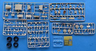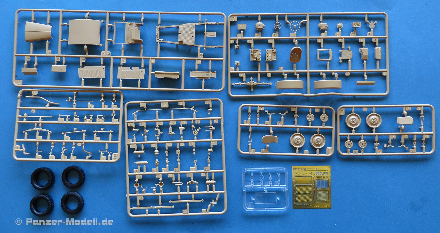 Der Bausatz enthält 5 beige Spritzlinge, vier Vinylreifen, eine PE Platine und ein Klarsichtspritzling.