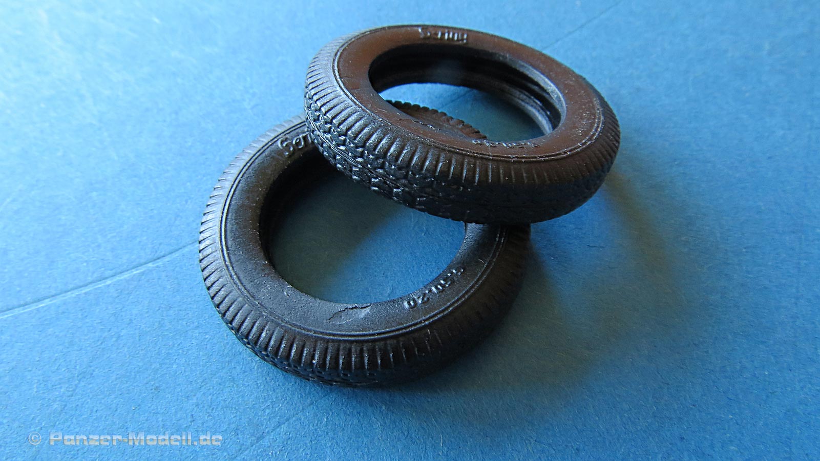 Die schwarzen Vinyreifen sind jeweils für vorn und hinten unterschiedlich und einteilig gespritzt. Das Profil ist fein dargestellt und es gibt sogar Herstelleraufdrucke an den Reifenflanken, eine Idee soft, was aber auch nur bei der extremen Nahbetrachtung auffällt.