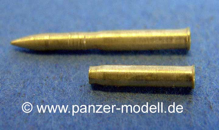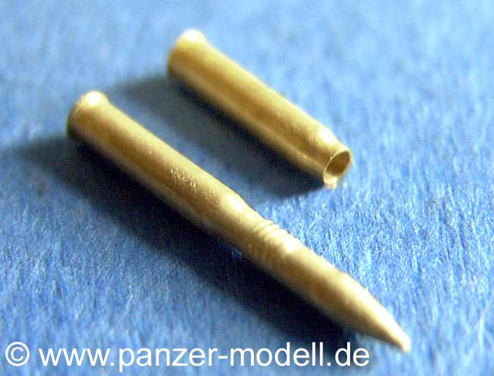 Wieder blickt man erstaunt in die wirklich leere Kartusche, die ebenso wie die Granate einen hervorragenden Eindruck macht. Da diese Munition aus Messing ist, muss man nur noch die Granate an sich bemalen und kann die Kartusche farbmäßig so lassen!