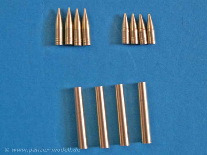 Das Set umfasst vier leere Kartuschen, vier Sprenggranaten und vier panzerbrechende Geschosse. Die Qualität ist wie bei Schatton gewohnt exzellent - allein die komplett hohlen Kartuschen mit geringer Wandstärke sind eine Augenweide. Auch die Granaten weisen feine Details wie Rillen auf. Besonders gut ist hier die Tatsache, dass die Granaten am Bodenstück keine Abdrehbutzen mehr haben, also keine Nacharbeit mehr vom Modellbauer erfordert. Die Kartuschen sind am Bodenstück mit der mittleren Aussparung für den Zünder versehen.