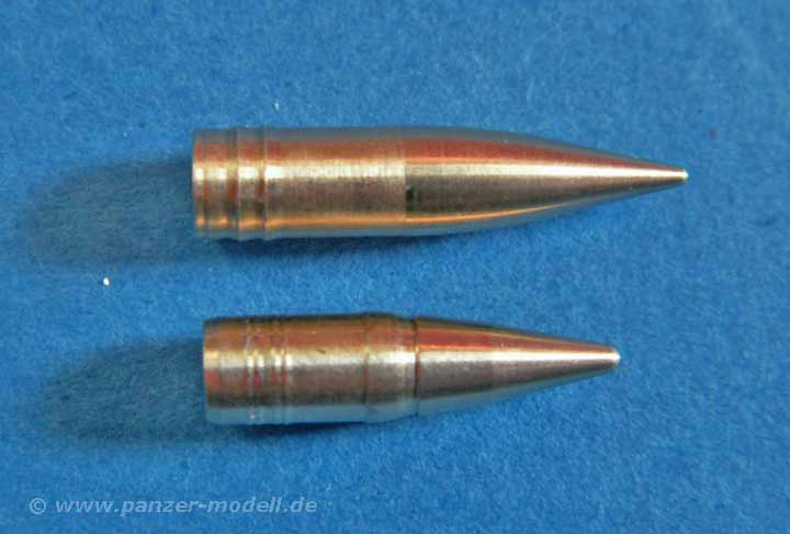 Interessant ist die Tatsache, dass besonders die panzerbrechenden Geschosse von den Abmaßungen anders aussehen als von anderen Herstellern. Diese hier sind nach Herstellerangaben direkt von Originalzeichnungen abgenommen und hergestellt.