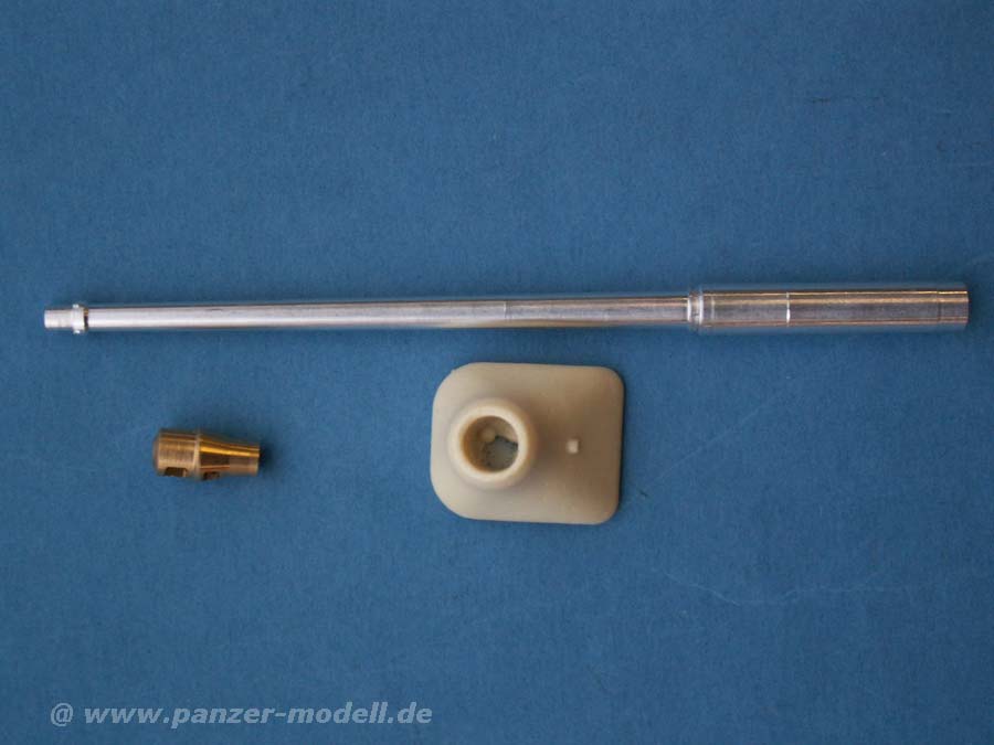 Mit dem vorliegenden Set bekommt man hier einige Hilfe, denn neben dem sehr schönen, gedrehten Metallrohr der 8,8cm PaK, die zudem Felder und Züge im Rohrlauf aufweist, gibt es eine seh gute, EINTEILIGE Mündungsbremse, die einfach aufgesteckt und verklebt wird - einfacher gehts wirklich nicht mehr. Und um nun den Jagdtiger auch korrekt darzustellen liegt eben auch noch die neue, passende Kanonenblende als Resinteil bei. Der Guss ist sauber und weist ein feine Gussstruktur auf - Versäuberung ist hier nahezu nicht notwendig.