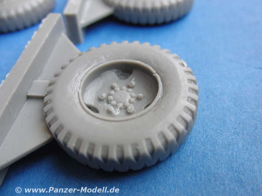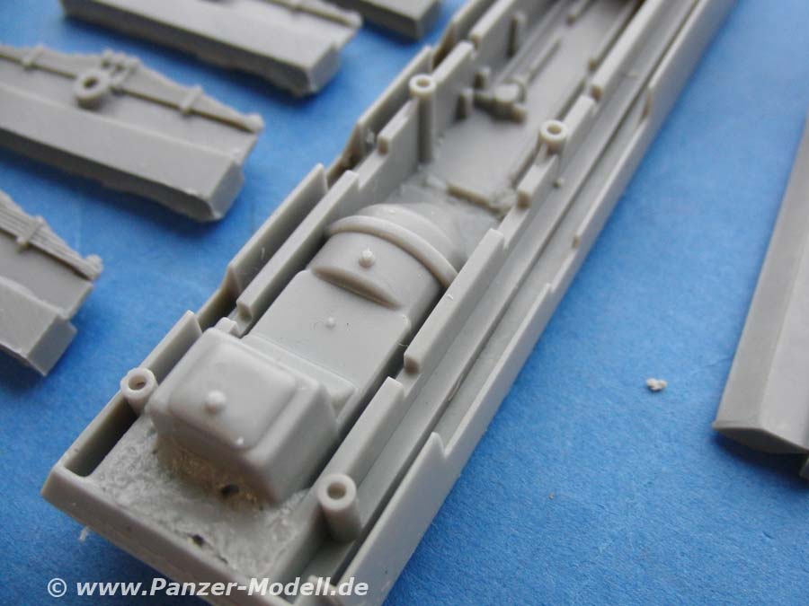Die Resinteile sind, wie bereits erwähnt fein gegossen ohne Luftblasen oder Verzug. Die Details können sich wirklich sehen lassen - So weisen die Reifen gutes und feines profil auf, die Bodenplatten exzellente Antirutschstruktur und auch die radaufhängungen sehen sauber und detailreich aus!