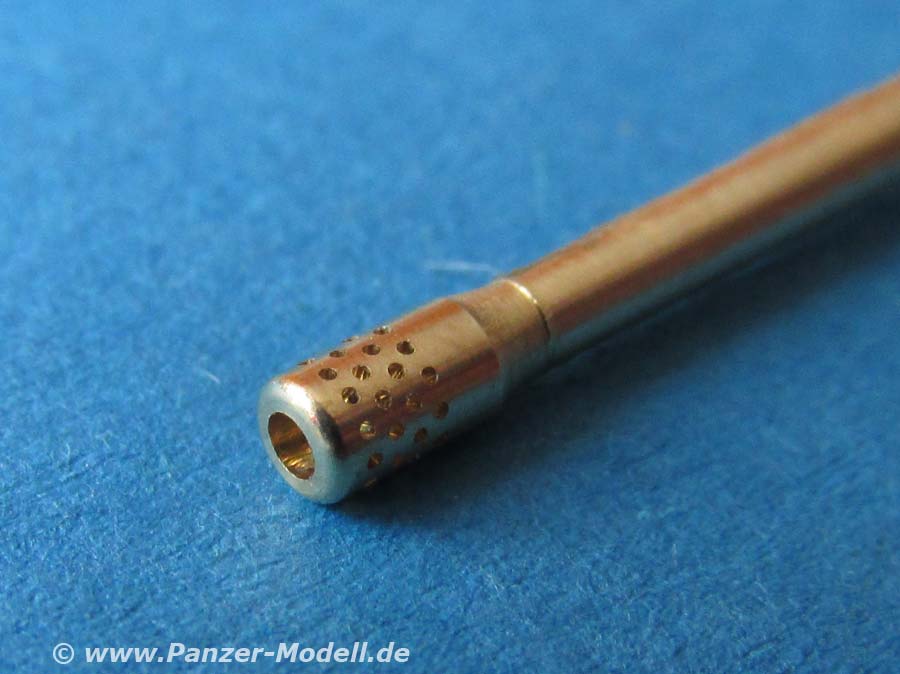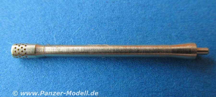 Das Rohr läuft an der Basis konisch zu und hat eine einen aufgesetzten Mündungsfeuerdämpfer mit entsprechenden Bohrungen. Wesentlich besser und detaillierter als es ein Plastikrohr sein könnte.