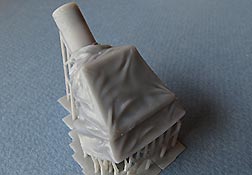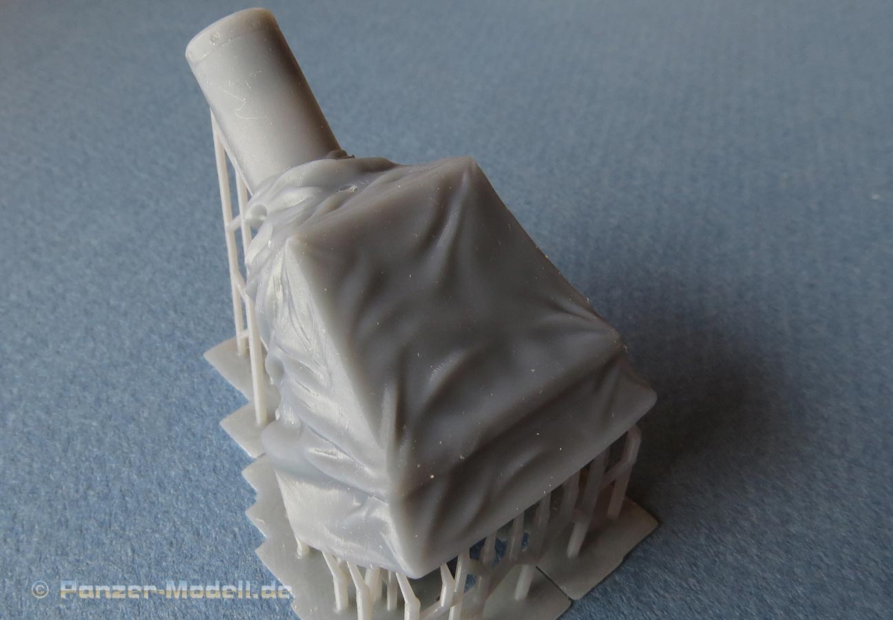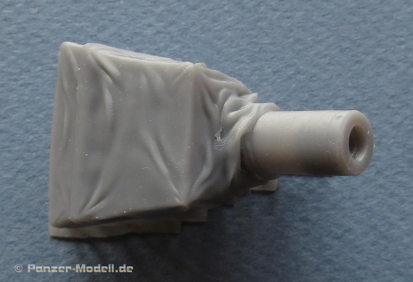 In diesem Set finden wir ein 3D Druckteil zur Darstellung einer StuG III G Kastenblende, die mit einer Plane umliegend abgedeckt ist