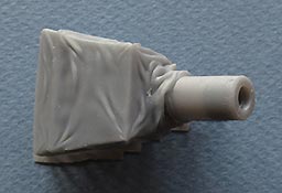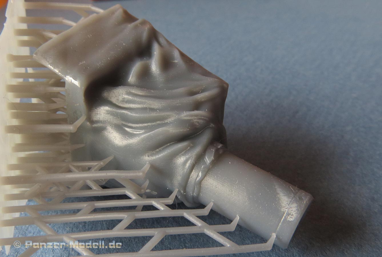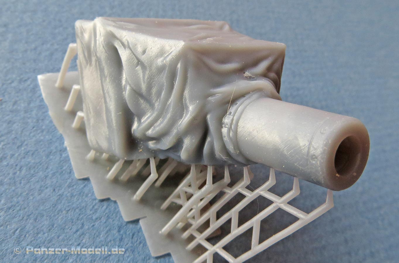Das Basisstück der Kanonenrohrs ist ebenfalls in 3D Druck und schaut vorn aus der Planenabdeckung hervor - hier wird dann der Rest des Rohres aus dem Bausatz eingesteckt. Leider schweigt sich der Hersteller aus für welches Stug dieses Teil gemacht ist, damit die Aufnahme der Blende an sich und des Rohres auch wirklich passt. Andererseits sollte es kein Problm für einen Modellbauer seit, dies für alle Auslegungen passen dzu bekommen.