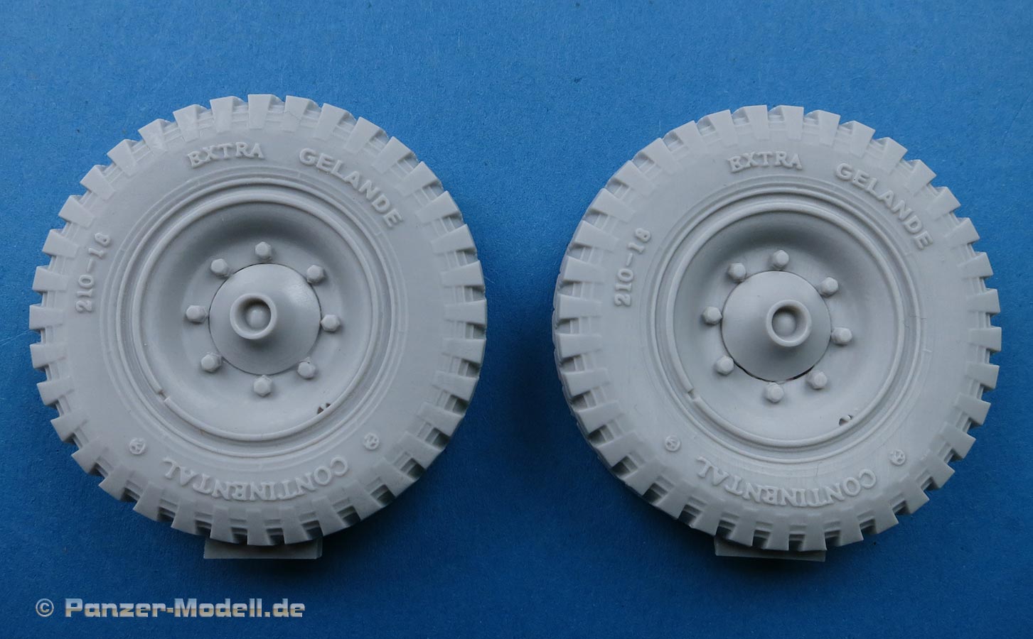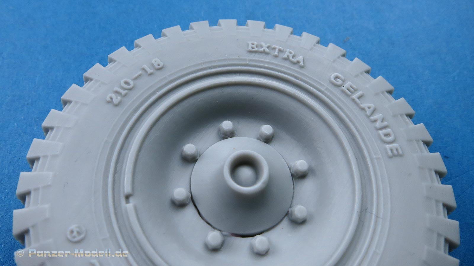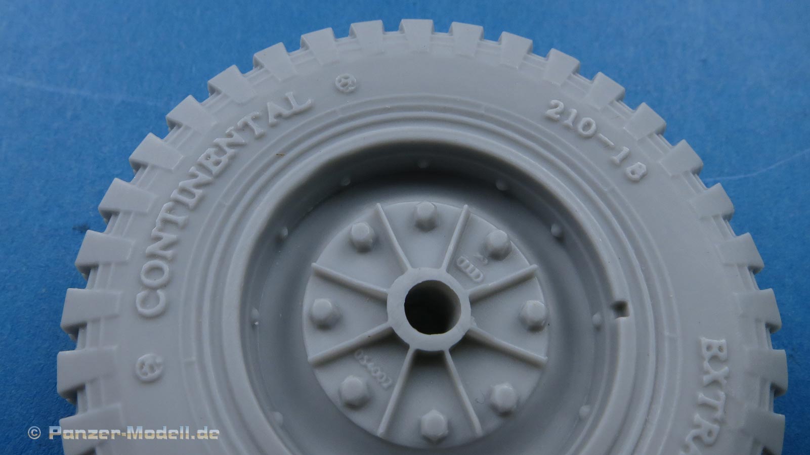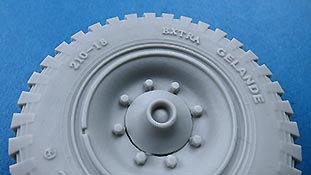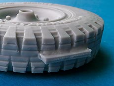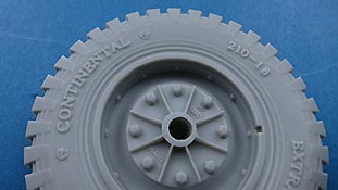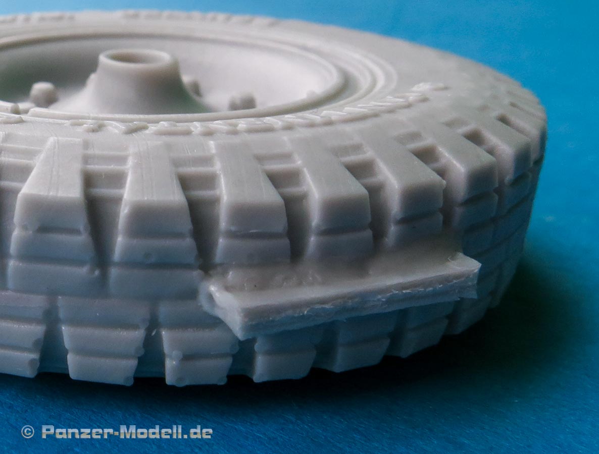 Das Profil der Reifen ist perfekt modelliert und ausgearbeitet mit feinen Rillen, in der Nähe des Angusses finden sich ein paar winzige Luftbläschen - die dürften aber zu vernachlässigen sein, da es sich hie rum die Standfläche des Reifen handelt. Ja, Standfläche, denn die Reifen sind mit leicher Abflachung eines belasteten Reifens modelliiert. Daher ist hier auch der Anguss angebracht, da man die Angussstelle dann nachher auch nicht mehr sehen kann.