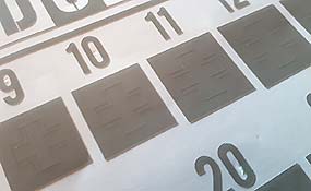 Insgesamt sind auf dem Bogen 24 einzelne Schablonen enthalten, die von 7 bis 30mm Größe schön aufgereiht und mit den entsprechenden Zahlen deutlich erkennbar sind.