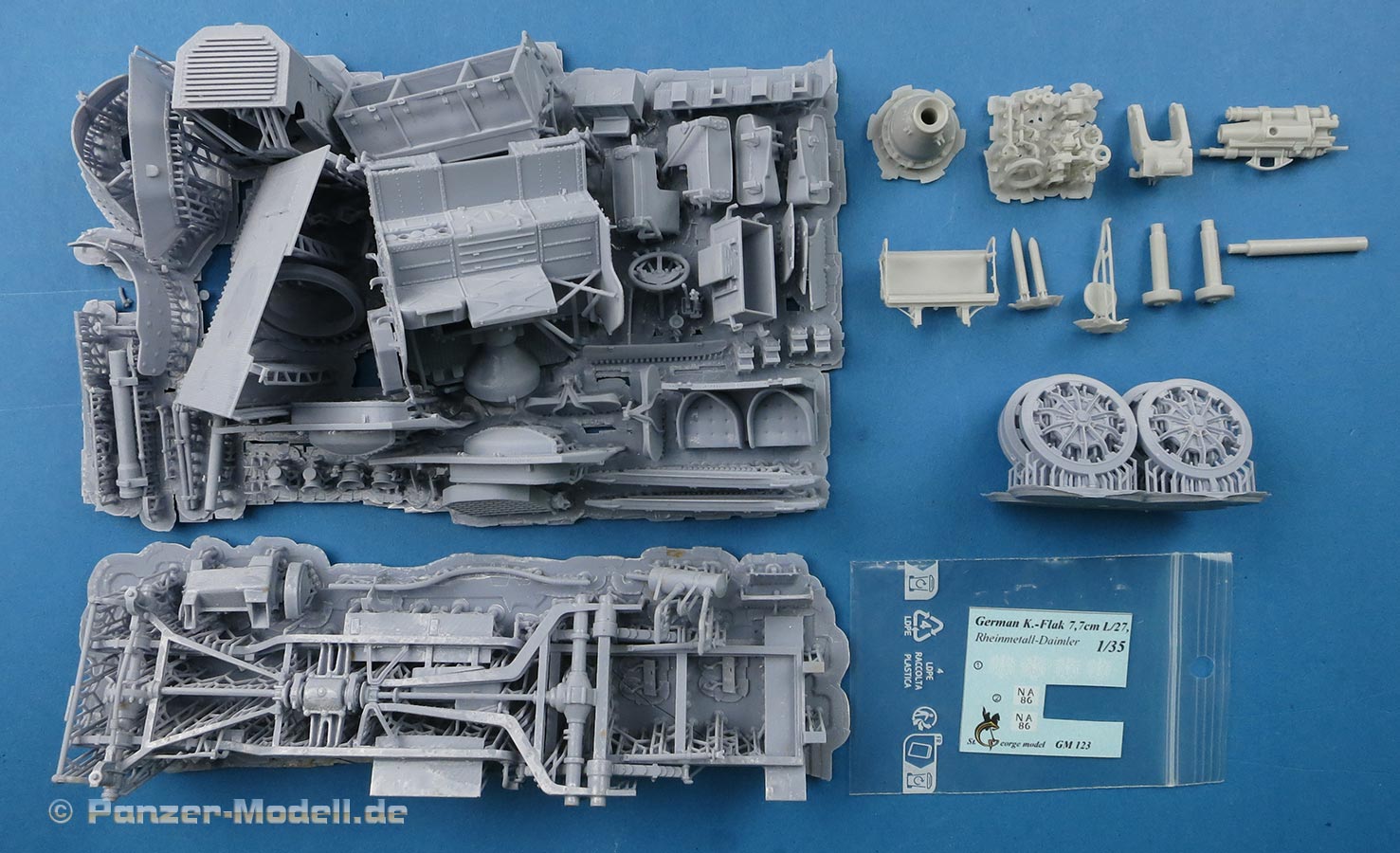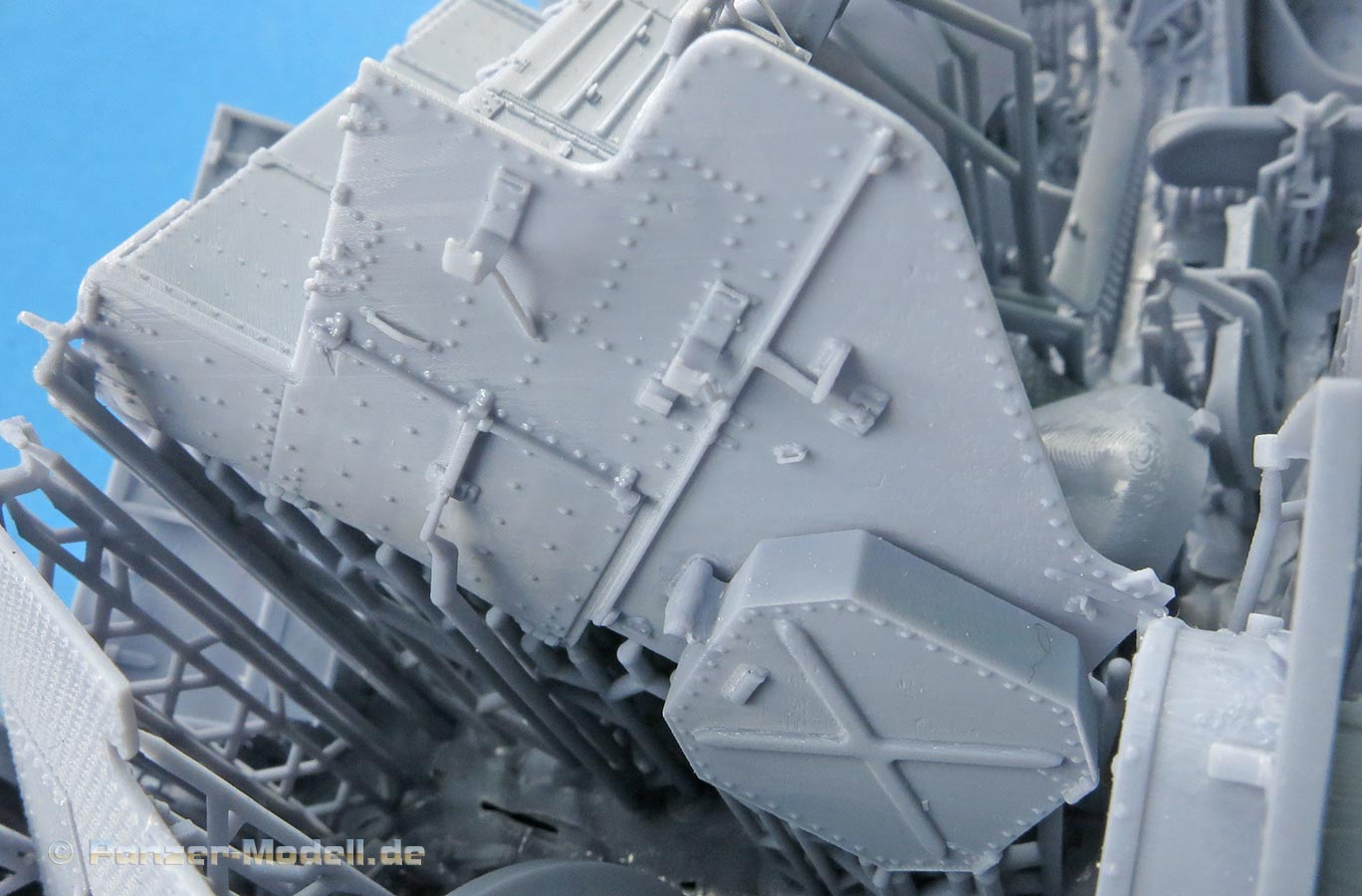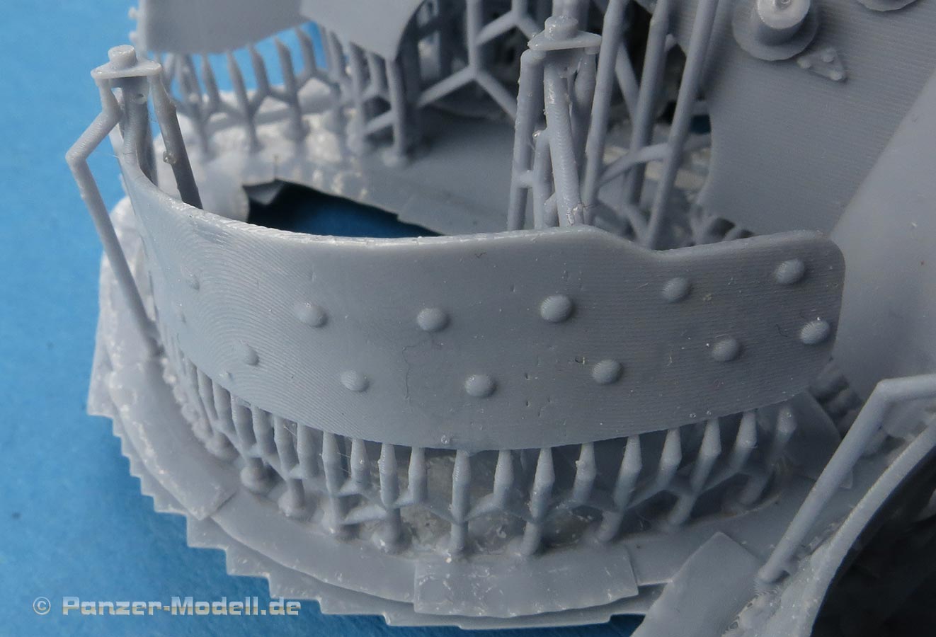 Der Geschützkörper ist einteilig und wird mit dem einteiligen Rohr ergänzt, wie auch Anbauteile wie Sichtmittel, Handräder, Verriegelungen und den Richtschützensitz. Alles fein und sauber gedruckt.
