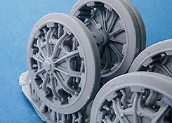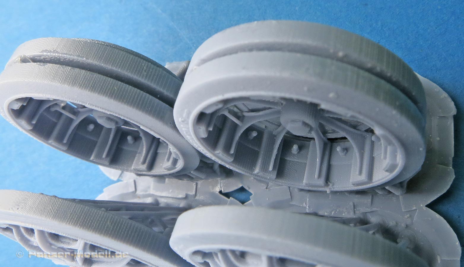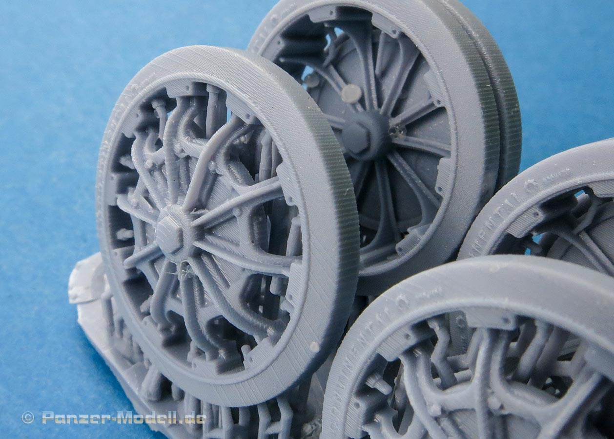 Die Räder sind jeweils einzeln gedruckt, auch die hintere Doppelbereifung und werden einfach auf die Achsen aufgesteckt und verklebt und im Fall der Heckräder an zwei Einsteckpunkten an der Radbasis.