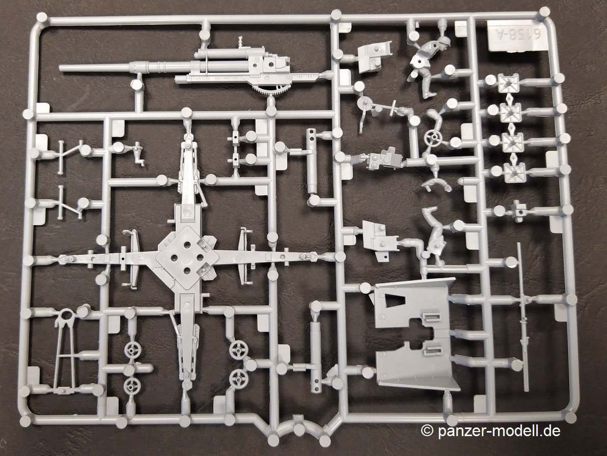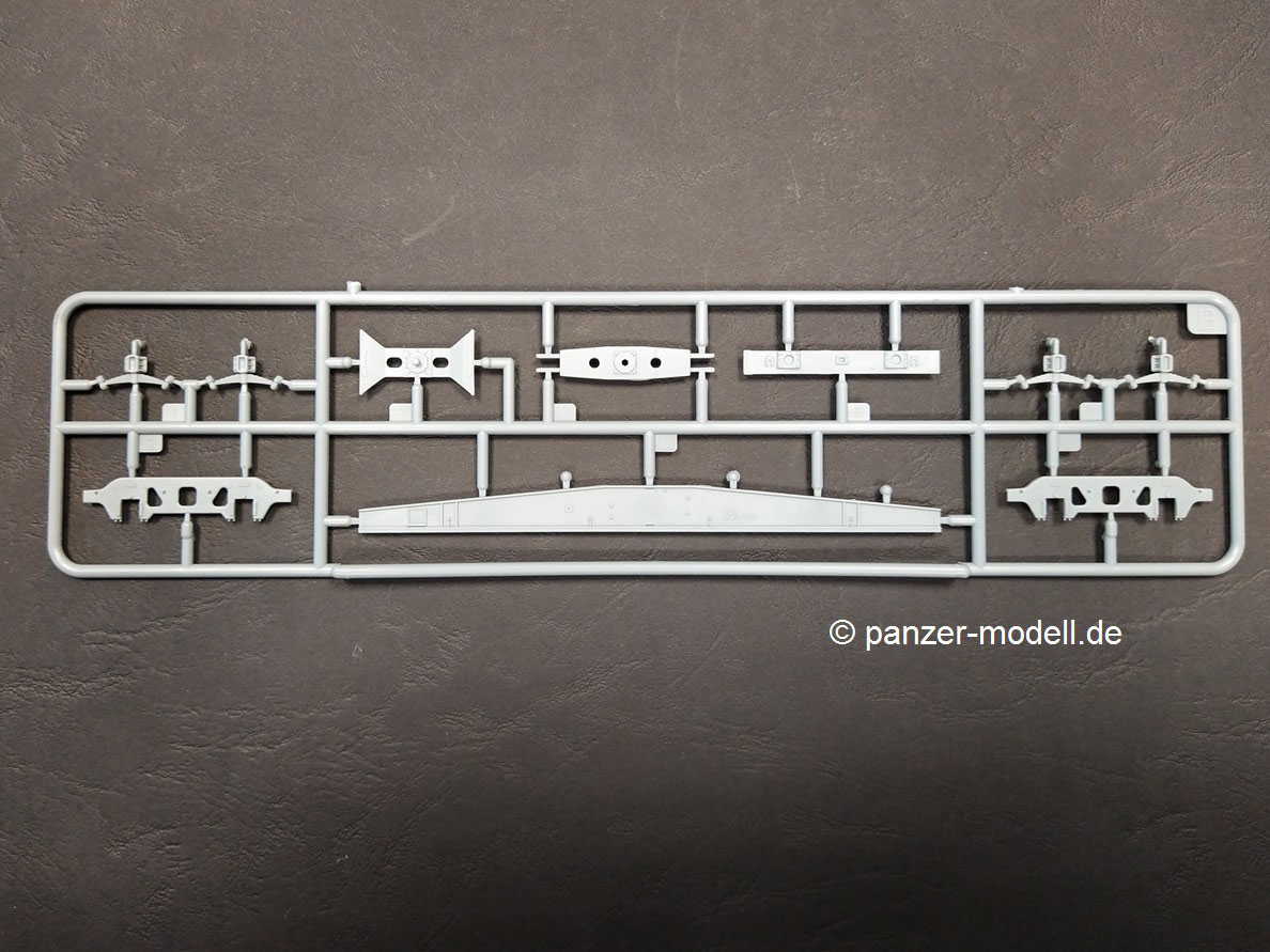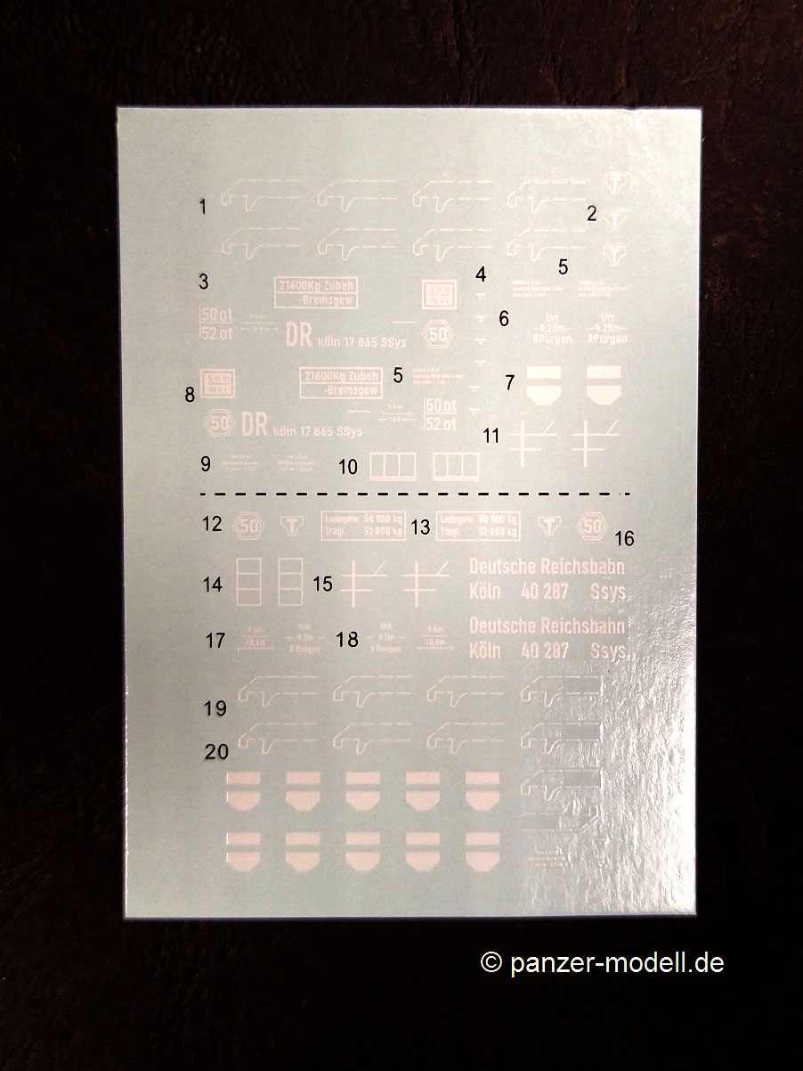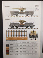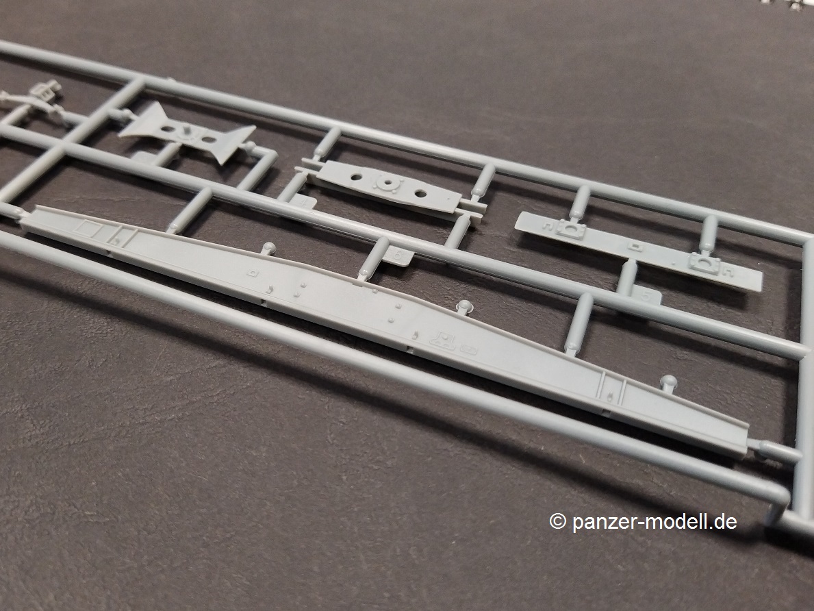 German 88mm Flak 36 mount on SSYS Wagon Der Hersteller T-Model bringt unter dieser Bezeichnung eine Kombination aus Schwerem Plattformwagen 50t SSys mit aufmontierter Flak 36 8,8cm heraus. Den Plattformwagen an sich kann man schon seit einiger Zeit unter der Artikel-Nr. 7304 bekommen. Bei dem beiliegenden Geschütz handelt es sich um einen Bausatz der Firma Zvezda mit der Artikel-Nr. ZV6158. Den Bausatz gibt es in 4 verschiedenen Verpackungsvarianten, die sich durch die Zugabe von Extrateilen wie z.B. Holzdecks oder Metallräder für den Plattformwagen unterscheiden. Hier vorstellen will ich einmal die „Basisversion“. Ein kurzer Abriss zum Original: Beim vorliegenden Modell handelt es sich um einen ab 1942 gebauten vierachsigen Flachwagen mit Gattungszeichen SSys. Diese Bauart war für Ladegewichte von 50t und 60t konstruiert und wurde zum Transport von Militärfahrzeugen genutzt. Er verfügte über ein absenkbares Bremserbühnengeländer, über ein Handrad für die Feststellbremse an jeder Wagenseite, über acht abnehmbare stählerne Rungen und eine Hik Druckluftbremse. Dieser Wagentyp war für eine Höchstgeschwindigkeit von 90 km/h zugelassen und der Drehzapfenabstand betrug 5950 mm. Während des zweiten Weltkrieges bewährten sie sich, so dass sie bis in die 80er Jahre im Einsatz bei der Bahn bzw. Bundeswehr blieben. Die Flak 36 8,8cm ist hinreichend bekannt und wird hier auf dem Plattformwagen direkt mit Hilfe von Teilen Ihrer Kreuzlafette montiert. Für die Verstauung von Munition und Ausrüstung der Besatzung wurden spezielle Vorrichtungen / Kisten auf dem Deck des Plattformwagens aufgebaut. So nun schauen wir uns den Inhalt dieses Bausatz mal genauer an. Ein Blick in den vollgepackten Karton (29 x 19 x 5 cm) offenbart den folgenden Inhalt: