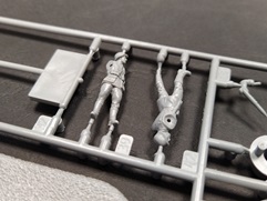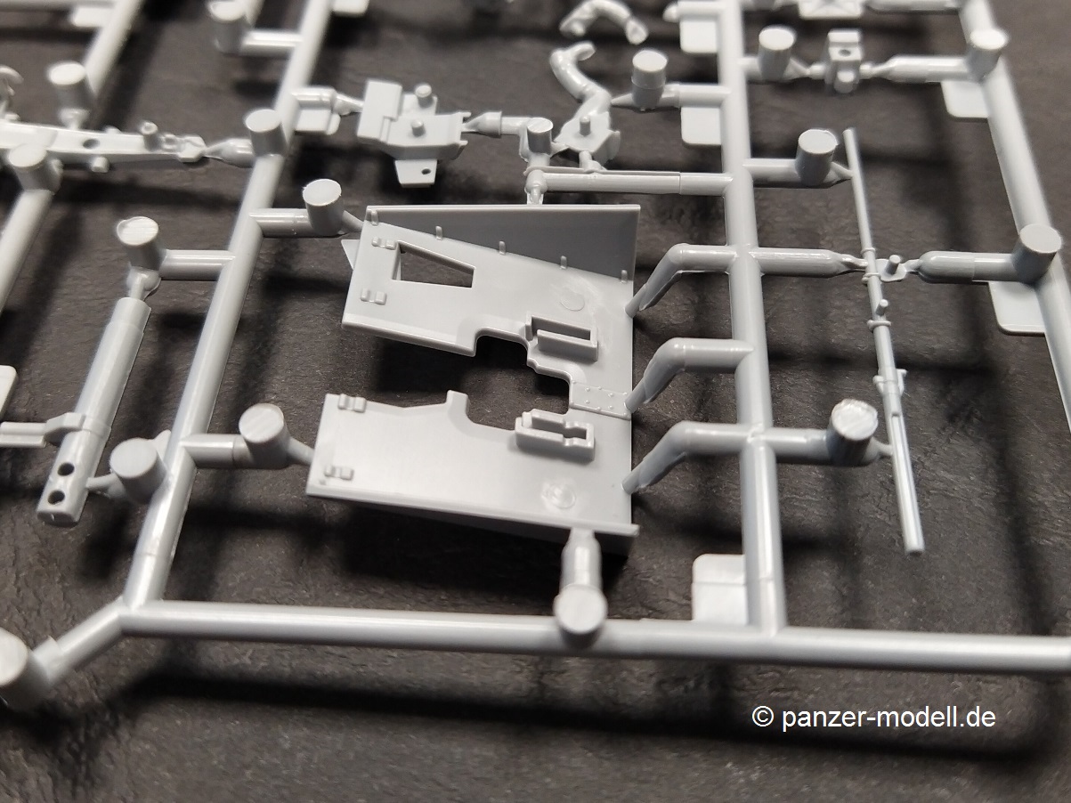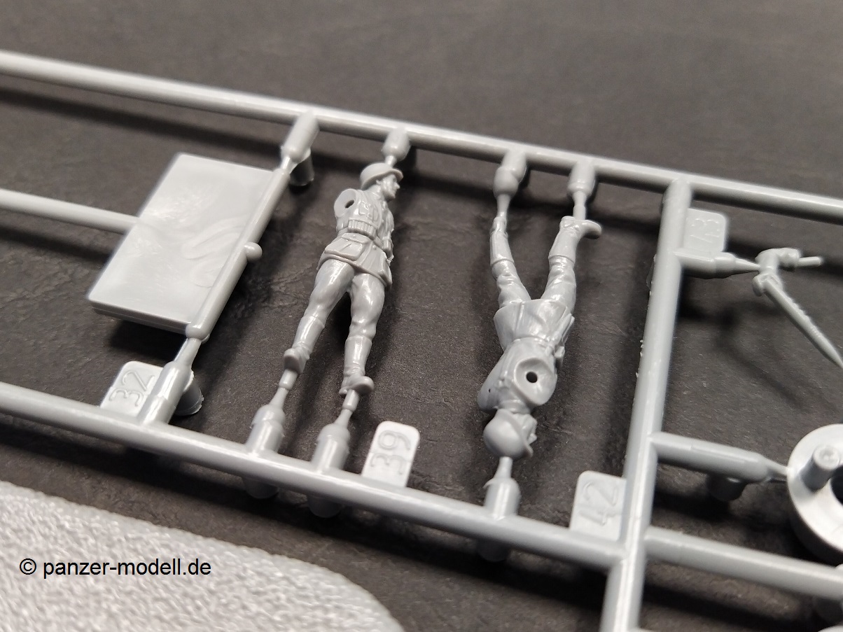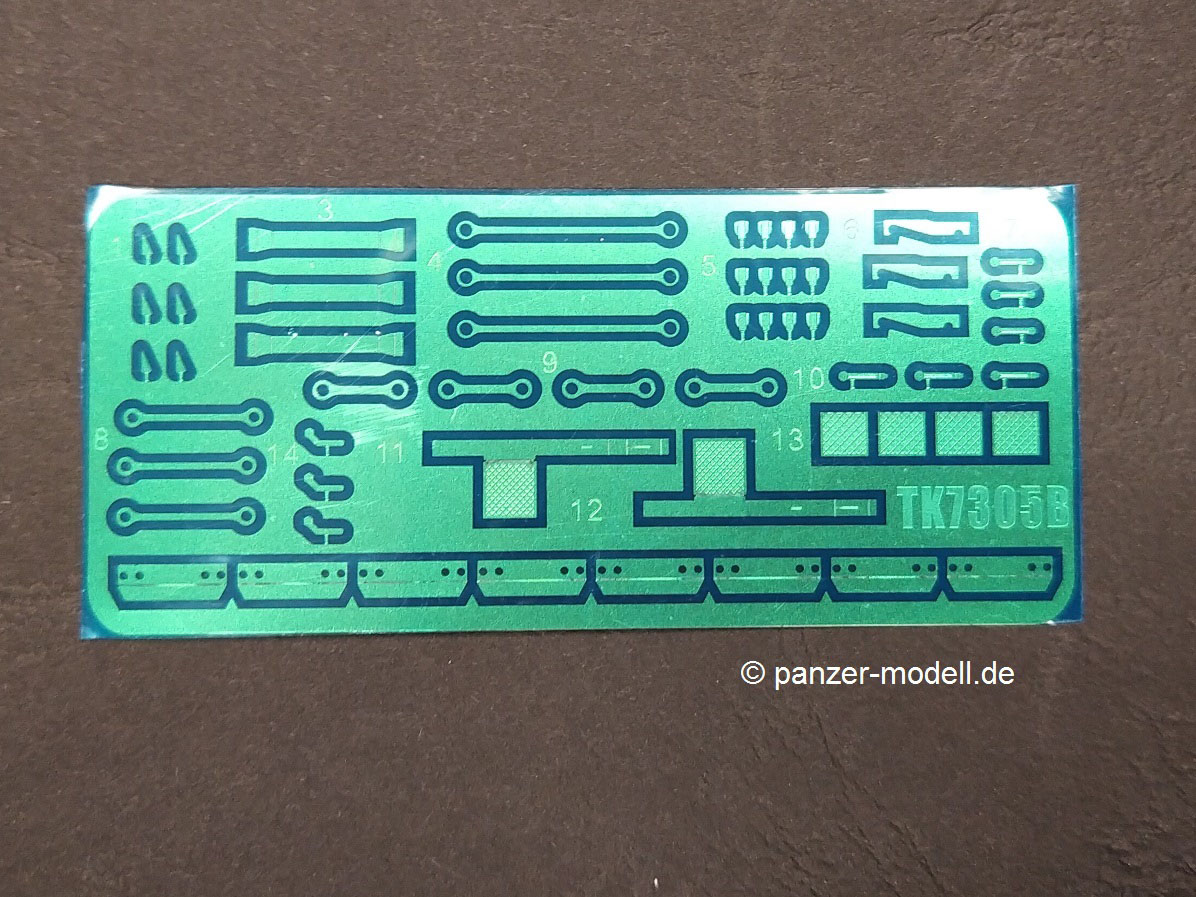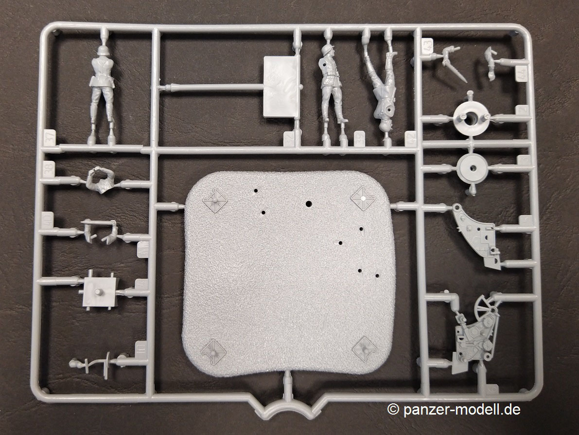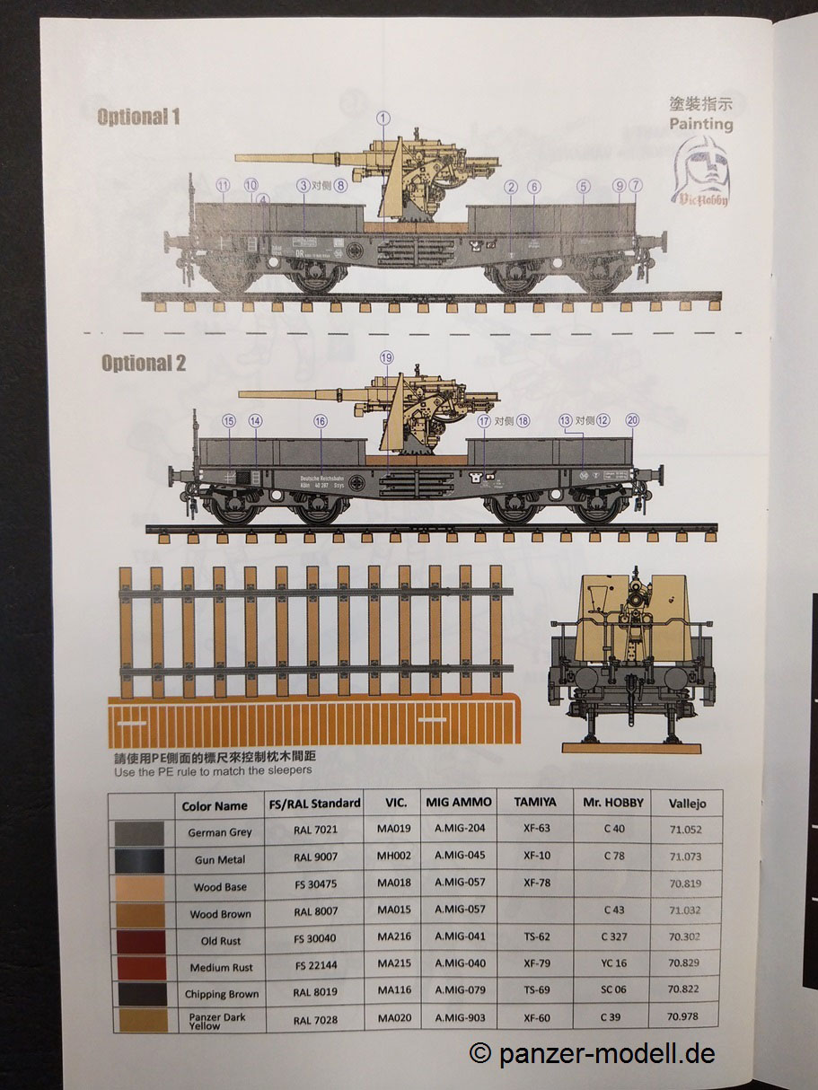 Die Bauanleitung führt Schritt für Schritt in englischer, chinesischer, japanischer teilweise russischer Sprache (Teile der Flak) mit 3-D Zeichnungen durch die 15 Baustufen. Den Anfang macht eine Bauteilübersicht danach folgen die Baustufen 1 bis 9 für den Plattformwagen und die Schienen. Anschließend folgen die Baustufen 10 bis 15 für die Flak nebst Bedienungsmannschaft. Beim vorliegenden Bausatz entfällt die Baustufe 10 durch die nicht beiliegenden Ätzteile für das Flak-Schild. Den Abschluss bildet eine farbige Darstellung der zwei Markierungsvarianten. Die Farbangaben am Ende der Bauanleitung nennen neben den Originalfarben (FS/RAL Standard), Angaben zu den Herstellern VIC, MIG Ammo, Tamiya, Mr. Hobby und Vallejo. Was in der Bauanleitung leider fehlt ist die Darstellung der Anbringung der Kreuzlafette auf dem Plattformwagen. Hier muss selbst die „Mitte“ gefunden werden. Eine Markierung auf dem Ätzteildeck des Plattformwagens wäre hier sicherlich hilfreich gewesen. Die in grauem Kunststoff gespritzten Teile von T-Model für den Plattformwagen und Zvesda für die Flak sind durchweg fein detailliert. Alle Teile haben kleine gut gewählte Angüsse und keine nennenswerten Auswerfermarken auf später sichtbaren Stellen. Sämtliche Bauteile weisen keinen Versatz auf, teilweise sind nur leichte Grate vorhanden, die den positiven Gesamteindruck aber nicht stören und leicht versäubert werden können. Der Aufbau des Plattformwagens weiß durch die Kombination aus Spritzgussteilen für die stabilen Bereiche und Ätzteilen für die filigraneren Teile durchweg zu gefallen. Hier sei das Deck des Plattformwagens oder die Aufhängung der Achsen aus einem Ätzteil genannt. Dadurch wird ein hoher Detailgrad des fertigen Modells erreicht, der dem ansonsten im Original doch sehr „einfachen“ Plattformwagen detailreich dastehen lässt. Das Kanonenrohr der Flak ist als Kunststoffteil einteilig ausgeführt und muss somit nicht aufwendig verspachtelt werden. Lediglich die Rohröffnung fehlt und muss selbst durch Aufbohren hergestellt werden. Durch die beiliegenden Schienen nebst dazugehörigen Schwellen (mit leichter Holzmaserung) lässt sich dieser Bausatz reizvoll in einem Diorama in Szene setzen. Mein Fazit: T-Model bringt in dieser Zusammenstellung des eigenen Plattformwagens mit dem Flak-Bausatz von Zvesda eine reizvolle Kombination heraus , die sicher das ein oder andere Diorama verschönern wird. Der Preis von derzeit 32,50 € geht für den vorliegenden Bausatz, der ja eigentlich aus zwei Bausätzen besteht i.O. Man bekommt für diesen Preis ja schließlich den eigentlichen Plattformwagen, die notwendigen Schienen, die Flak und 4 passende Figuren und das ganze abgerundet mit sinnvollen Ätzteilen für den Plattformwagen. Die Detaillierung der Bauteile und der grundsätzliche Aufbau des Bausatzes lassen viel Bastelspaß erwarten. Der Umfang der Ätzteile ist zwar beträchtlich aber trotzdem auf das nötigste begrenzt. Da viele auch teils sehr kleine Bauteile (Ätzeile) zu verarbeiten sind, ist der Bausatz eher für den fortgeschrittenen Modellbauer zu empfehlen.
