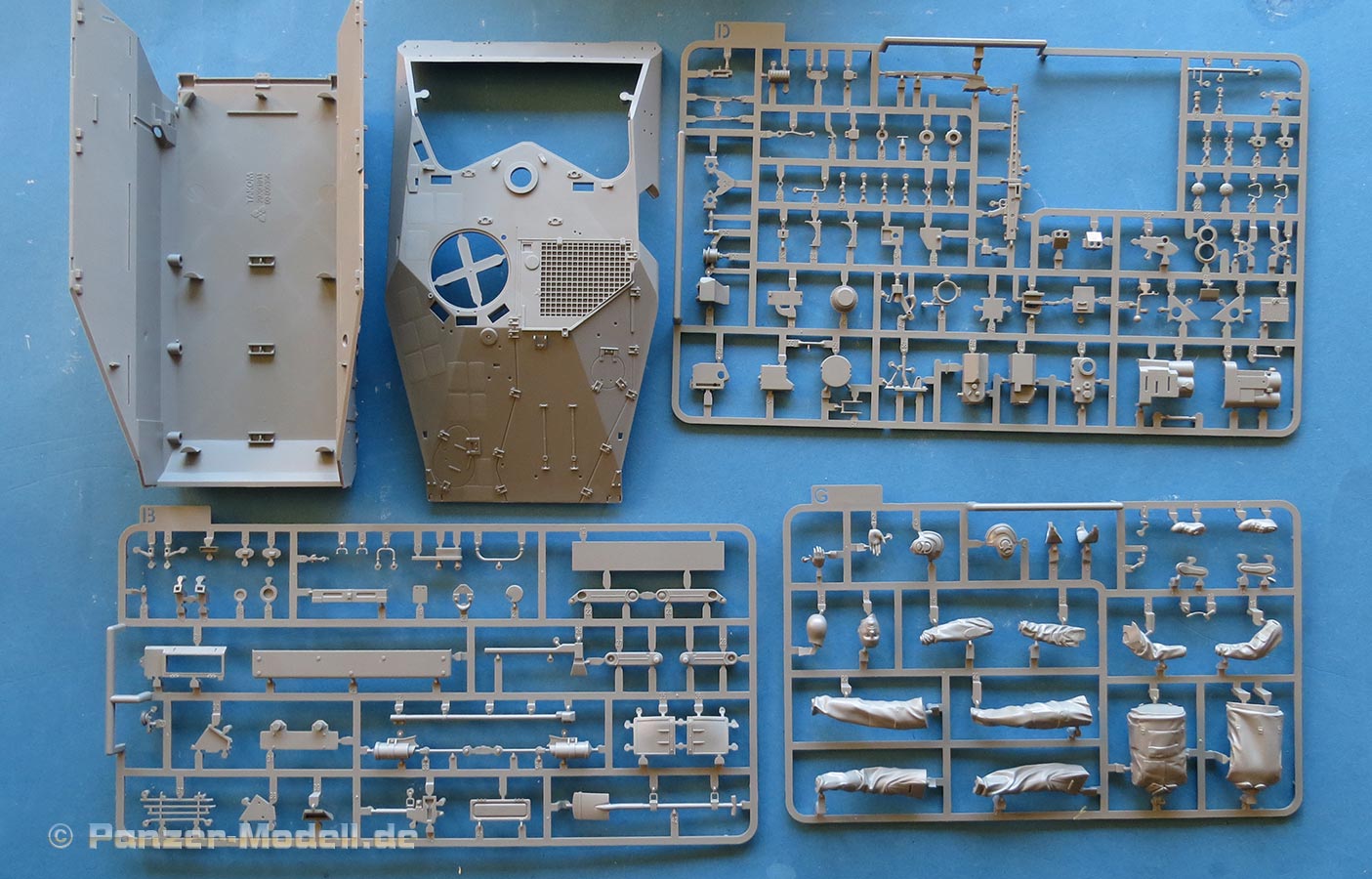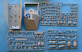 Im recht großen Karton finden wir nun also 11 grauen Spritzlinge, die Unterwanne, Oberwanne, eine PE Platine und ein Decalbogen.