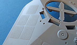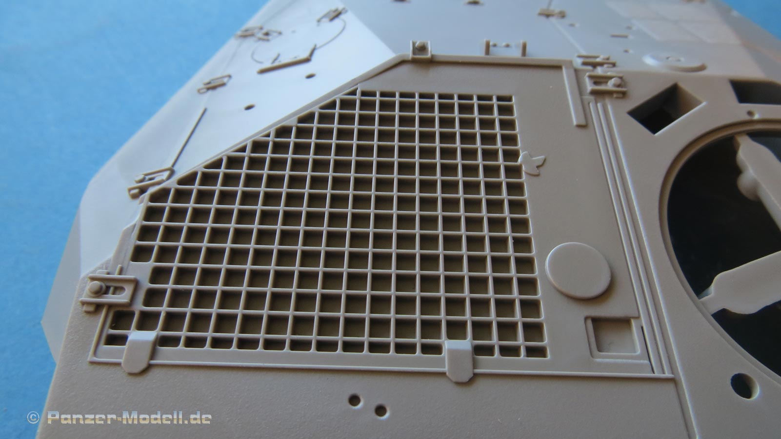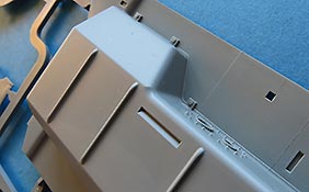 Die Deckplatte der Wanne ist einzeln ausgeführt mit schönen Details. Luken sind alle offen oder geschlossen baubar, das oben aufliegende Motorluftgitte ist zwar nicht durchbrochen, aber entsprechend tief und sehr filigraf gespritzt, dass es echt hevorragend aussieht. Das seitliche Lüftergitter besteht aus einem PE Inlay und einem aussenliegenden Grätig aus Plastik - sieht gut aus, ABER sollte man die Luken offen haben, sieht man hier definitiv ist erleutete Leere der Wanne. Und da kommen wir zu einem Knackpunkt des Bausatzes, denn die Wanne ist absolut leer - keinerlei Inneneinrichtung - kein Motorraumtrennwand, keine Sitzem keine Bedieninstrumente - und das ist bei einem Fahrzeug mit so großen Luken und einer beiliegenden Figur wirklich schade. Auf der anderen Seite hätte das Modell mit Inneneinrichtung nicht zu diesem jetzigen Preis realisiert werden können und viele brauchen einfach keien Inneneinrichtung. Aber schade ist es schon.