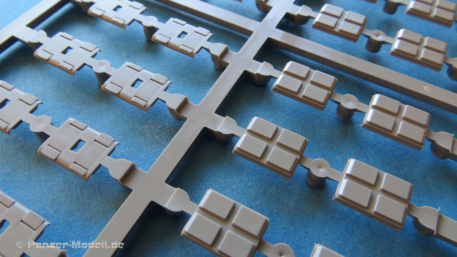 Denn die Einzelgliedkette lässt sich ebenfalls beweglich bauen. Diese setzt sich aus dem Unterteil der einzelnen Kettenglieder, dem Oberteil, den Doppelbolzen mit Endverbindern und den Kettenführungszähnen zusammen. Bei vorsichtigem Umgang mit dem Kleber bleiben die Ketten eunderbar beweglich. Die Vielzahl der Teile klingt erstmal erschreckend, aber die Bauweise auf einer Bauhilfe erleichtert den Zusammenbau ungemein. Erwähnt sein an dieser Stelle, dass es sich natürlich um die Stahl Endverbinder Kette mit neuem Treibrad handelt, die die Wiesel seinerzeit nach Ablösung der Gummi-Endloskette erhalten haben (mit der es wohl ein paar böse Unfälle gab).
