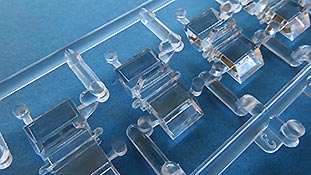 Die Scheinwerfer sind hohl ausgeführt und können mit den transparenten Linsen realistisch ausgefüjhrt werden - wobei die Linsen etwas trüb aussehen. Dabei sind diw Winkelspiegel, die am transparenten Spritzling sind, hammermäßig superklar und scharf gespritzt sind.