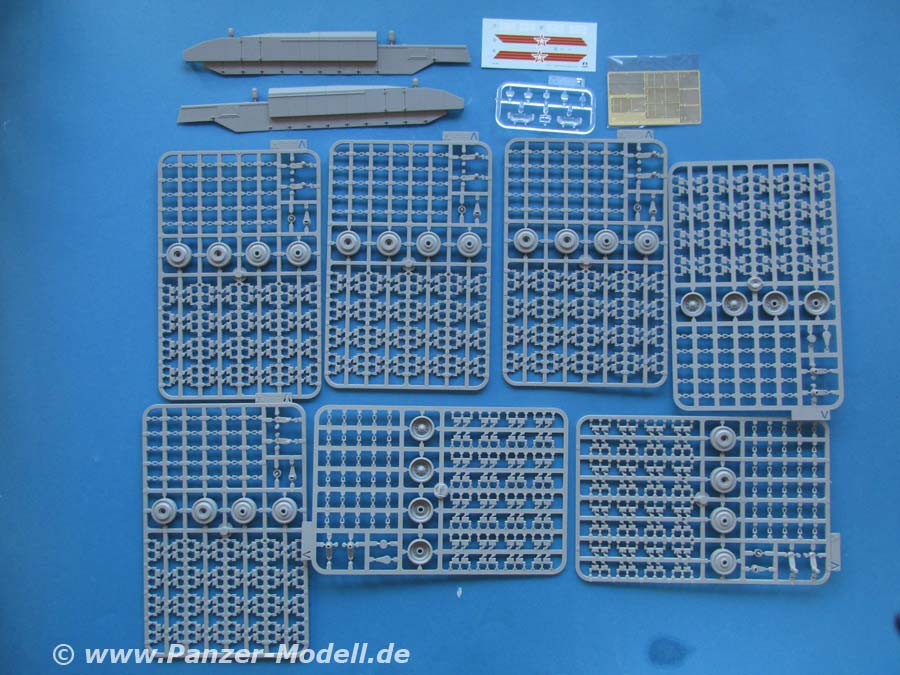 Im Karton finden wir insgesamt 11 graue Spritzlinge, ein klaren Spritzling, die Unterwanne, die Oberwanne, das Turmoberteile, die beiden Schürzenteile, Polycaps, eine Platine PE Teile und ein Decalbogen.