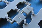 Die Ketten werden aus Einzelkettengliedern zusammengesetzt. Diese einzelnen Glieder werden geklebt und bleiben nicht beweglich. Die Details an den Gliedern sind wirklich sehr sehr gut - die versenkten Sechskantschrauben innen, die Endverbinder und die Gummiblöcke in gut gestalteten Metallhalterungen auf der Aussenseite. DIe Führungszähne sind offen und müssen einzeln auf jedes Glied geklebt. Insgesamt optisch ein echtes Highlight.
