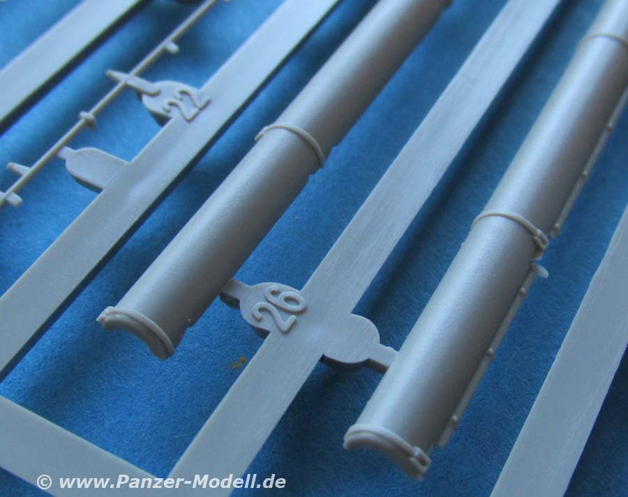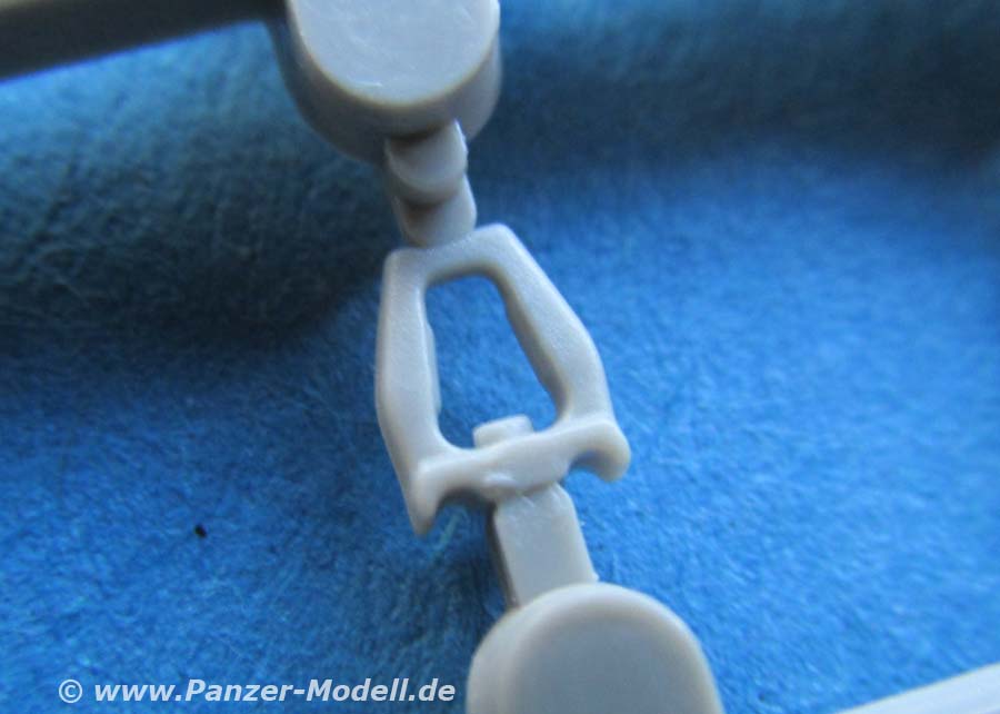 Der Guss ist ganz ausgezeichnet mit feinen, sauberen Details an den Teilen. Dazu weder Versatz, noch Fischhäute oder Grat, keine Sinkstellen, dafür aber scharfe Details und sinnvoll aufgeteilte Bauteile. Was ein wenig wundert und auffällt, ist das Erscheinungsbild der Spritzlinge, die statt runder Gießastrahmen flache, platte Gießastrahmen haben. Völlig unerheblich für die Teile, aber irgendwie seltsam anzusehen.