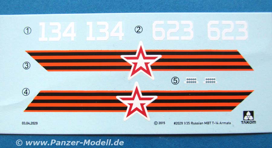 Die Decals sind übersichtlich und umfassen 2x 2 Turmnummern und die Paradenmarkierungen des Aramata aus dem mai 2015.