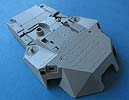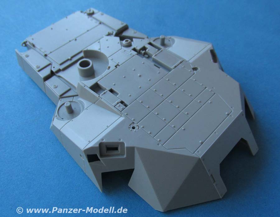 Auch die Oberwanne ist einteilig und mit wirklich schönen Details wie Schraubenköpfen, Zusatzpanzerblöcle, Lüfterlamellen, etc. versehen. Die beiden Luken in der Fahrzeugfront sind offen und können daher auch mit offenem Deckel gebaut werden.
