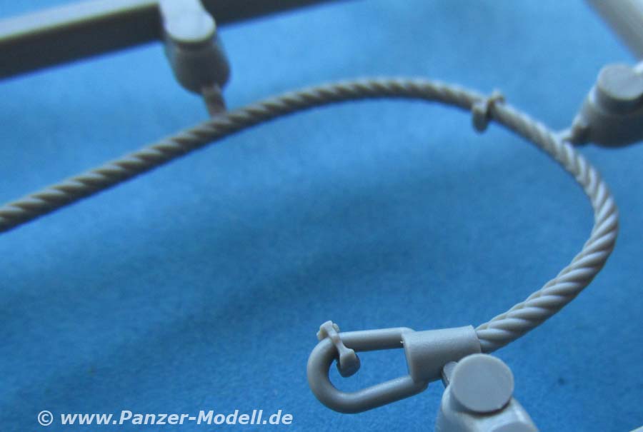 Ansonsten gibt es relativ webig zusätzliche Anbauteile auf der Wanne - die4 Abschleppseile sind komplett mit Kauschen und Halterungen als Spritzgussteile mit sehr toller Struktur und Detaillierung widergegeben.
