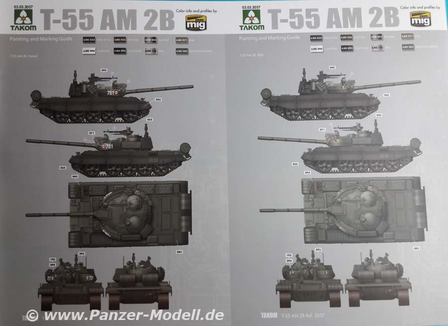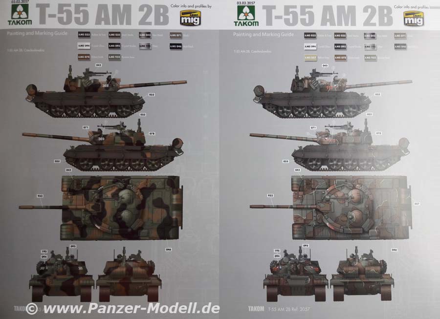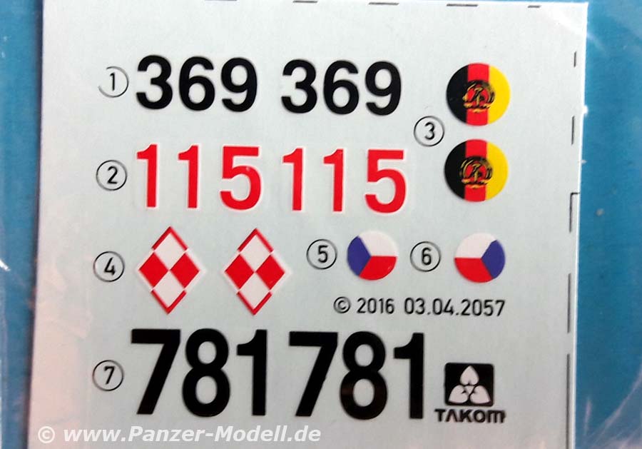 Zum Modell: Basierend auf seinem sehr guten Modell des T-55AM hat Takom hier nun die in Tschechien produzierte Variante geschaffen. Für diese liegt das korrekte Motordeck bei. Die Bauteile machen einen hervorragenden Eindruck. Der Guss ist sauber ausgeführt und Fischhäute sucht man vergebens. Es sind viele filigrane Details umgesetzt, was zum Beispiel auf die Treibstoffleitungen an den Außentanks auffällt, diese wurden bei anderen Herstellern nicht berücksichtigt. Für die DDR Version liegen auch die typischen Unterlegkeile bei, welche aus Plastik und PE-Teilen selber zusammengebogen werden müssen diese sind dann vorbildlich dünn. Die Ketten sind bereits in Beuteln verpackte, versäuberte Einzelgliederketten - vorbildlich. Es liegen einige sinnvolle Ätzteile bei, wie zum Beispiel die Lüftergitter. Auch die Grabbelkiste wird sich über Zuwachs freuen, da viele Teile der anderen Versionen beiliegen, wie zum Beispiel Kanonenrohre und Fahrerlukendeckel. Die Bauanleitung ist klar gegliedert und führt schnell zu einem Ergebnis. Als Bemalungsoptionen sind Fahrzeuge aus Tschechien, der DDR und Polen angegeben, wobei die polnische Version aus dem Kasten wohl so nicht zu bauen ist, da diese sich doch noch von den Versionen der anderen Nutzerstaaten unterschied. Mein Fazit: Ein sehr schöner Bausatz diesen wichtigen Kampfpanzers des Warschauer Paktes. Absolute Kaufempfehlung