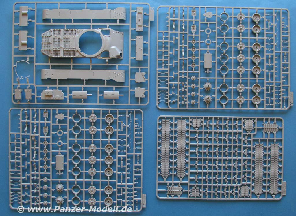 Der gut gefüllte Karton des Bausatzes enthält 7 graue und einen transparenten Spritzling, die Unterwanne, Turmober- und unterteil, Kettenmontagehilfen und ein Decalbogen.