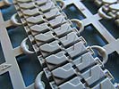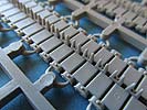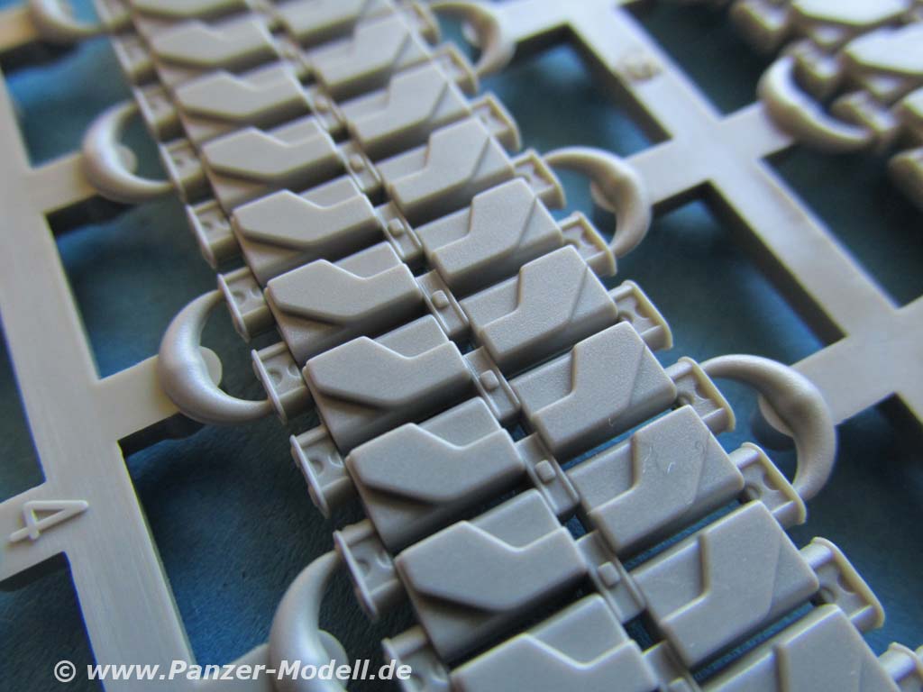 Denn im Bausatz ist eine Segmentkette enthalten - zugegebenermaßen eine wirklich sehr gute und fein detaillierte, aber durch die festen Stränge eben für die Unterseite nicht anpassbar. Die Details an den Segmenten und den Einzelgliedern ist wirklich aussergewöhnlich gut und selbst die Endverbinder sind sehr gut und fein dargestellt. Auf der Innenseite finden sich ein paar feine Reste von Auswerfermarken, die aber wirklich minimal sind und sich schnell entfernen lassen sollten. Die Aussenseiten stellen gut und korrekt die gewinkelte aufgalvanisierte Gummierung der Originalketten dar. Und bei den Einzelgliedern, die um die Leit und Treibräder gehen hat Takom tatsächlich berücksichtigt, dass End- und Mittelverbinder mit Führungszähnen angewinkelt dargestellt sind.